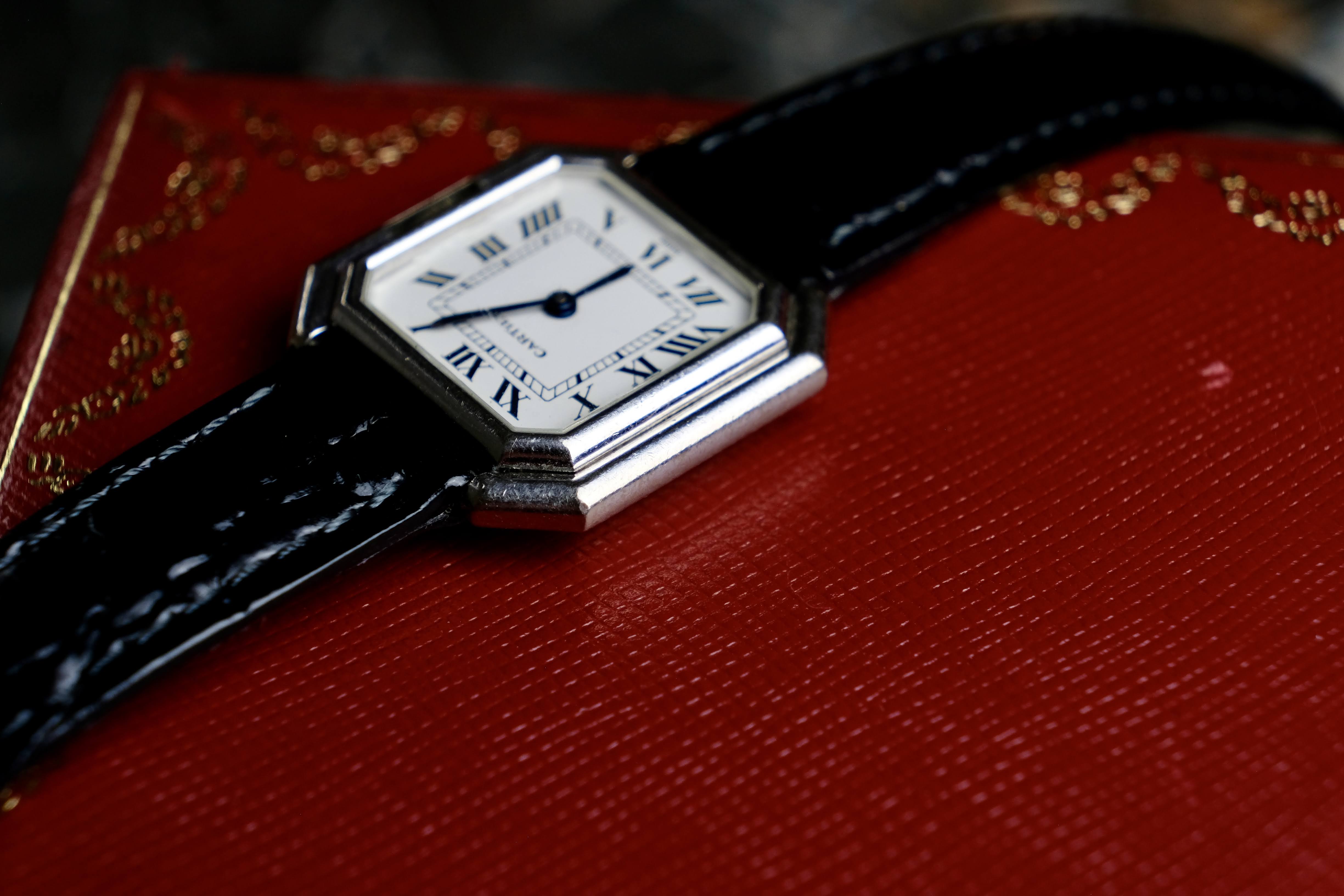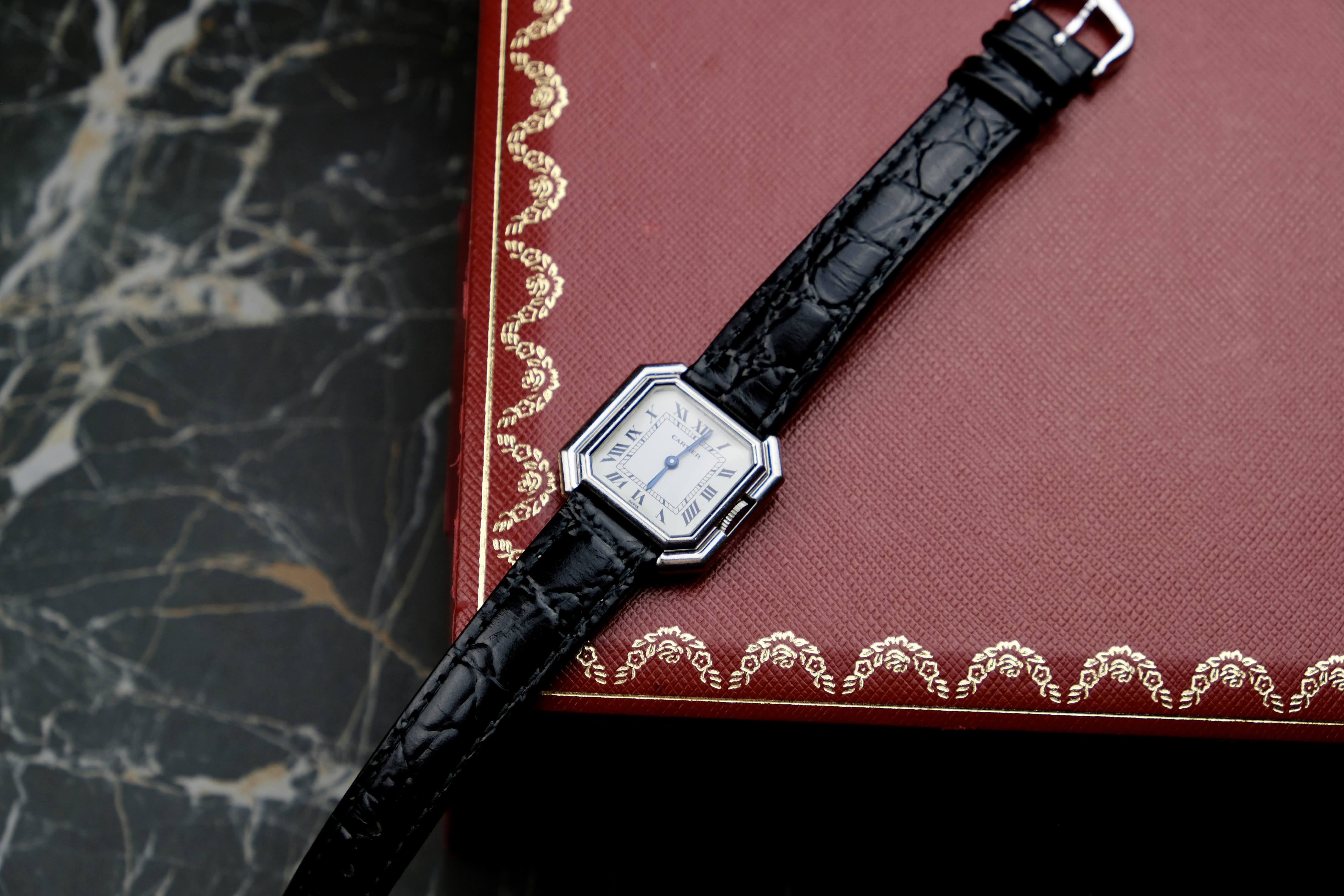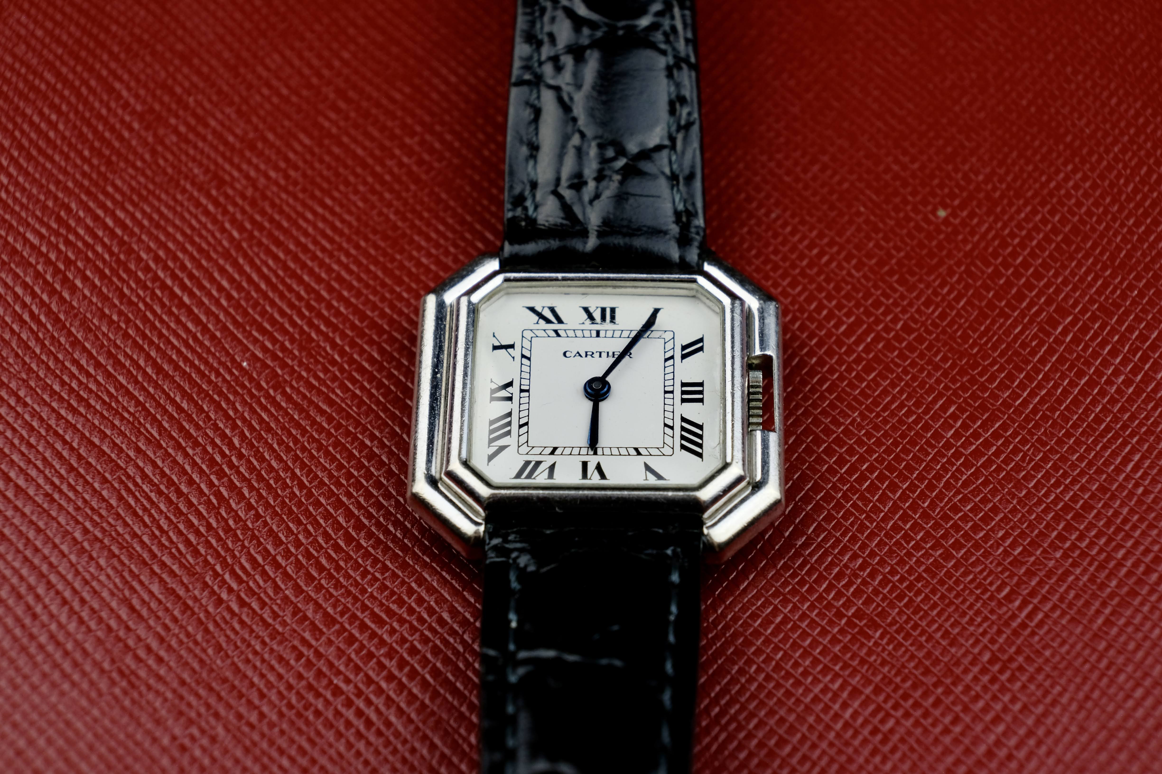Up for sale comes a special Cartier Ceinture: This 78100 was made out of whitegold, which is super rare, because only few Cartiers were made out of white gold. Measuring 25mm in height and width, this watch can be worn my women and men.