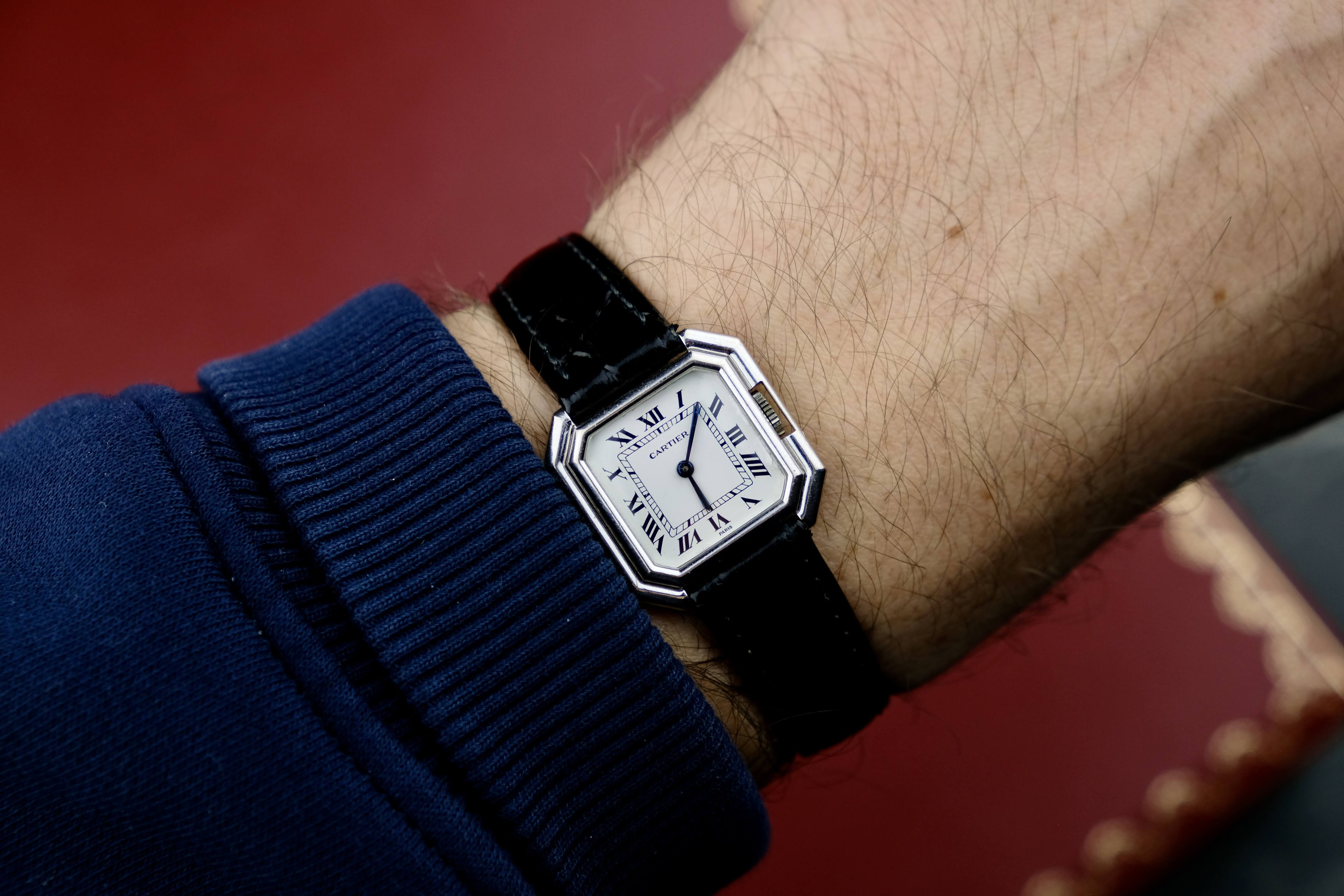 The case of of the watch has marks and scratches, but nothing deep. The dial shows patina towards the edges, but is overall very nice. The hands are showing patina, the crystal has little scratches. It comes on a white gold plated bin buckle and a long strap making it possible to wear it by men as well. You will get the watch freshly serviced in our travel case.