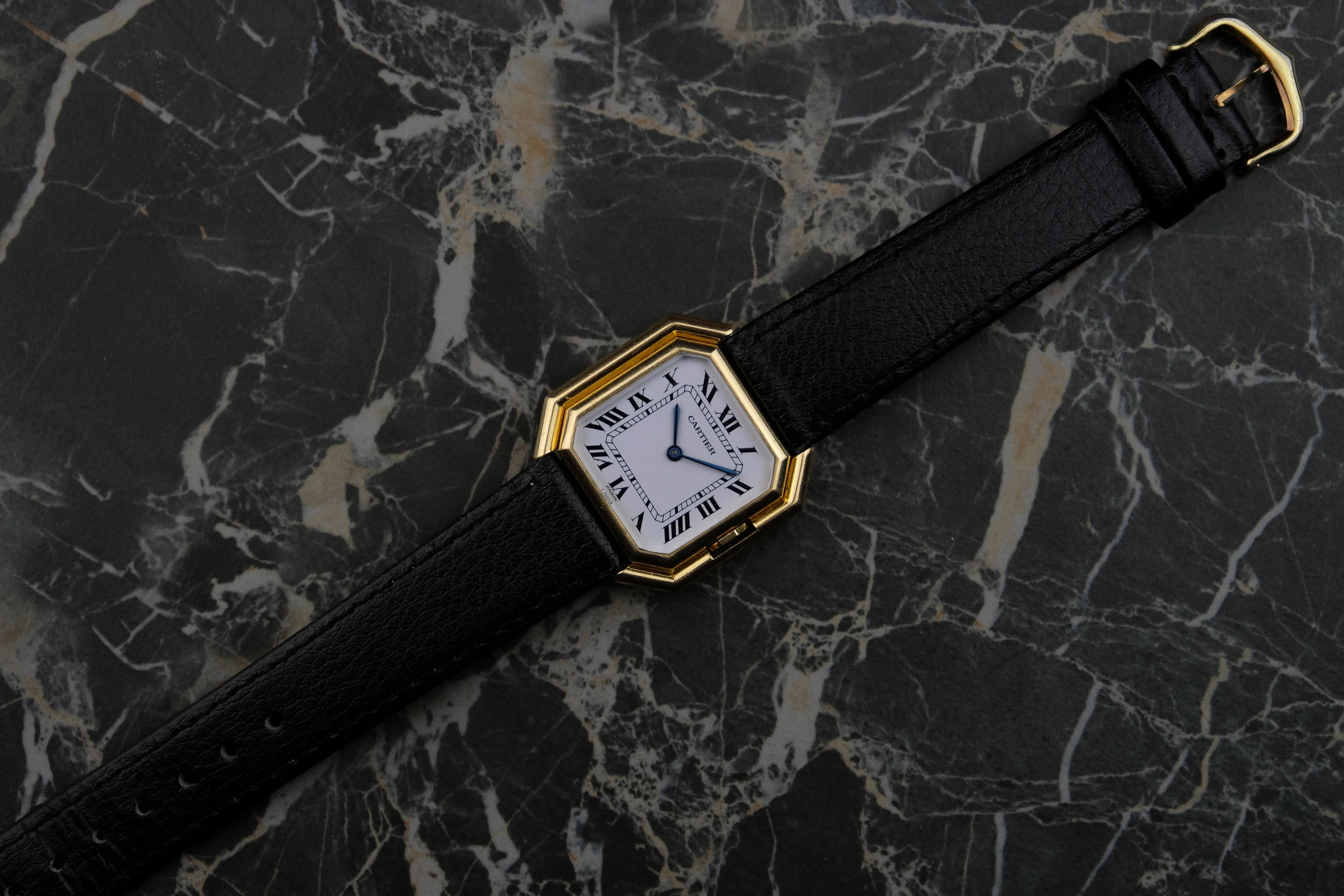 The watch has scratches and signs of wear but nothing deep, it is sharp and well preserved. The crystals is free of scratches. The crown is sharp and good as well. The dial is very clean and the hands carry a nice patina. The watch comes serviced on a gold plated Cartier pin buckle in our travel case.
