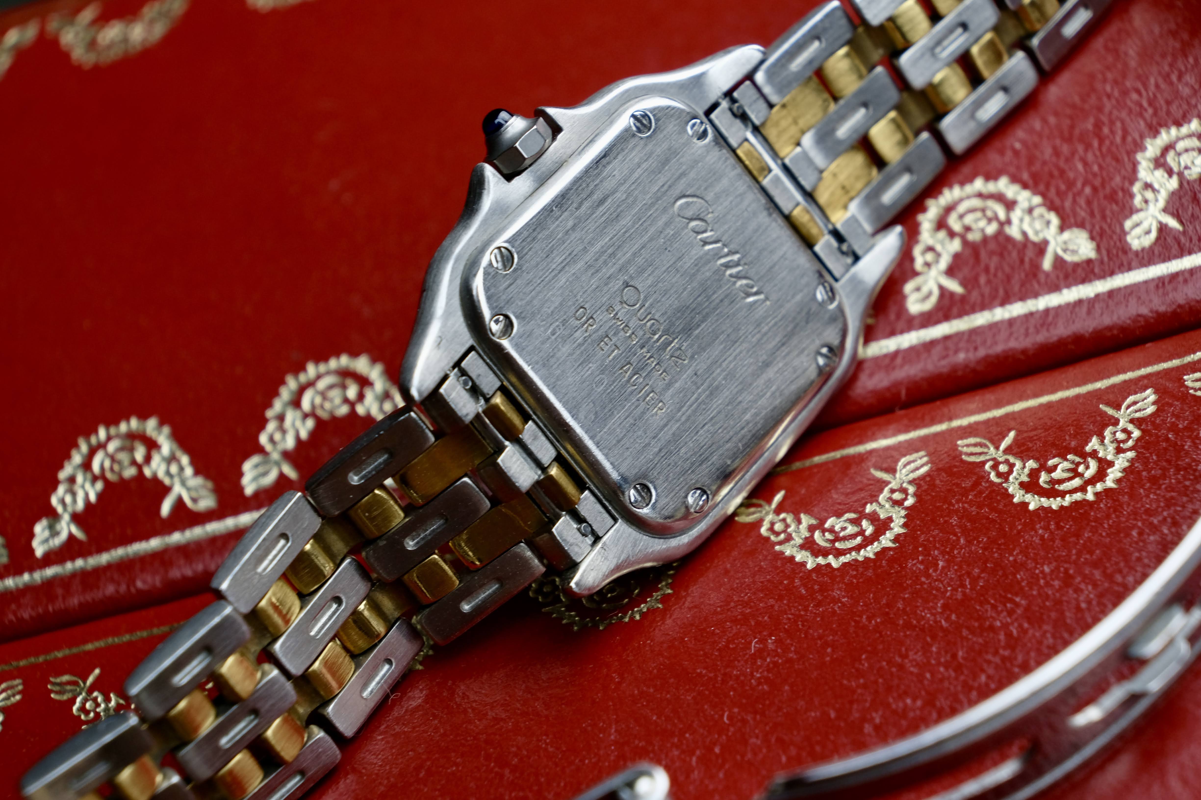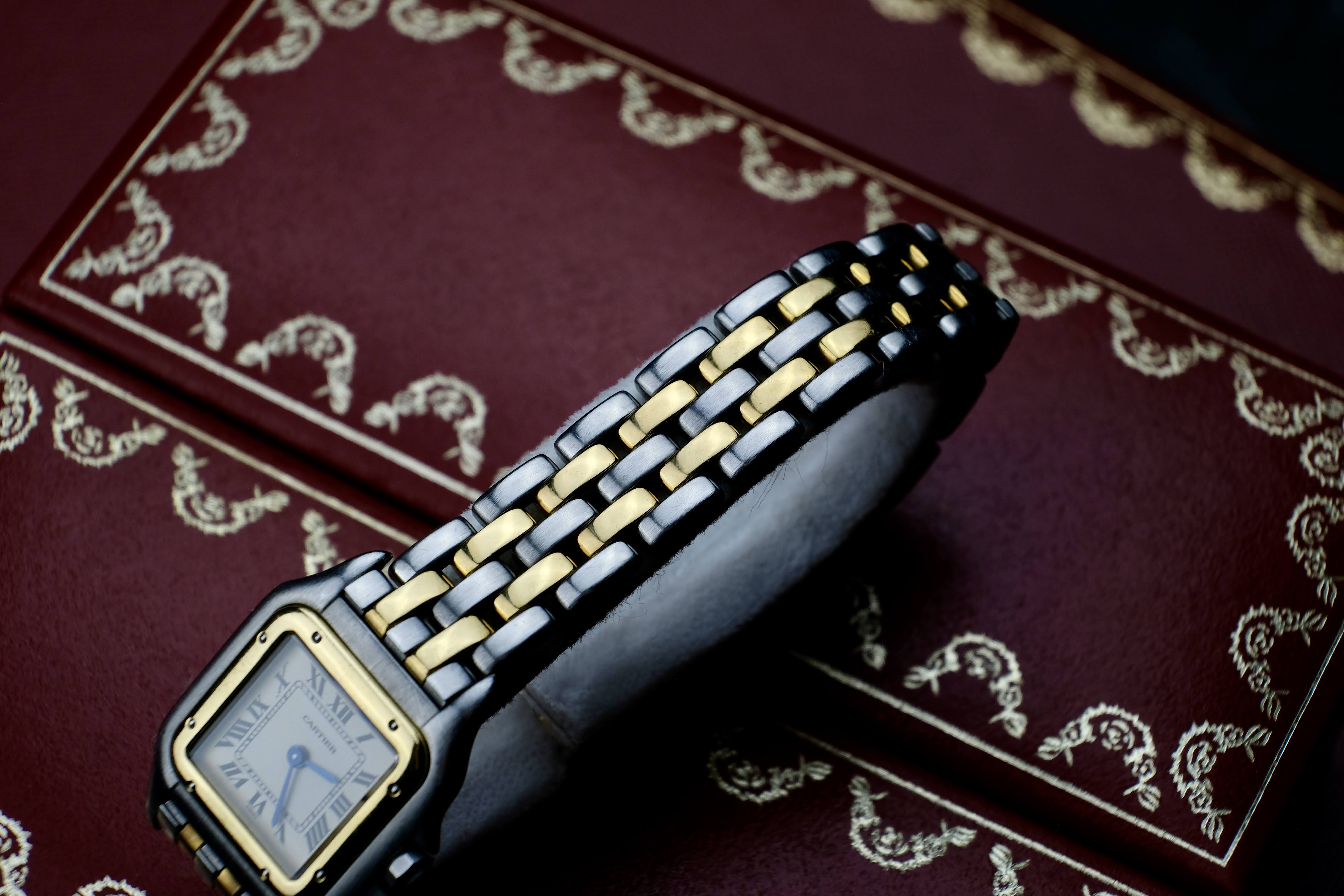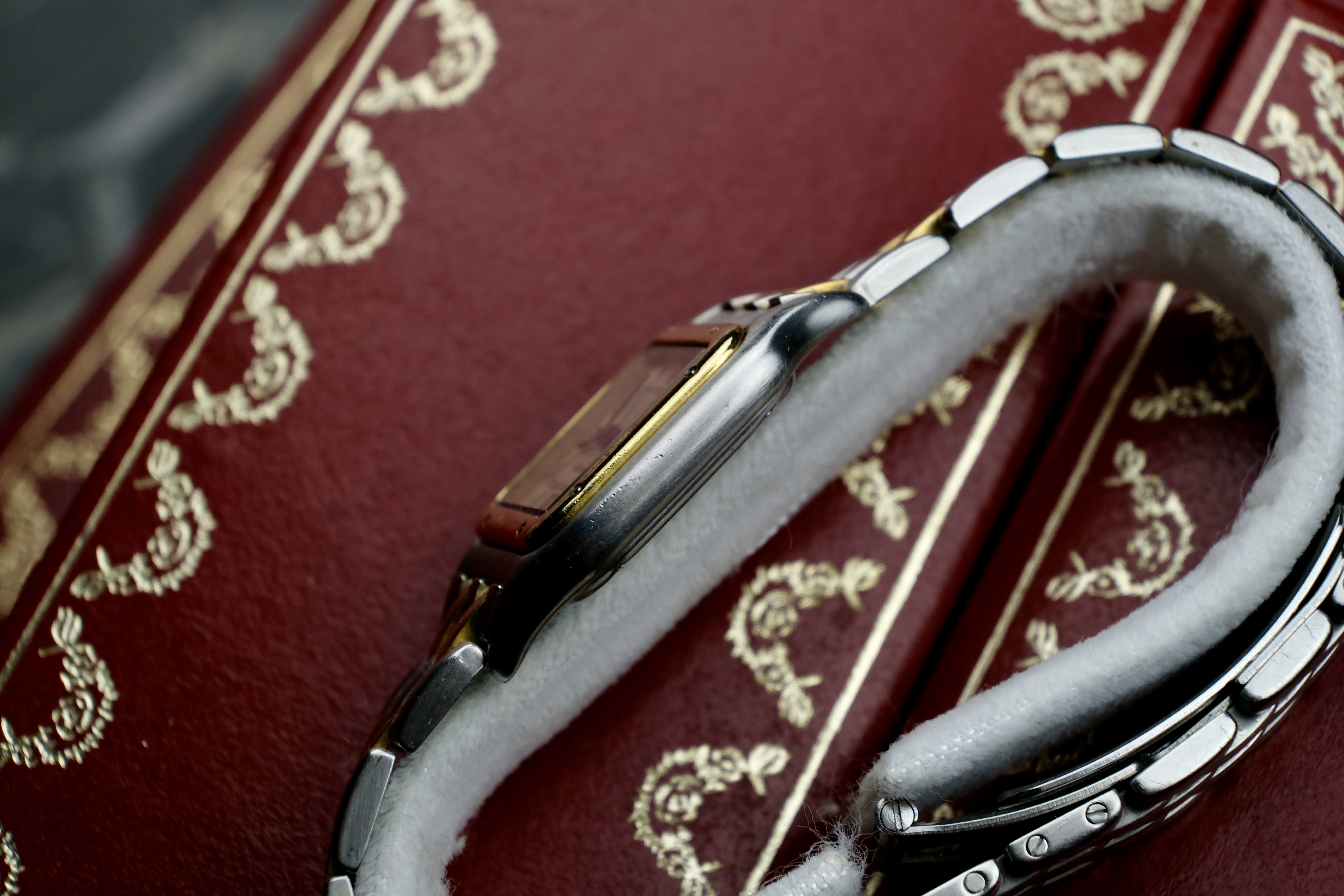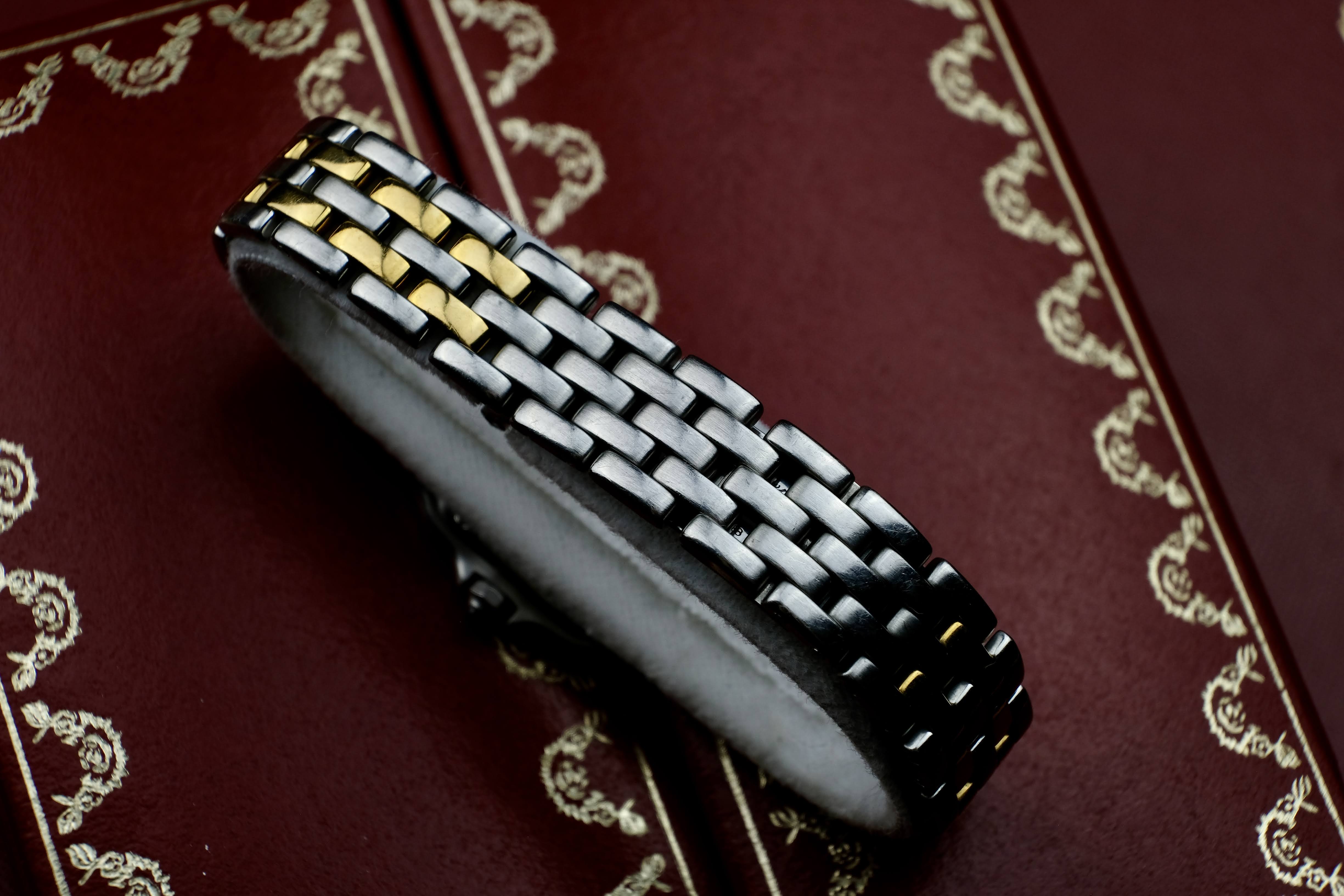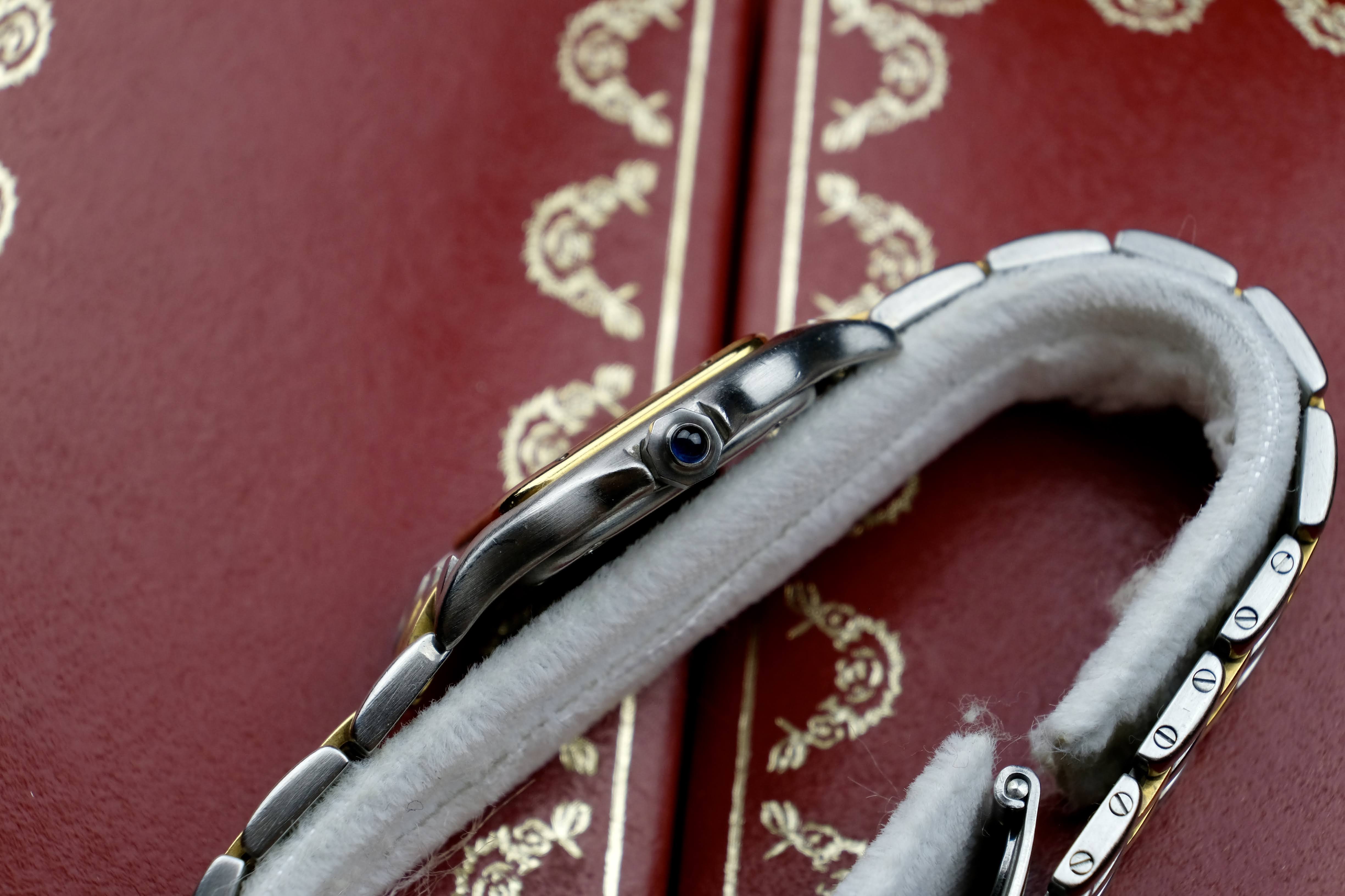 The watch is in overall good condition, but has been worn and loved in the past. The dial is clean and so are the hands, the bracelet and case are carrying signs of wear and little scratches. The crystal is clean. The bracelet closes tight and has not much stretch. You will get the watch with a fresh battery and the original Cartier box.