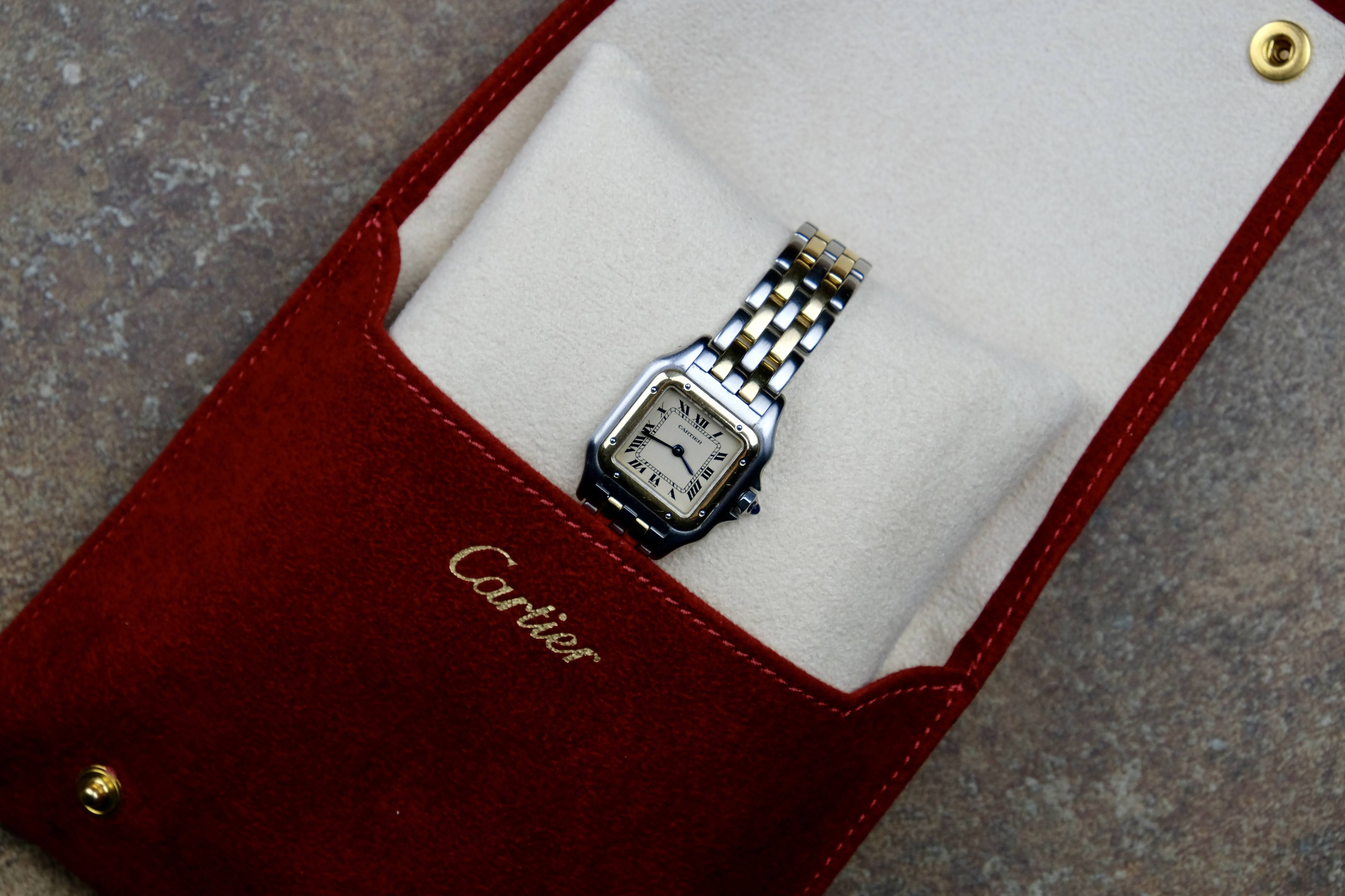 The watch is in overall good condition, but has been worn and loved in the past. The dial is clean and so are the hands, the bracelet and case are carrying signs of wear and little scratches. The crystal has little scratches as well, which do not fall into the eye a lot. The bracelet closes tight and has not much stretch. You will get the watch with a fresh battery and a Cartier travel case.