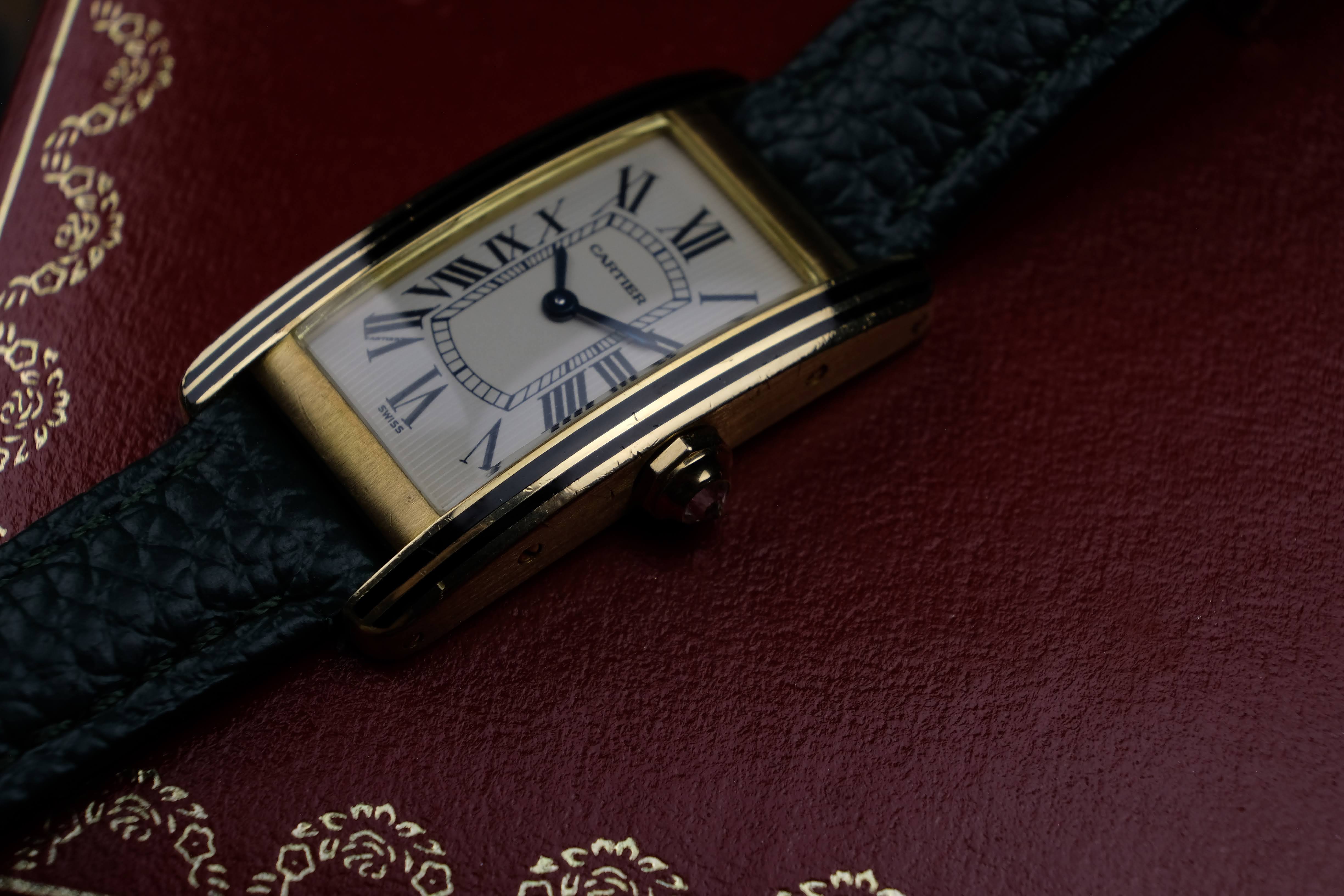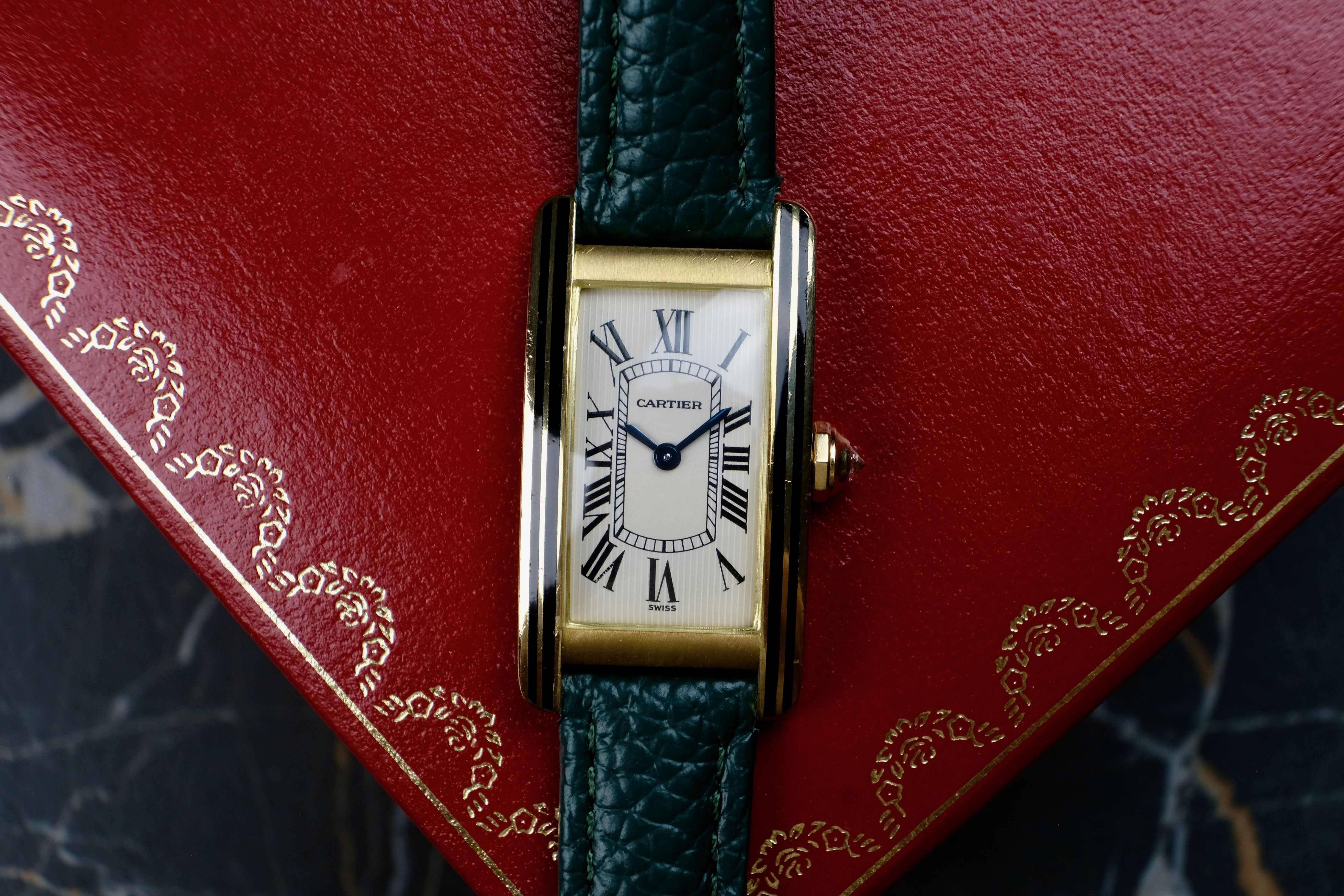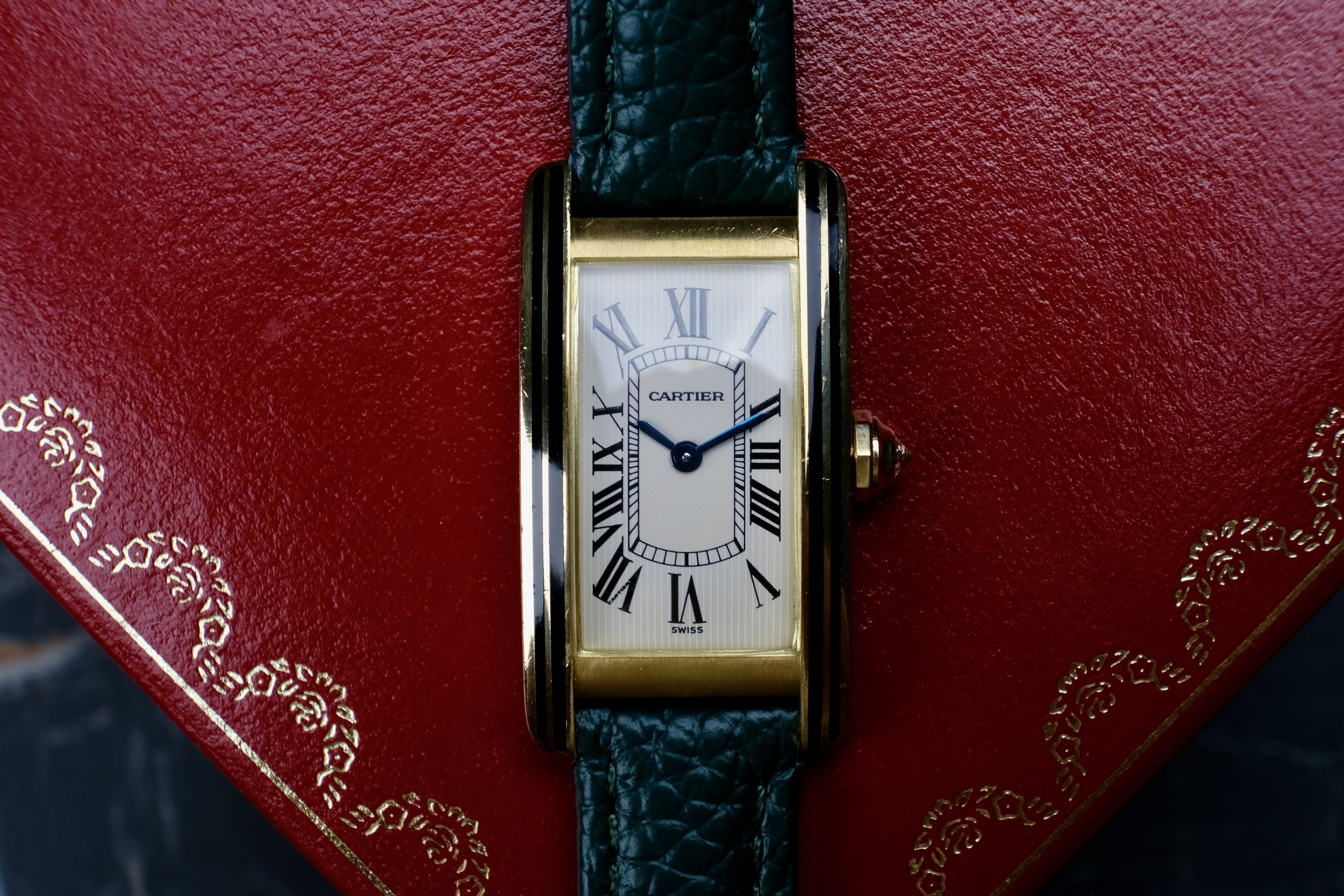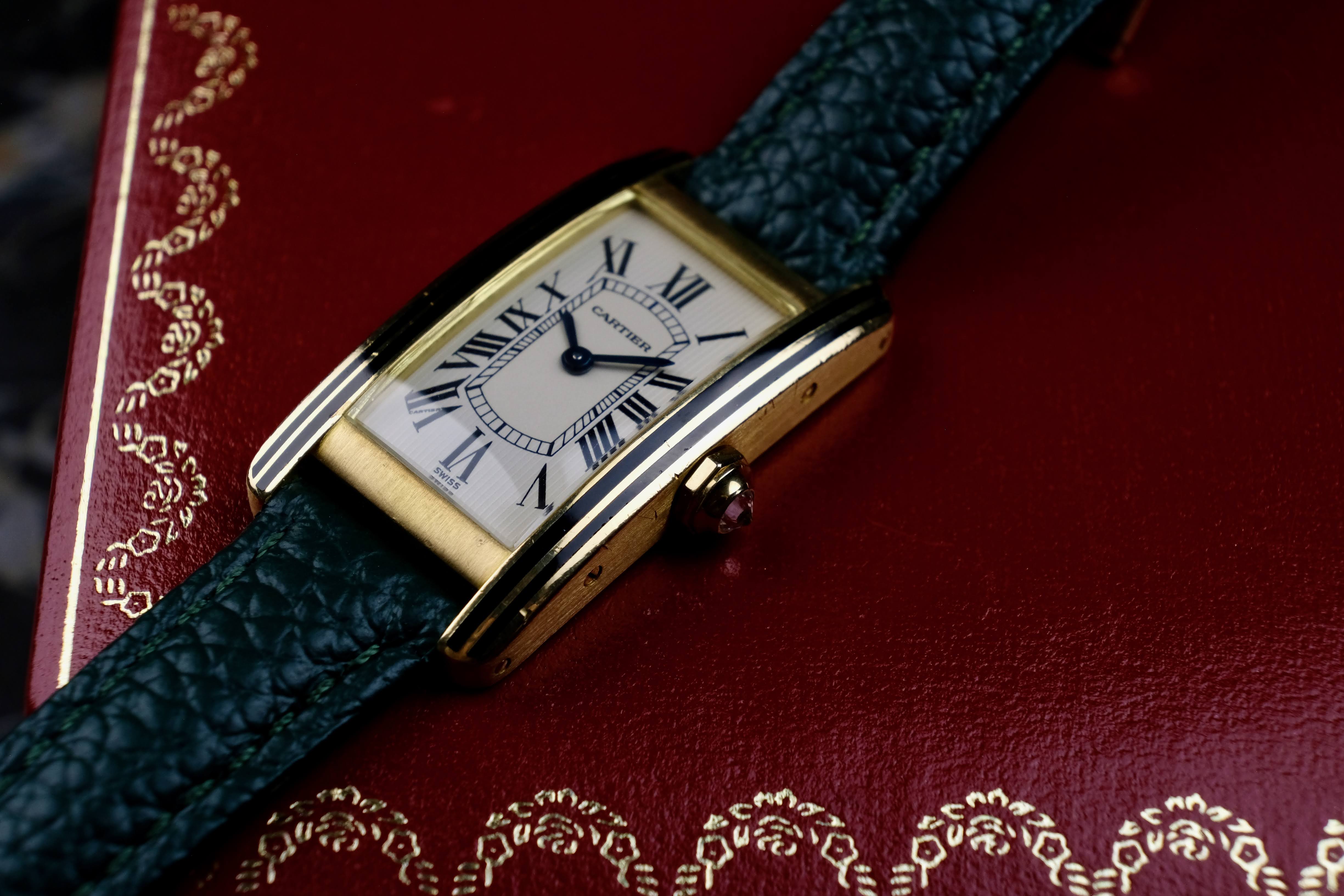 This is your chance to buy quite a rare Tank Americaine and we all know how rare enamel filled Cartier watches are - Bought 1990 in Hamburg at Cartier this watch exists 2 times so far - another one was sold 2023 at an auction. If you check out past auctions of older Cartier enamel filled watches the price is telling you how rare these are. Lets talk about the size: 19mm width does not sound much, but 35mm length gives the watch presence on the wrist - Lets compare this with the legendary Cintree and for this it would be the medium model, which is 100% wearable by men.