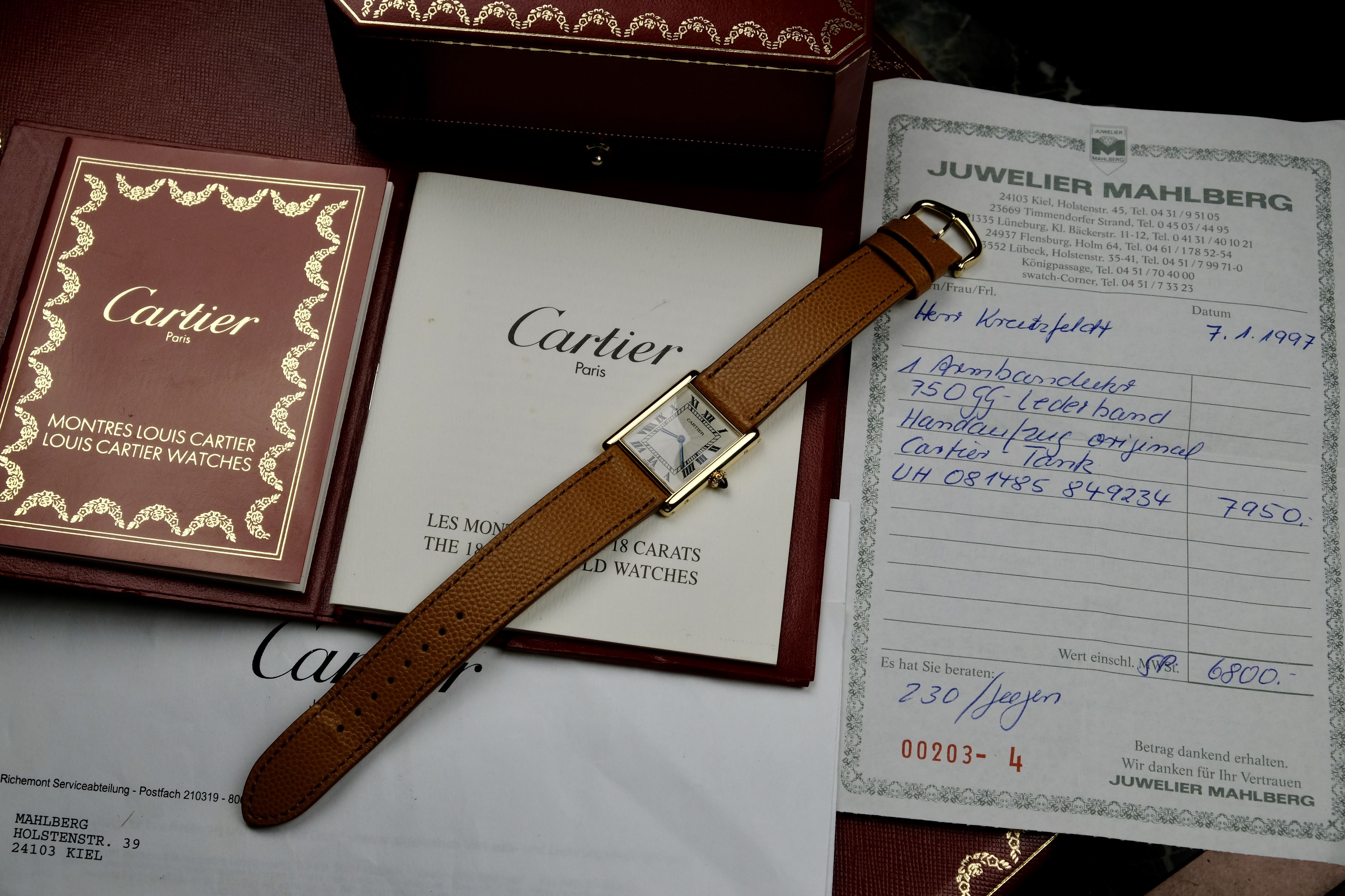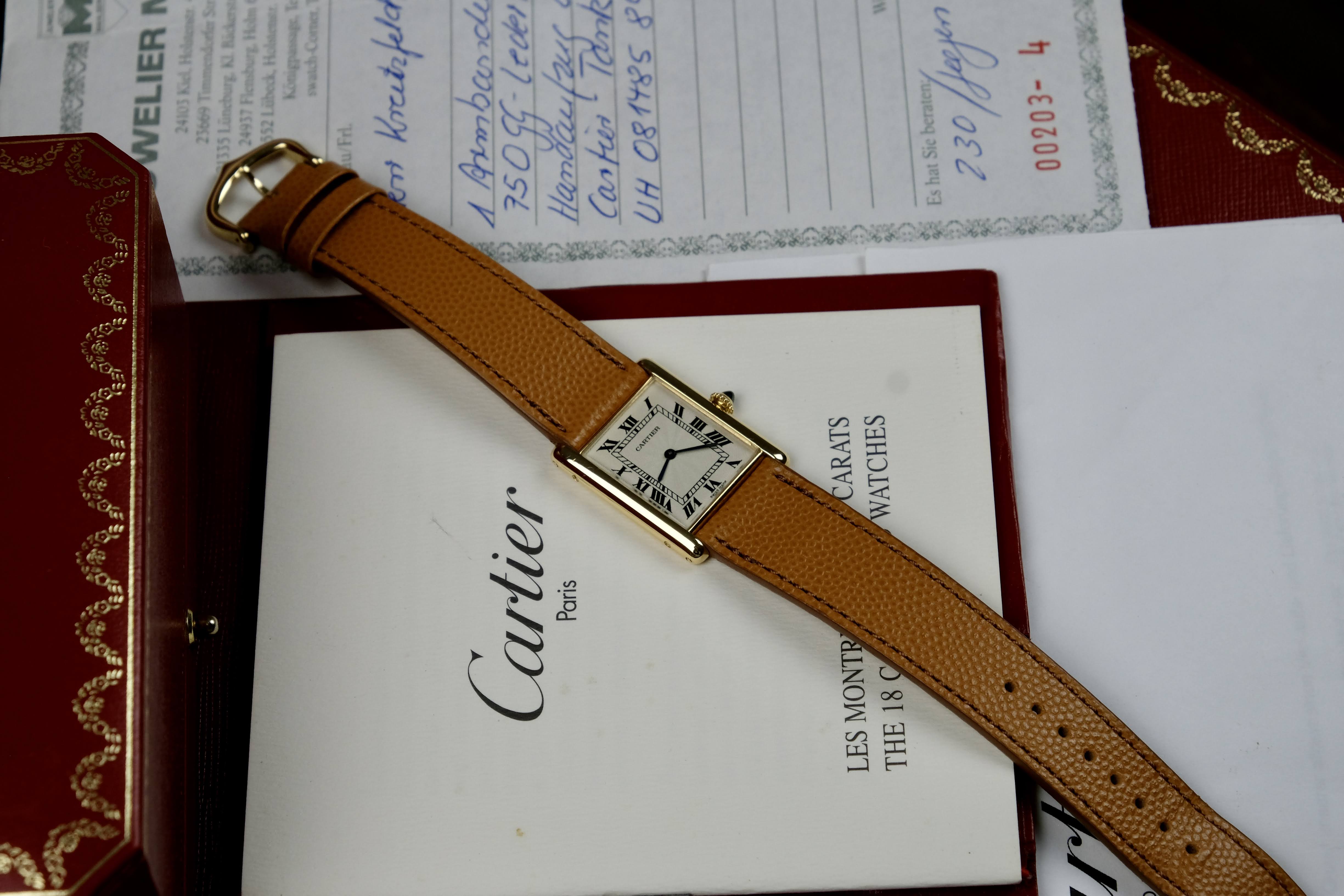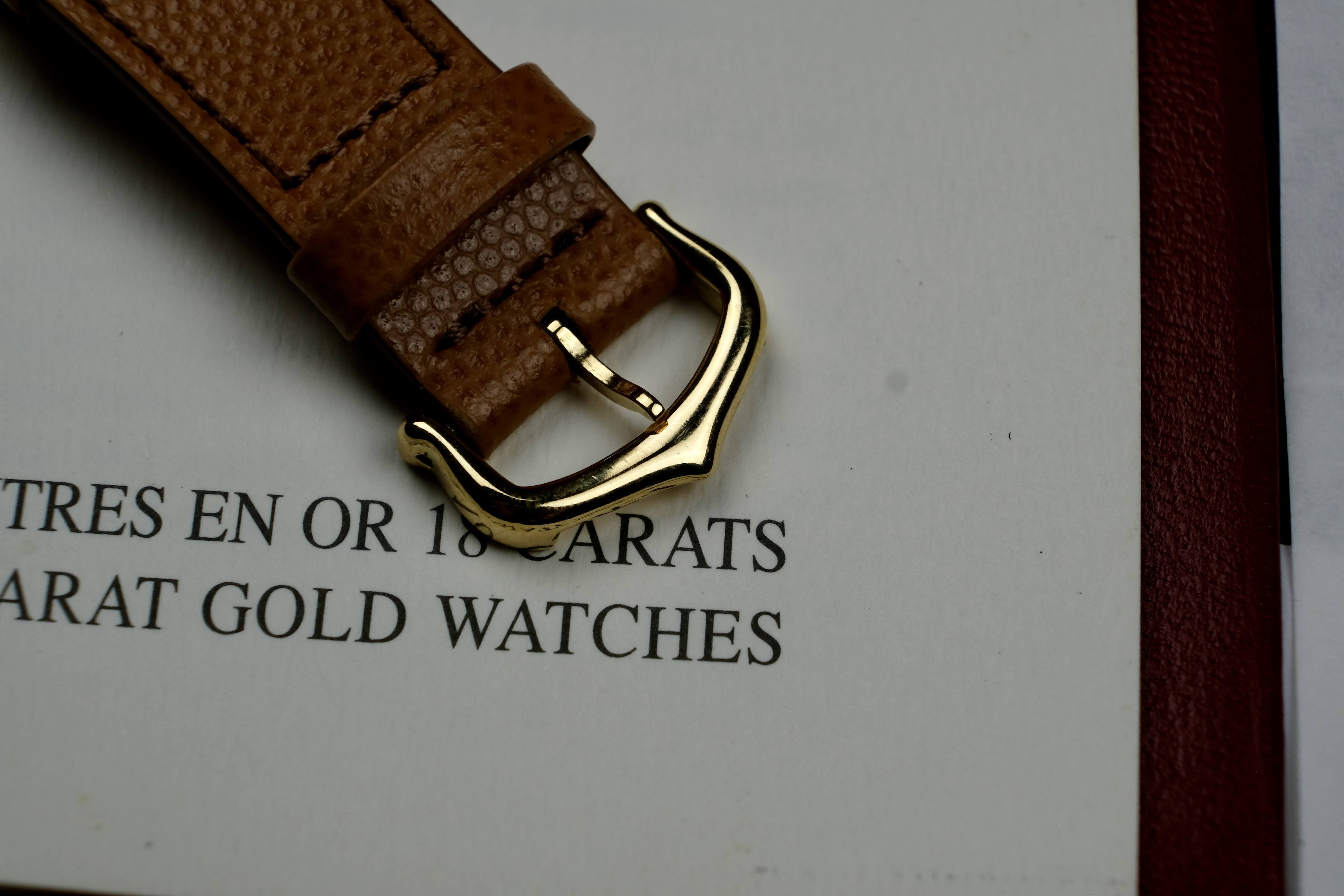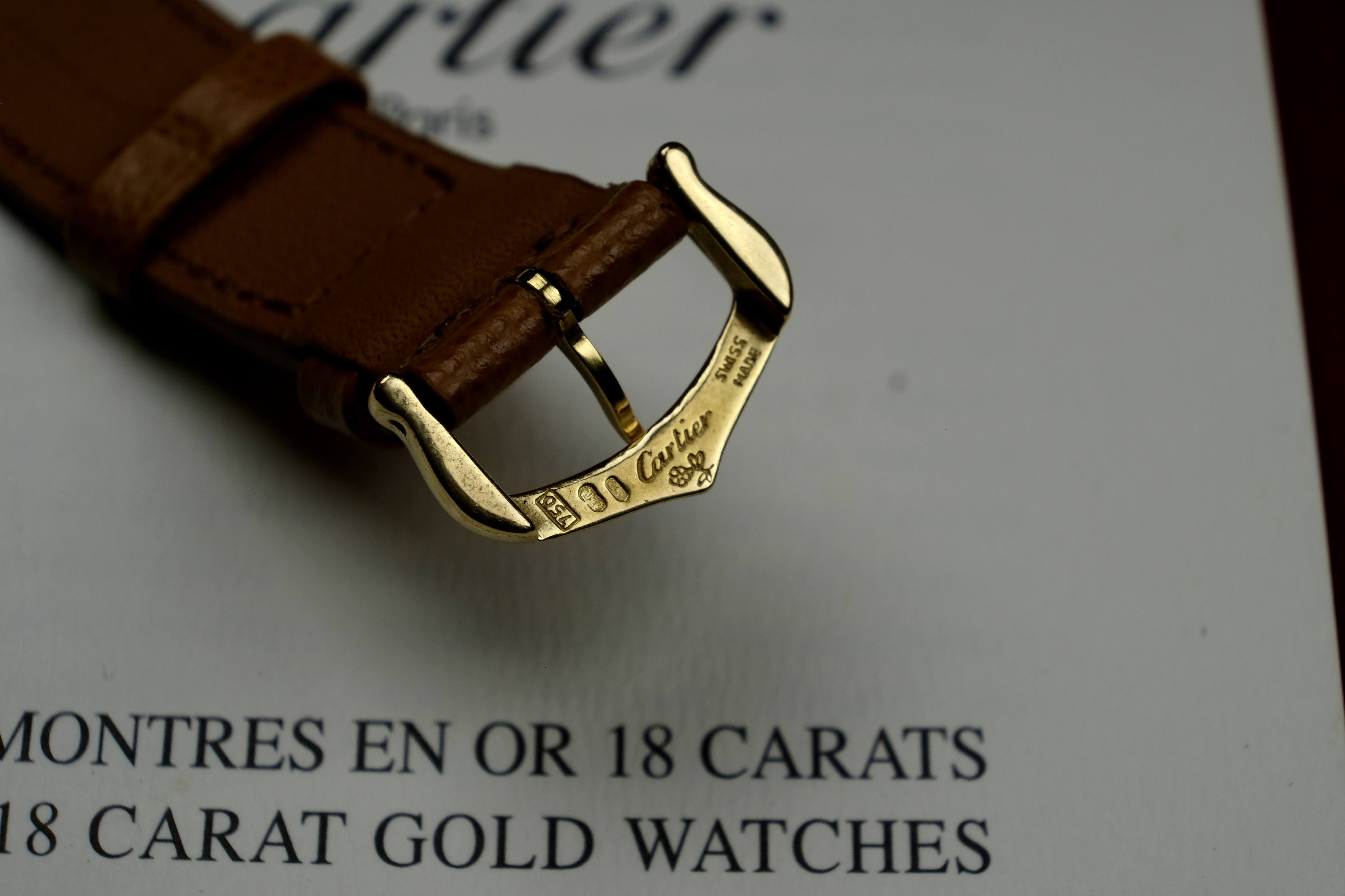 The case is in very good shape, the screw heads are all good and not worn out. The crown is shiny and nice. The dial is perfect, the hands show a bit of patina. The strap is as good as new and mounted on a solid gold pin buckle. You will get the watch with all the paper work (Cartier papers are not included) and the box. The watch runs well, service history not know. If shipped outside the EU, the strap will be removed before shipping.
