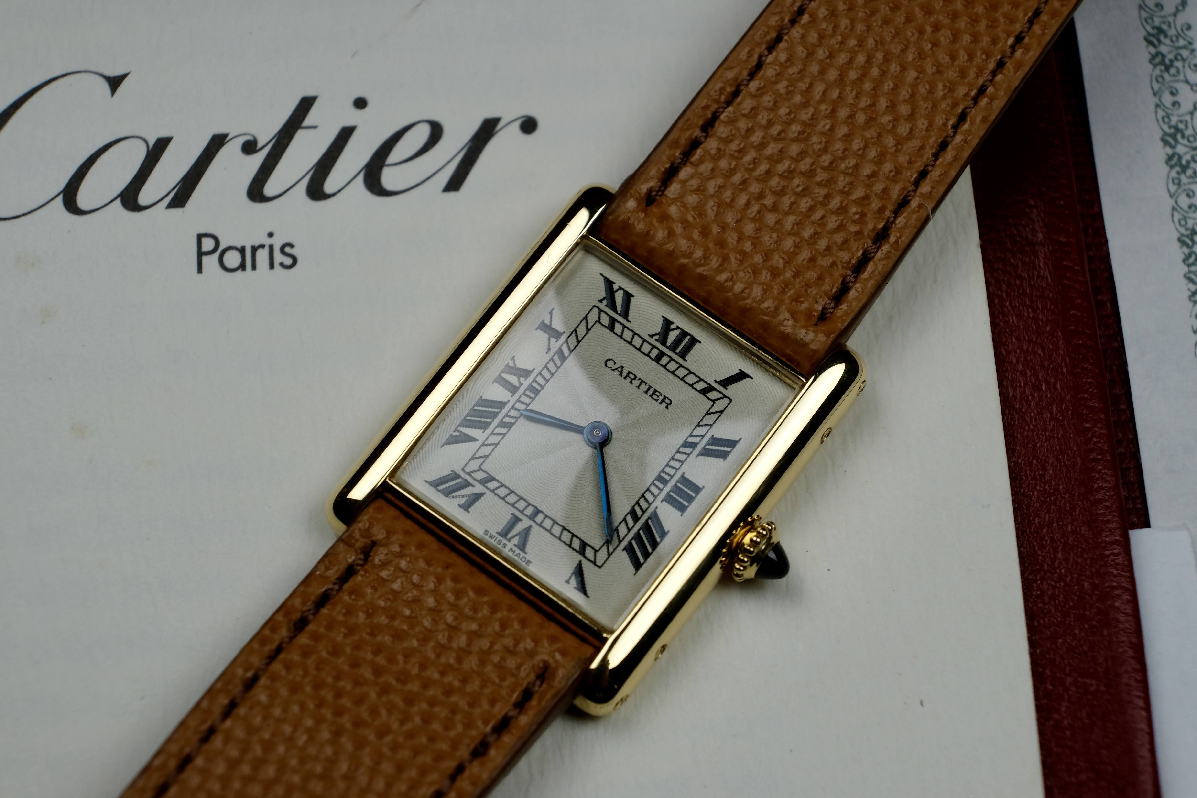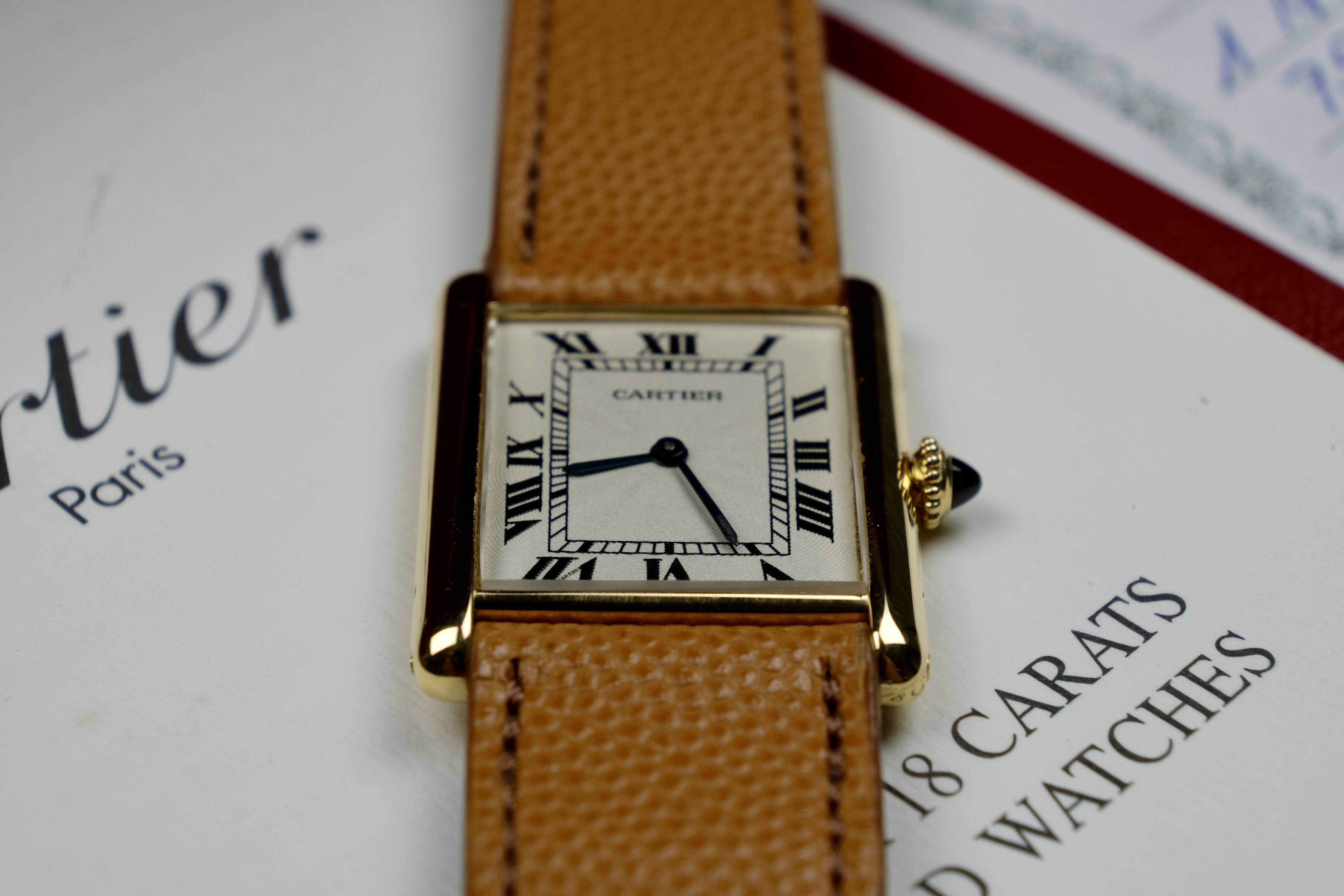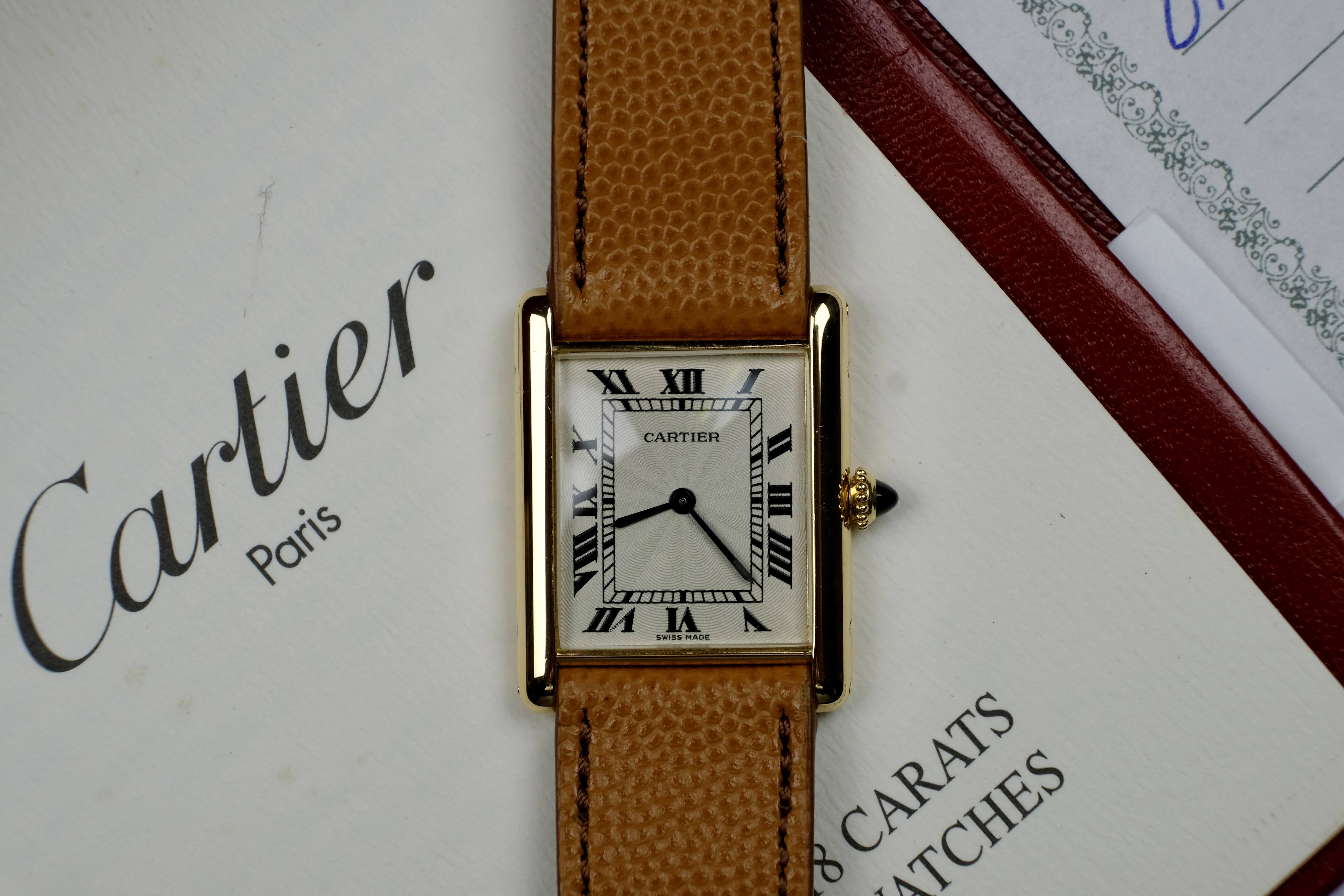 The case is in very good shape, the screw heads are all good and not worn out. The crown is shiny and nice. The dial is perfect, the hands show a bit of patina. The strap is as good as new and mounted on a solid gold pin buckle. You will get the watch with all the paper work (Cartier papers are not included) and the box. The watch runs well, service history not know. If shipped outside the EU, the strap will be removed before shipping.