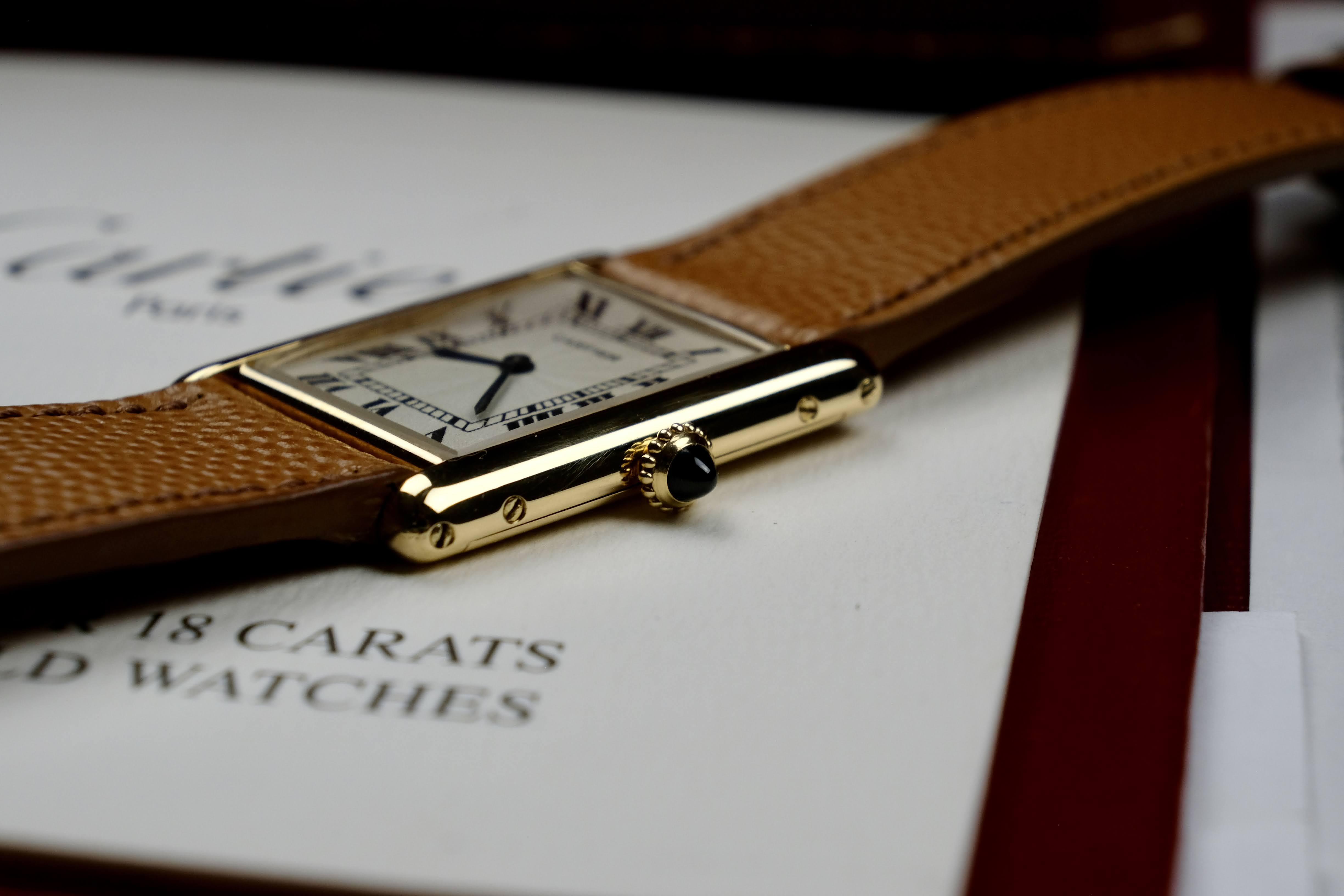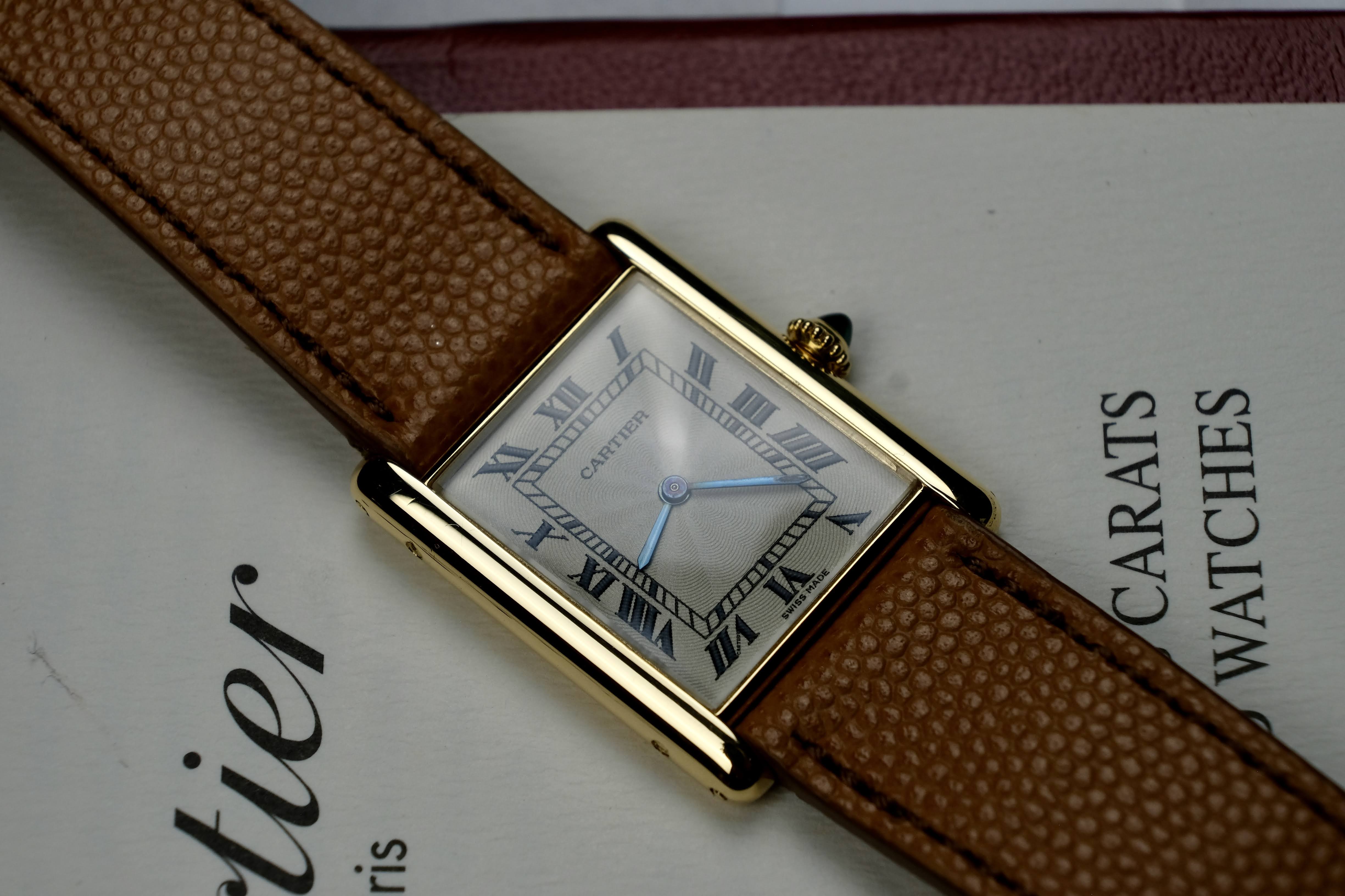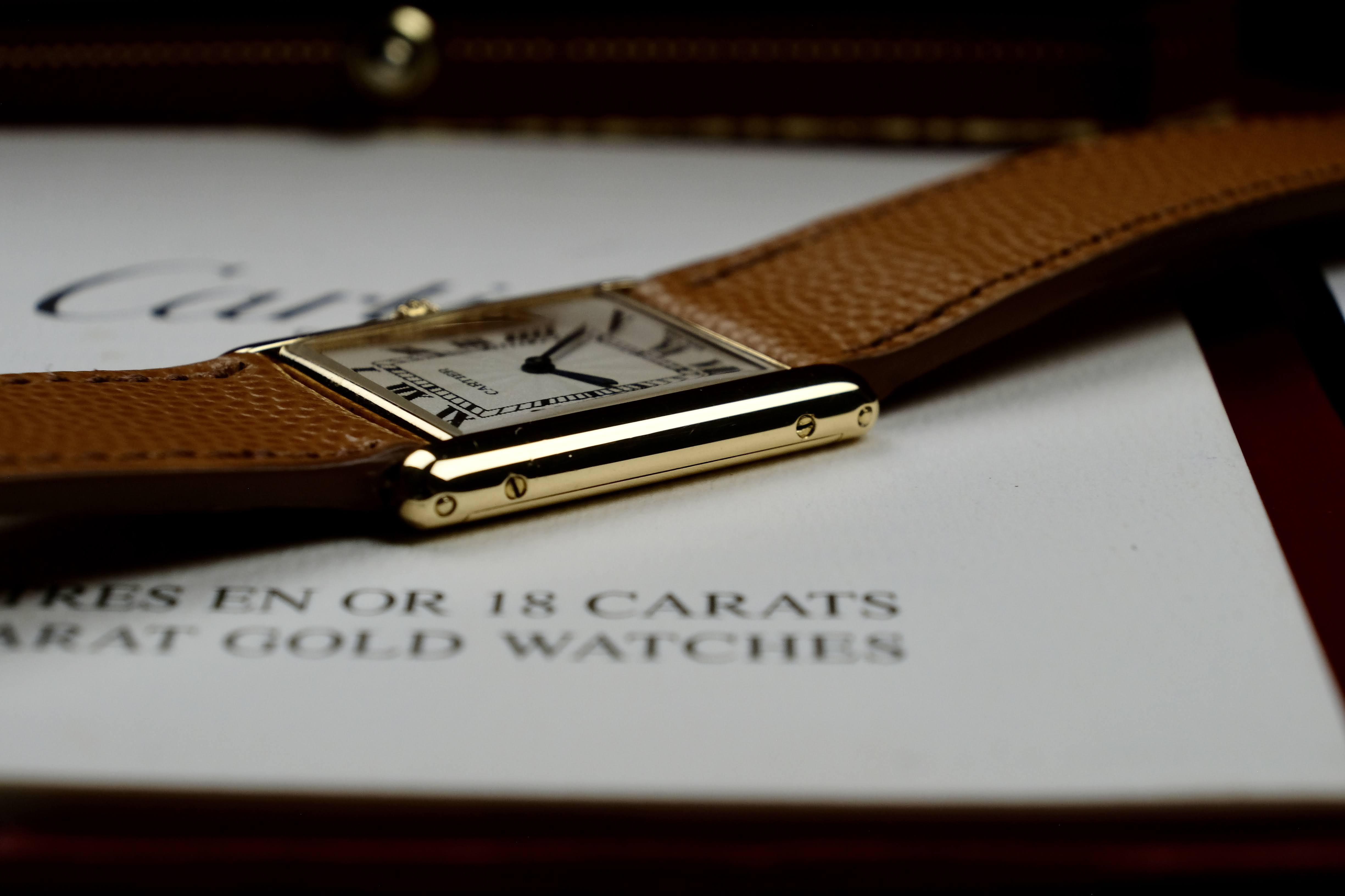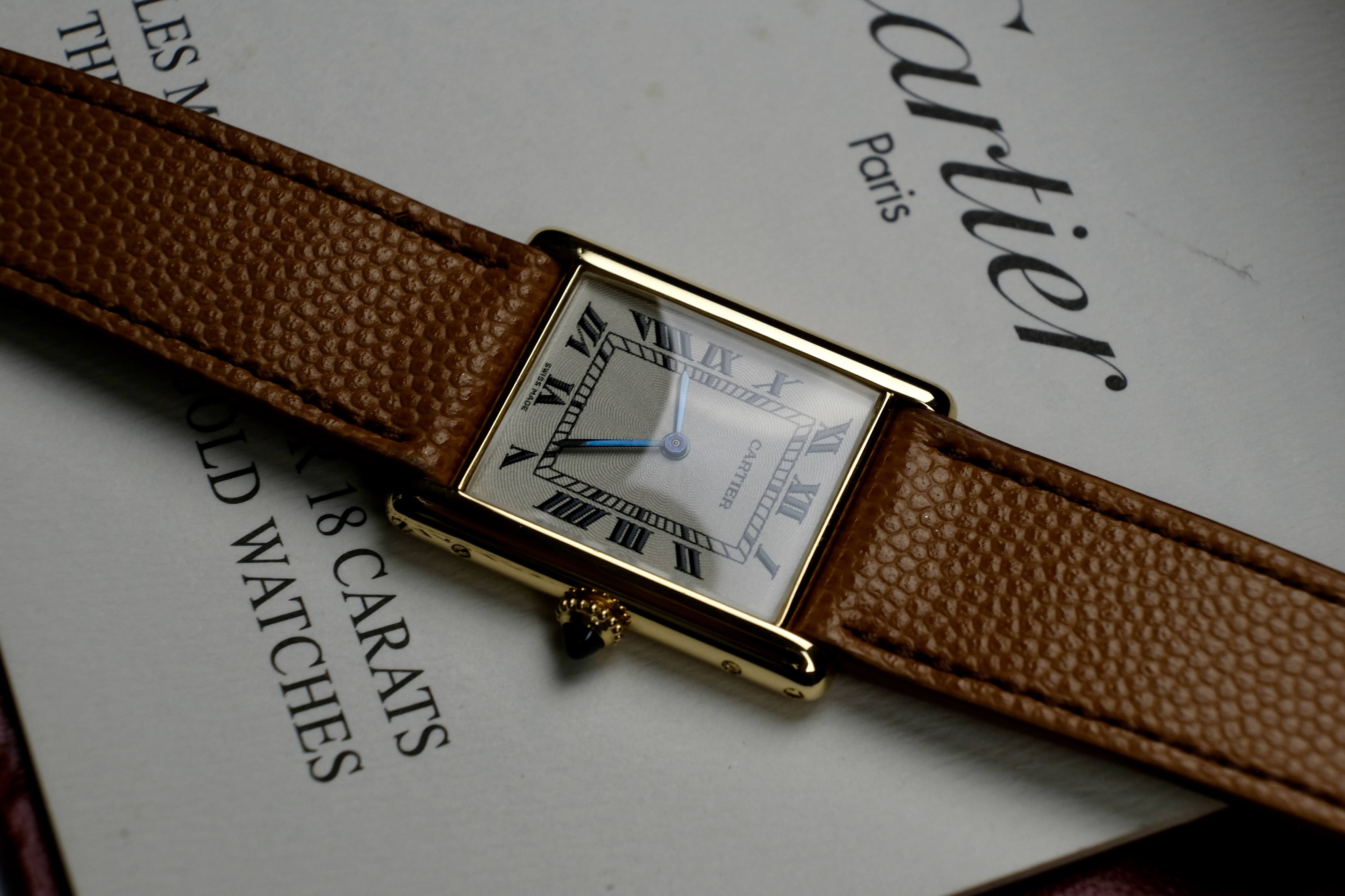 The case is in very good shape, the screw heads are all good and not worn out. The crown is shiny and nice. The dial is perfect, the hands show a bit of patina. The strap is as good as new and mounted on a solid gold pin buckle. You will get the watch with all the paper work (Cartier papers are not included) and the box. The watch runs well, service history not know. If shipped outside the EU, the strap will be removed before shipping.