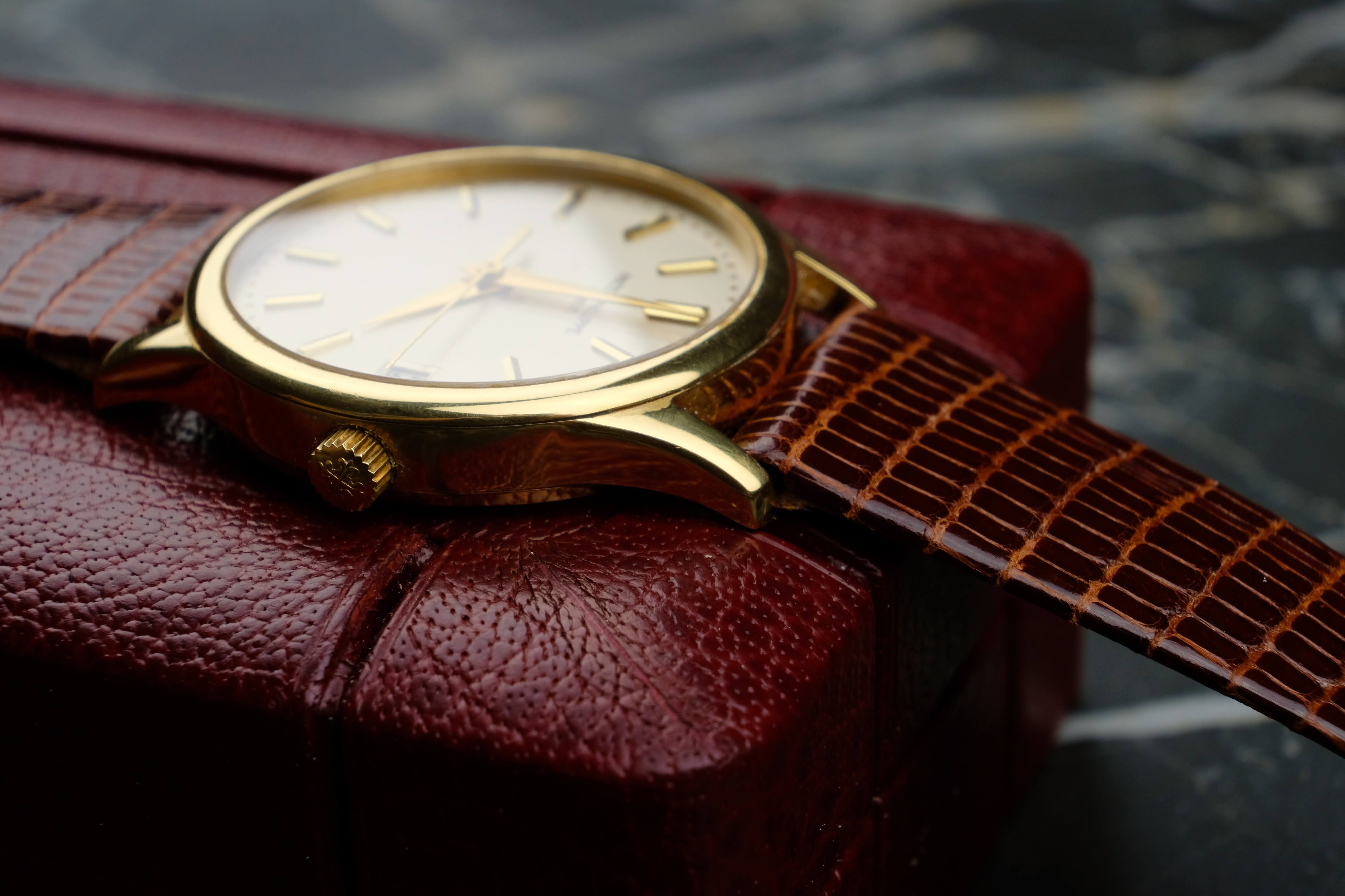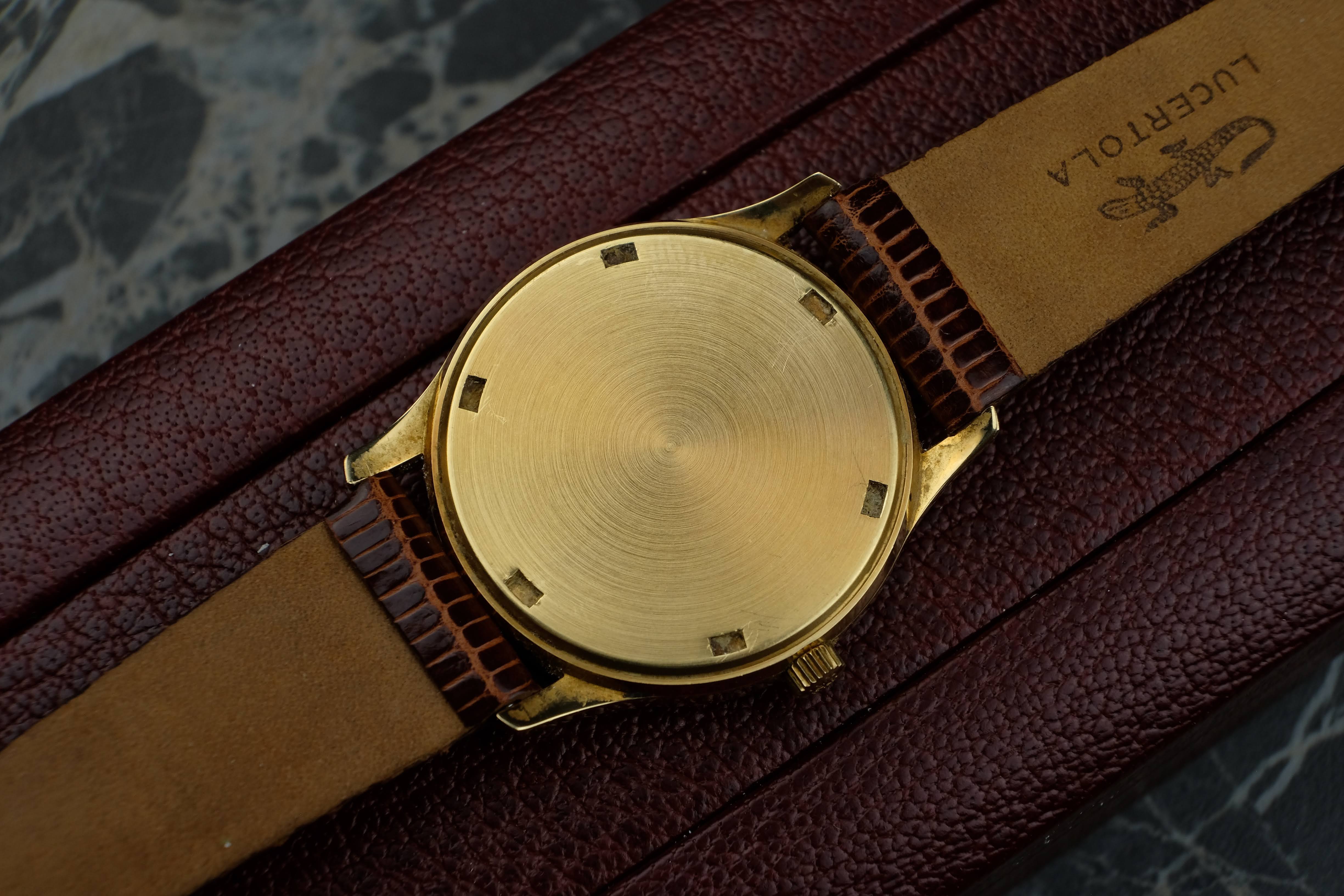 The case has little scratches all over, the bezel has a little hit at 9. The hands and dial are very clean, the crown as well. From what I see the crystal has no issues. The watch comes on a generic lizard strap on an old Patek pin buckle. You will get the watch with everything you see on the picture. The watch is running very well, service history is unknown.