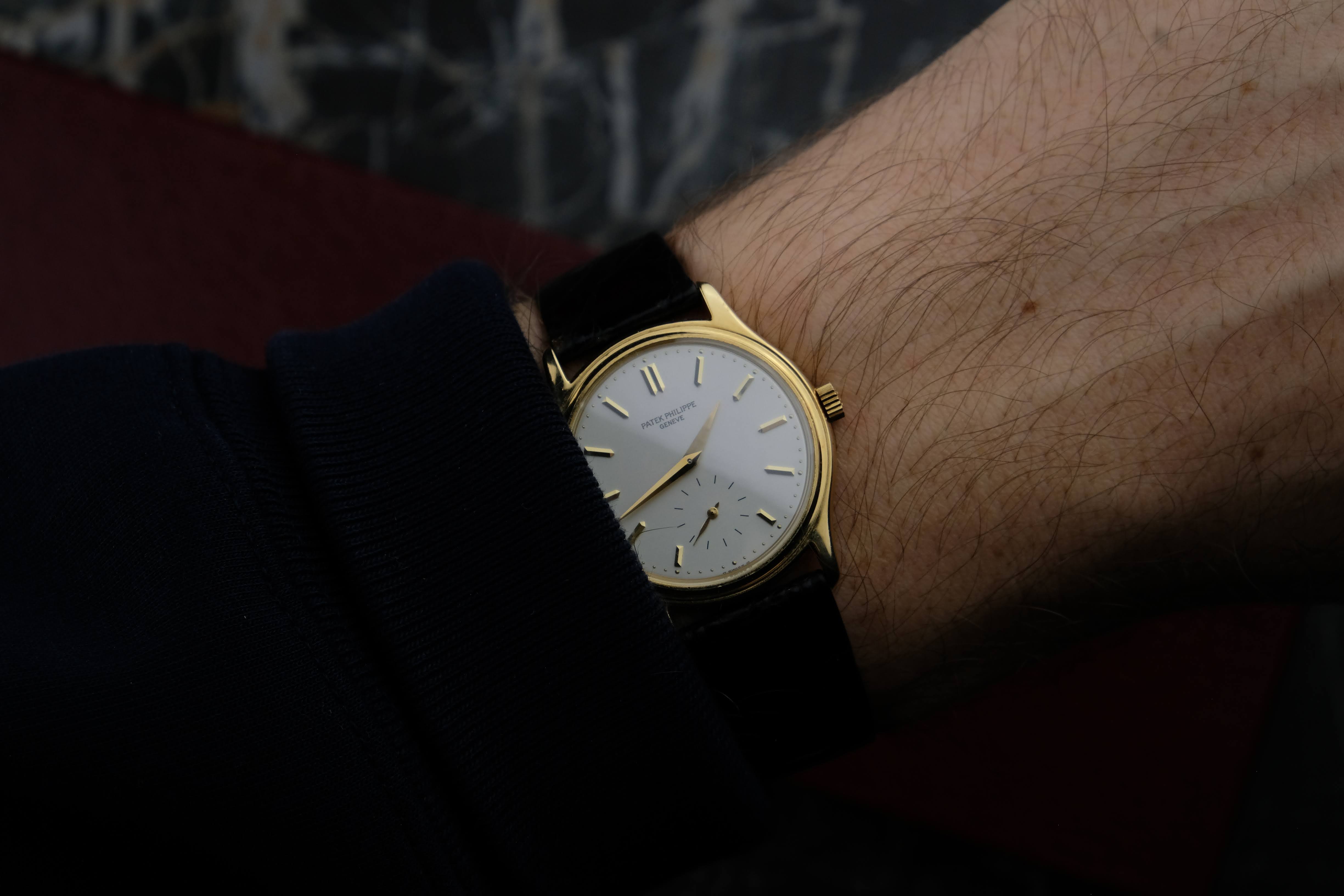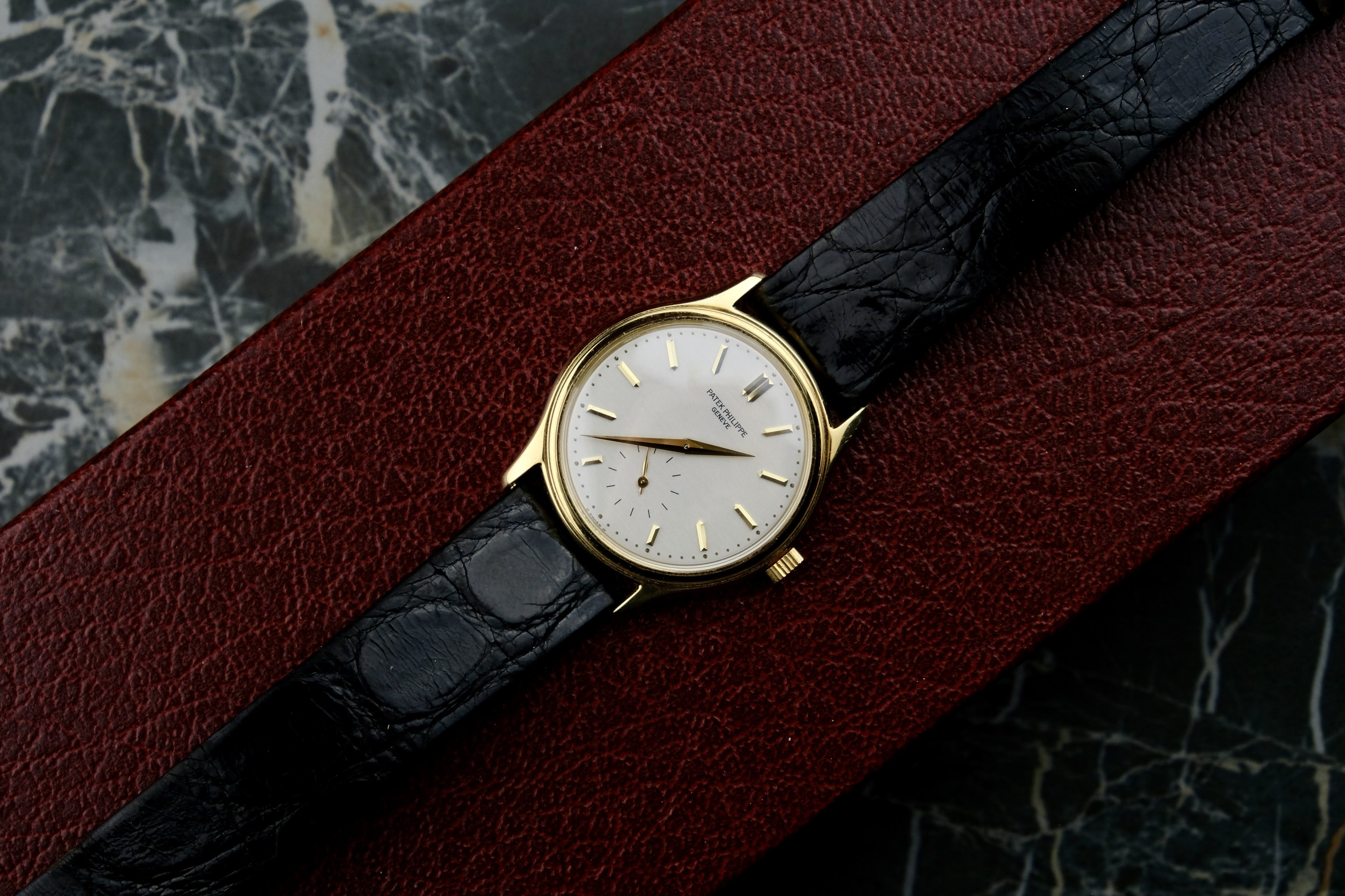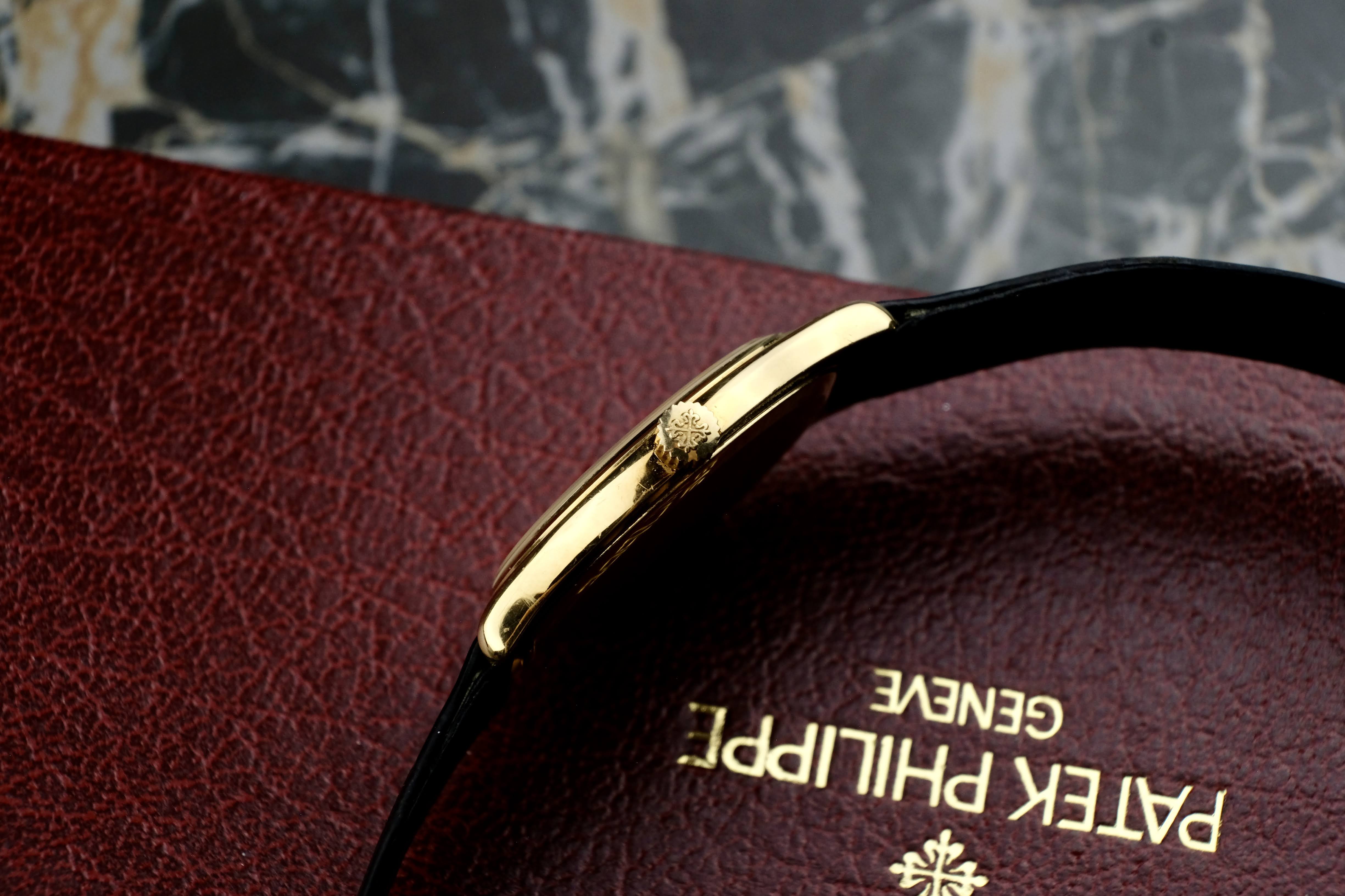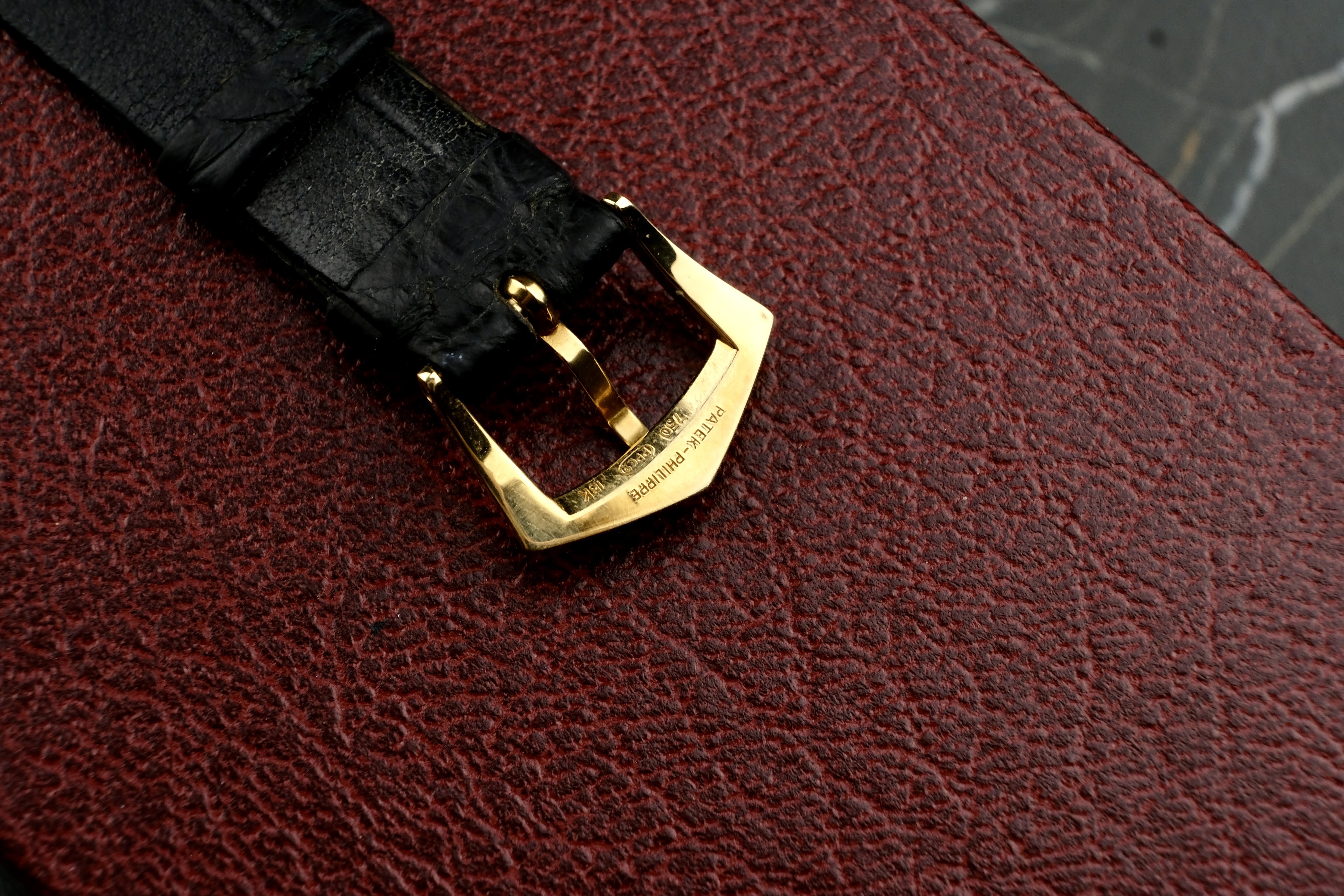 The watch is in perfect unpolished but worn conditions, hands and dial is clean, the case has some slight scratches but nothing deep. Based on the caseback I would say the watch is unpolished, the transition between the polished and brushed part are super clean, the polished area is like a mirror and the hall marks super deep. You will get the watch on the correct solid gold Patek Philippe pin buckle in its correct box with a hang tag showing the reference and the movement number. The watch runs totally fine.