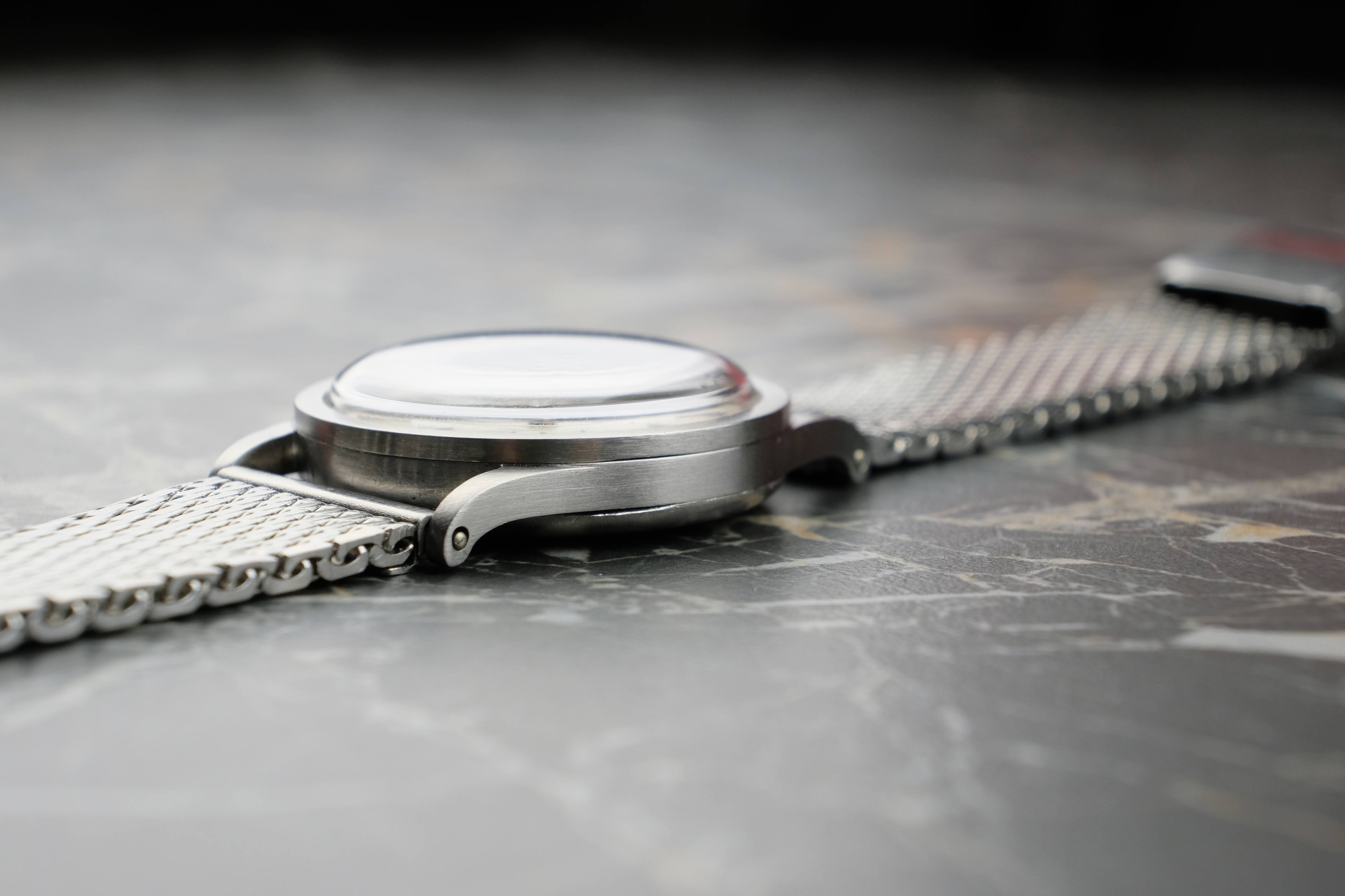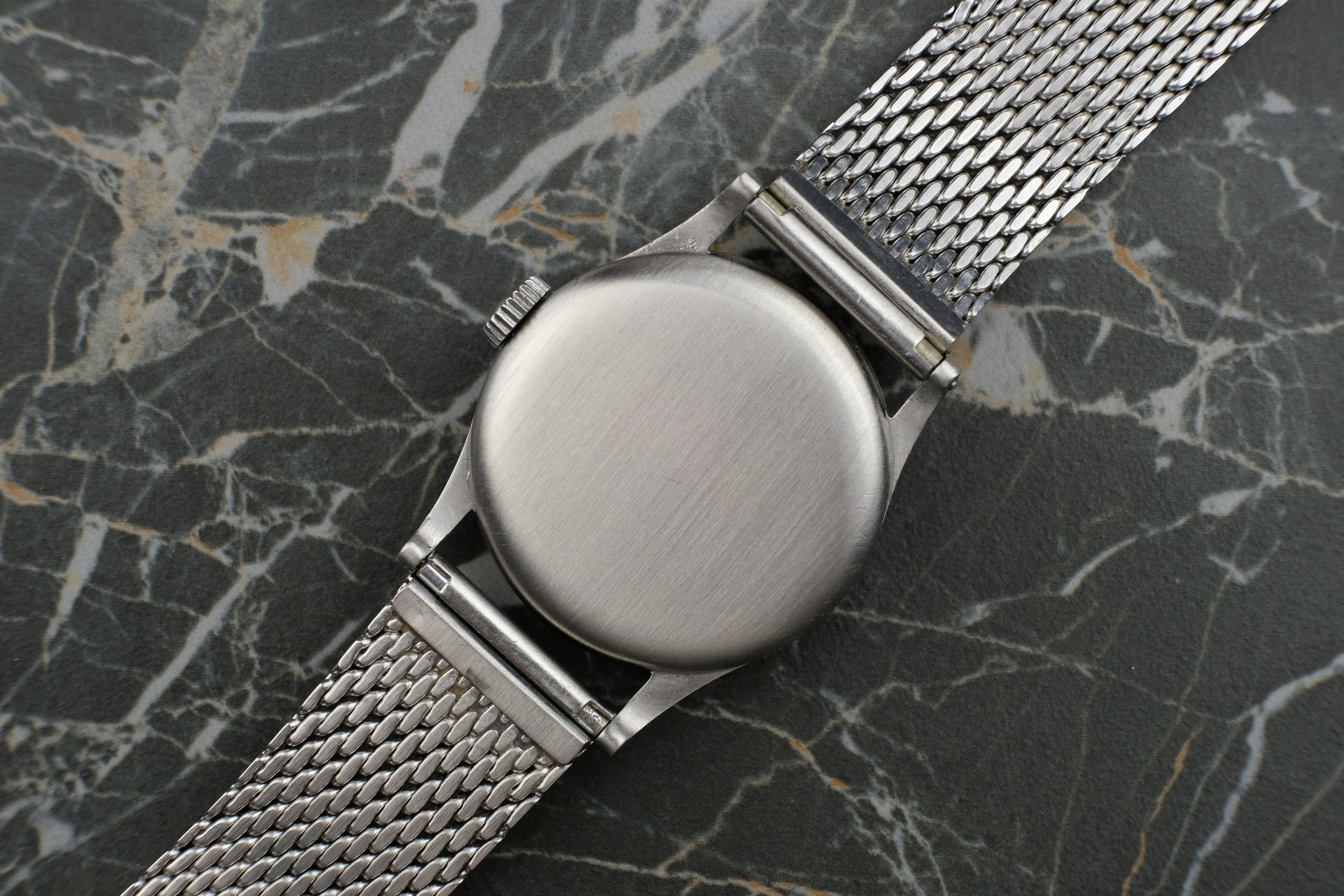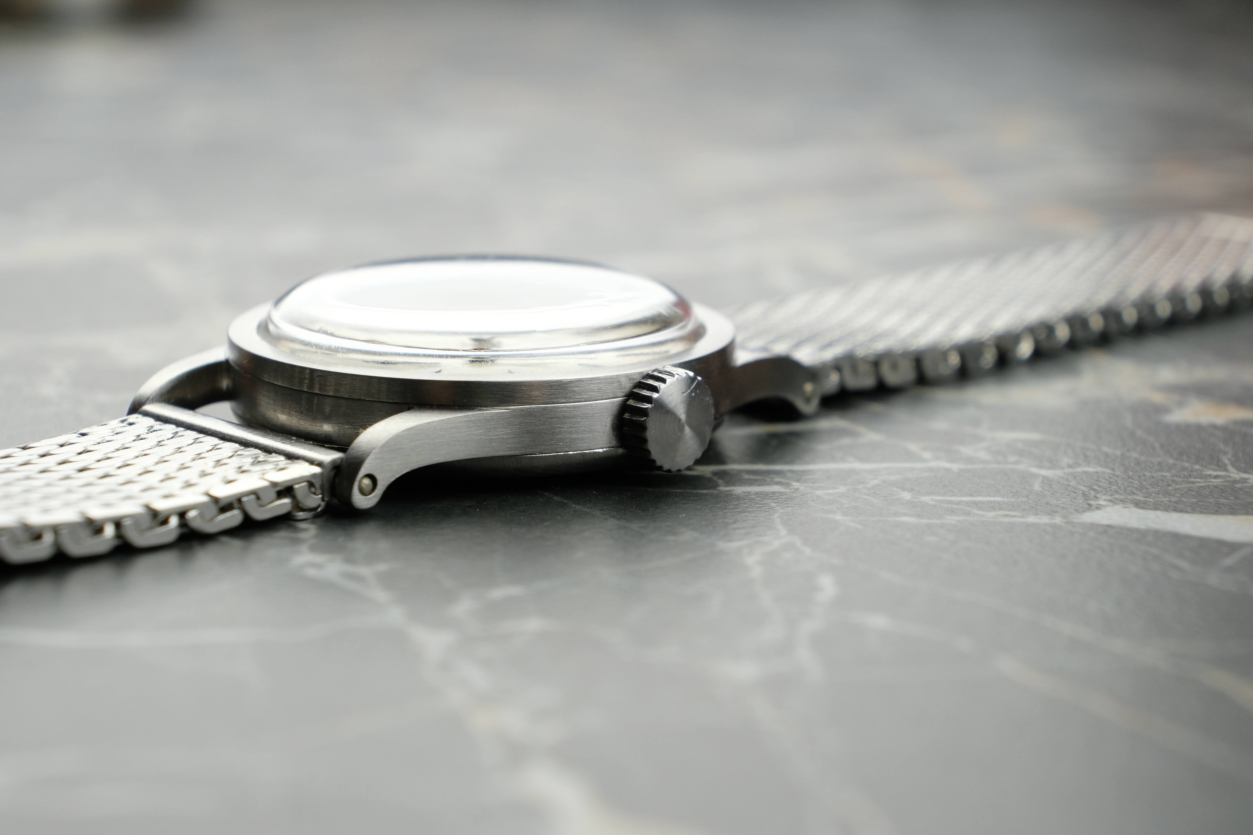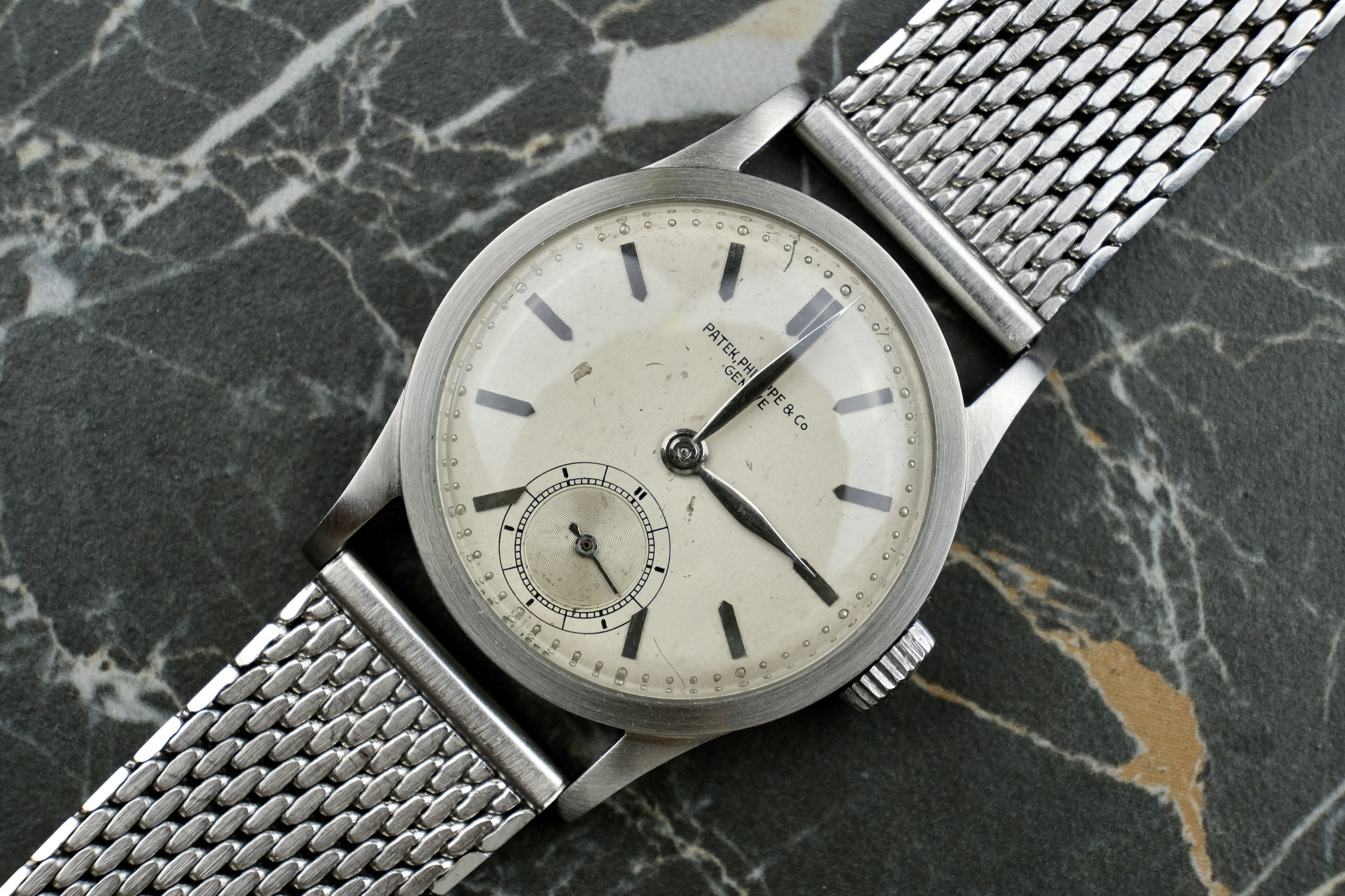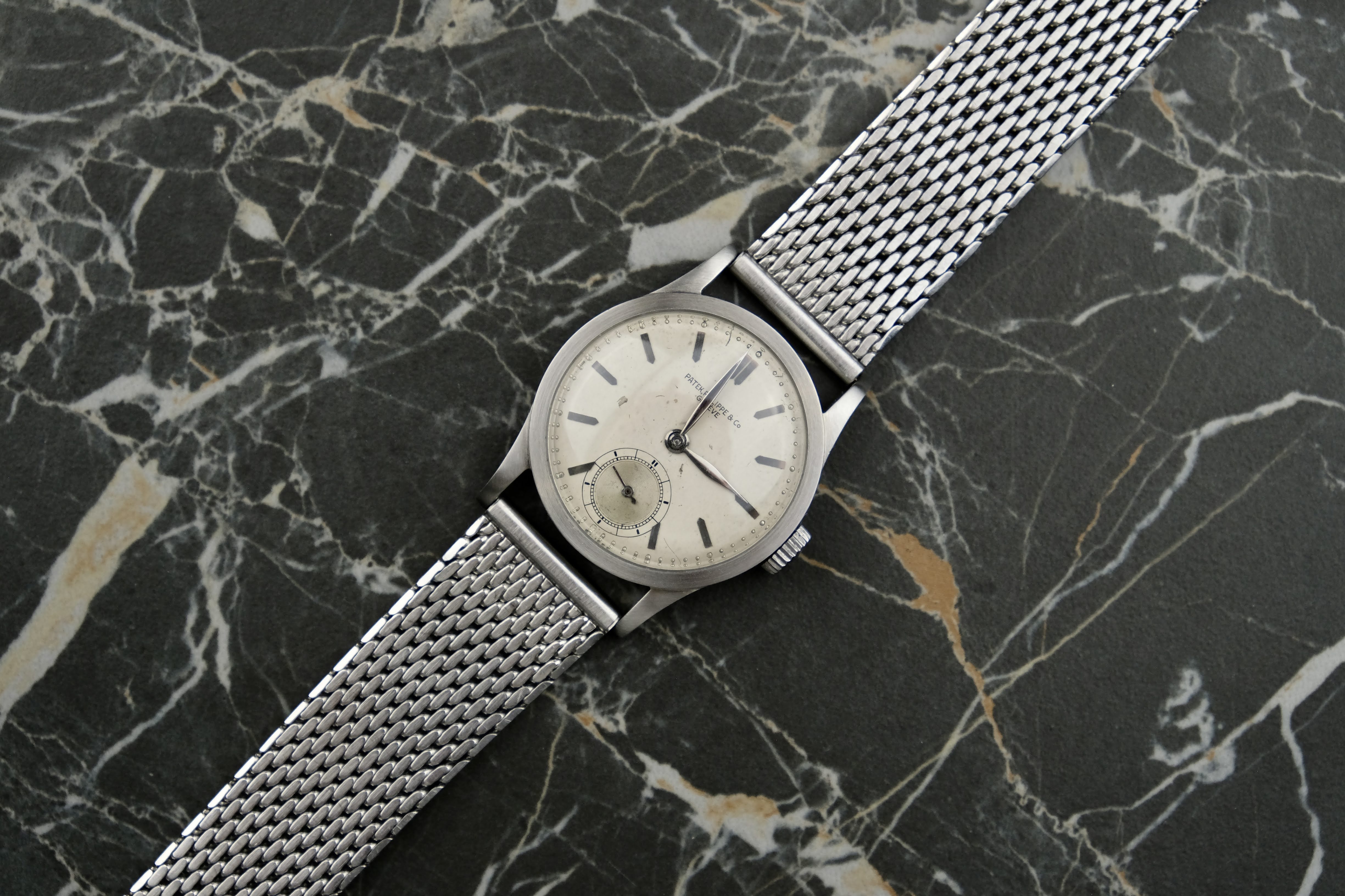 The watch was serviced at Juwelier Dührkoop in April 2025. During the service, the movement received a full overhaul, and the case and crystal were professionally refinished. As a result, the case remains in very good condition, retaining the characteristic and elegant proportions of the reference 96. The original “fab suisse” dial shows honest signs of age and light marks, which add to its authenticity and charm. The leaf hands are well preserved and complement the dial beautifully. The watch is offered with the April 2025 service invoice, a Patek Philippe travel pouch (étui), the watch head, and a Stelux mesh bracelet.