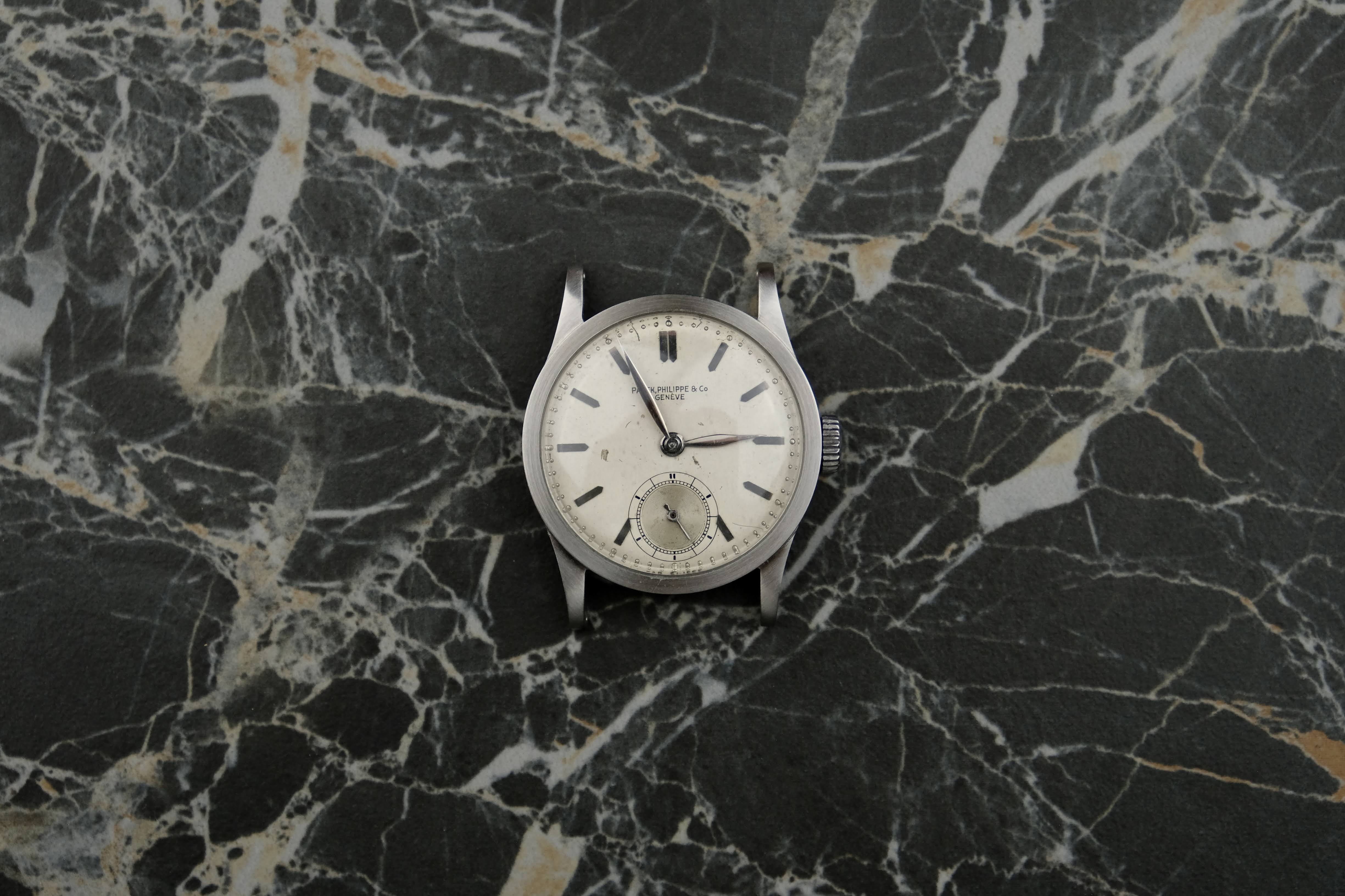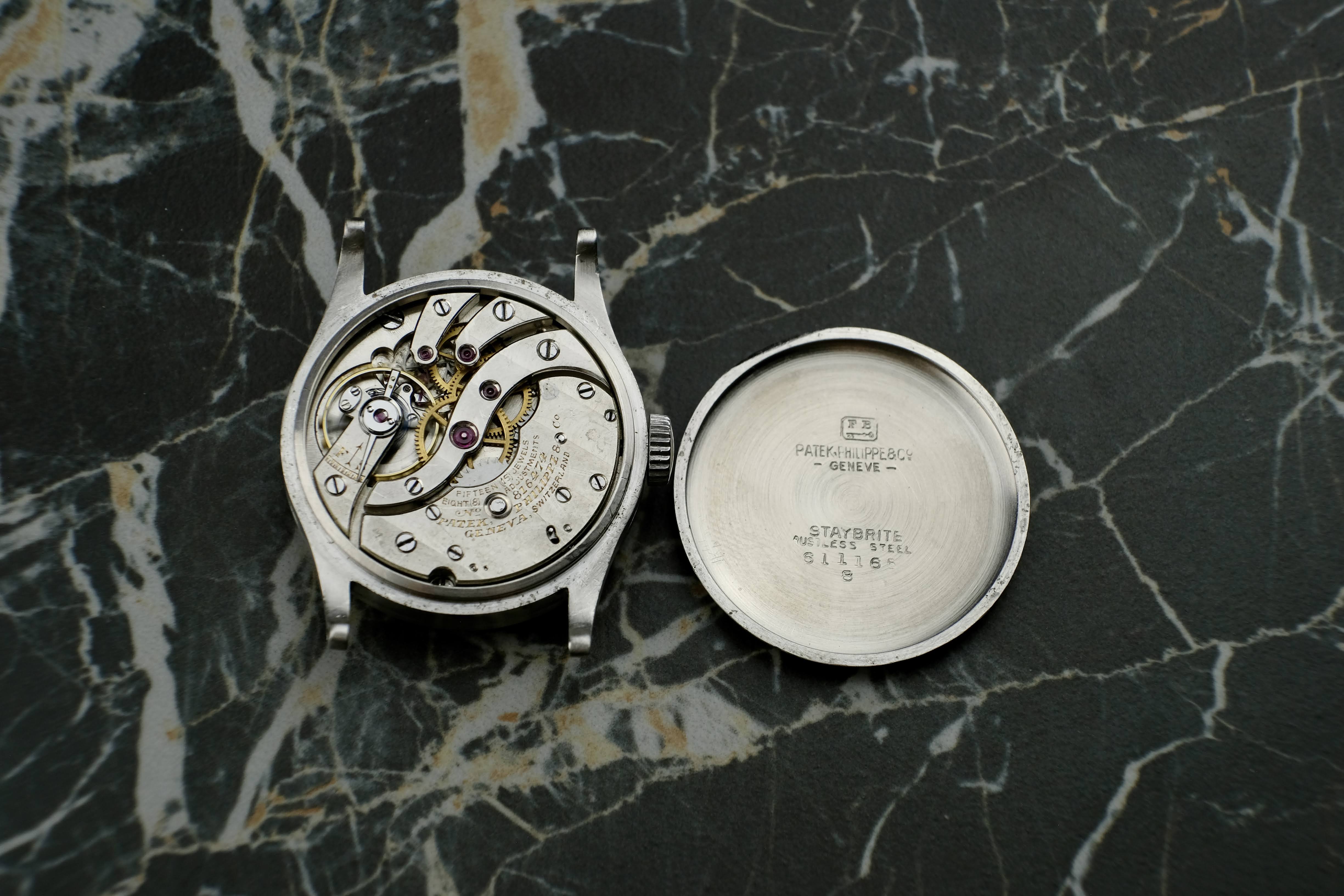 Here we have a truly special piece: a Patek Philippe Calatrava 96 that has remained in the previous owner’s family since it was first acquired. He inherited the watch from his great-grandfather (1870–1966), an engineer based in Paris, who purchased it in the 1930s. This watch is unmistakably French in character. At the very bottom of the dial, you will find the inscription “fab suisse.” This marking stems from a late 19th-century French law requiring imported goods to indicate their country of origin—an elegant historical detail that ties the watch closely to its Parisian past. The flat indices and leaf hands are entirely consistent with reference 96 models of the 1930s. Based on my research, and considering the individual case and movement numbers, this example was most likely cased in around 1937/38, but the movement was produced earlier, which was common practice back then.