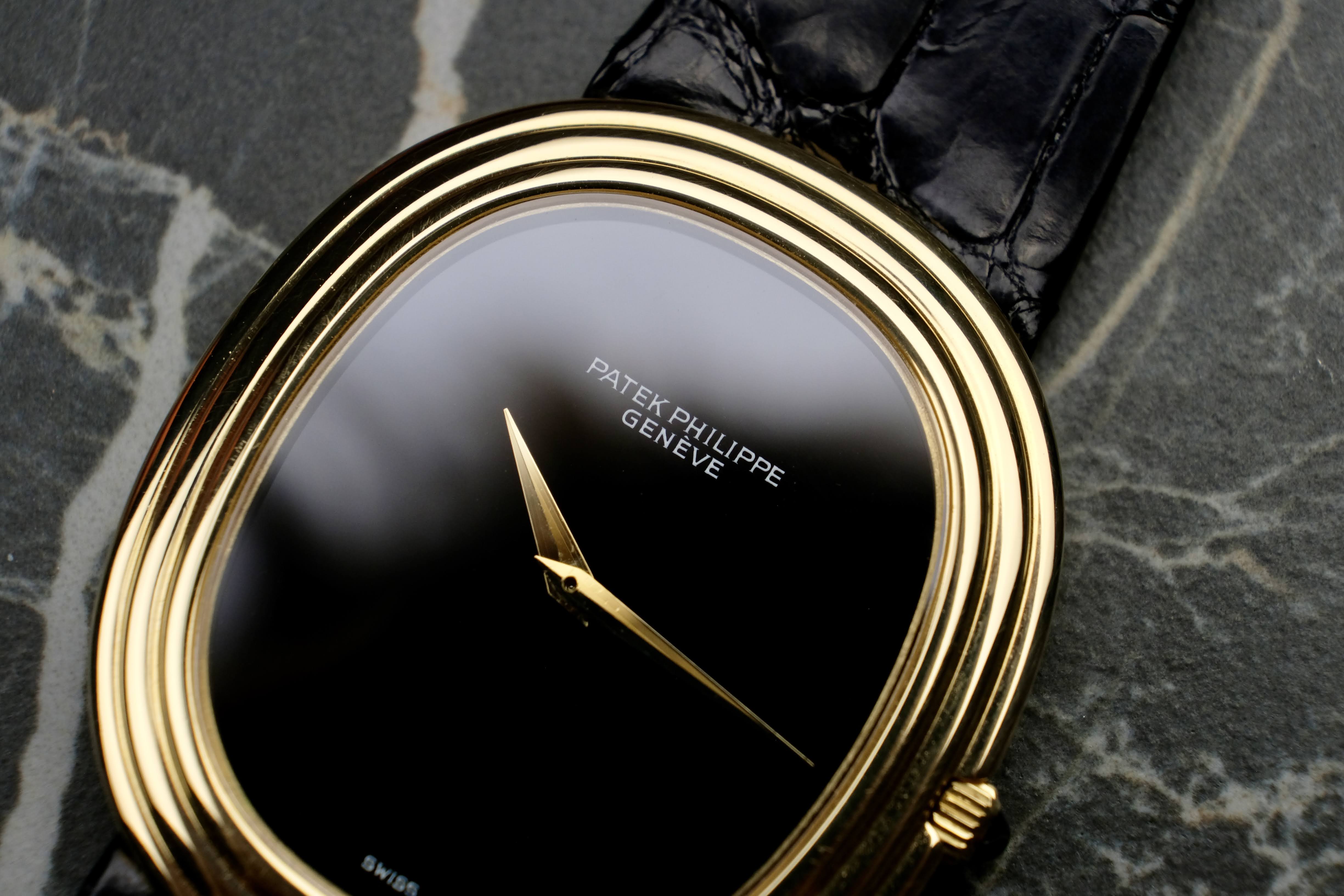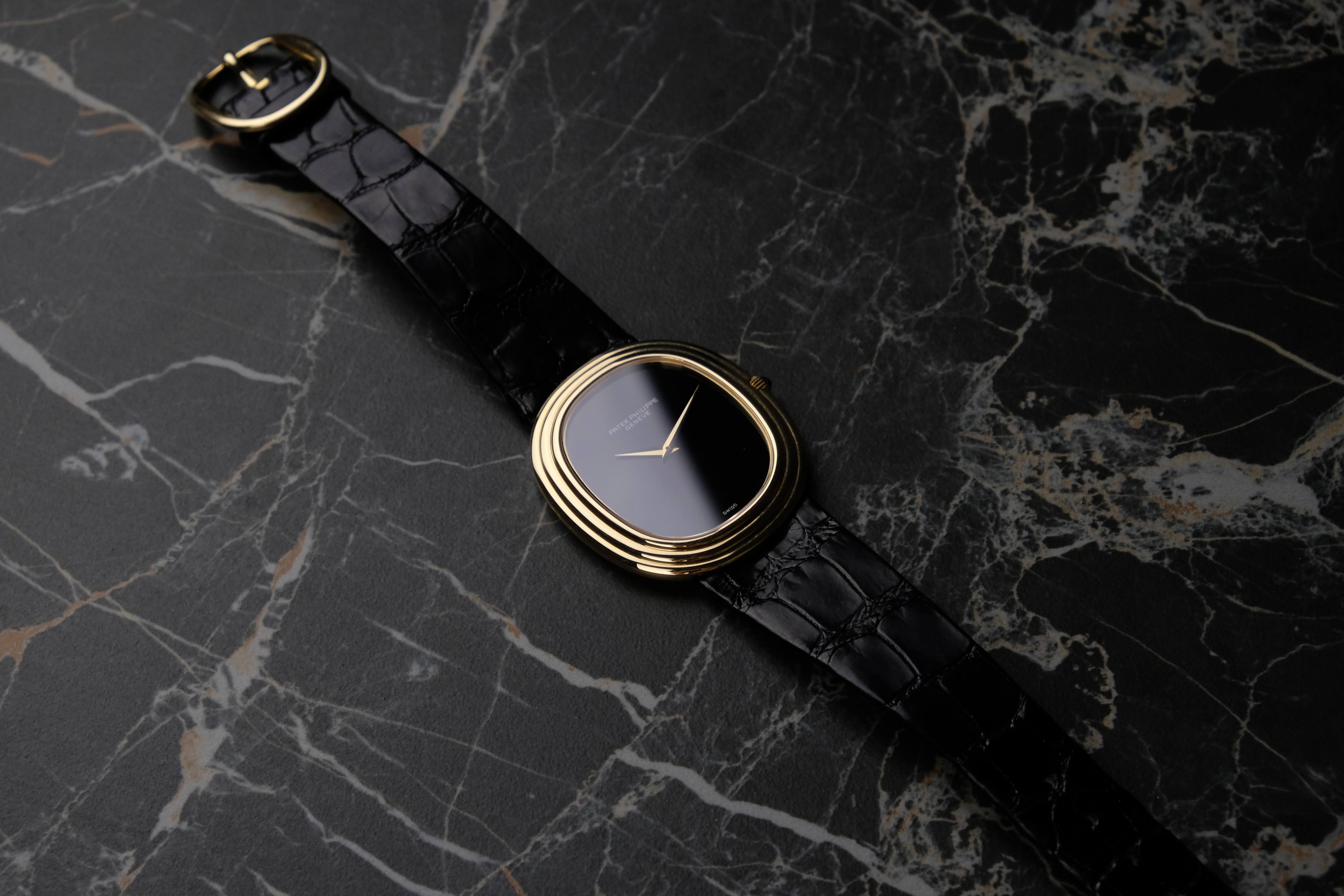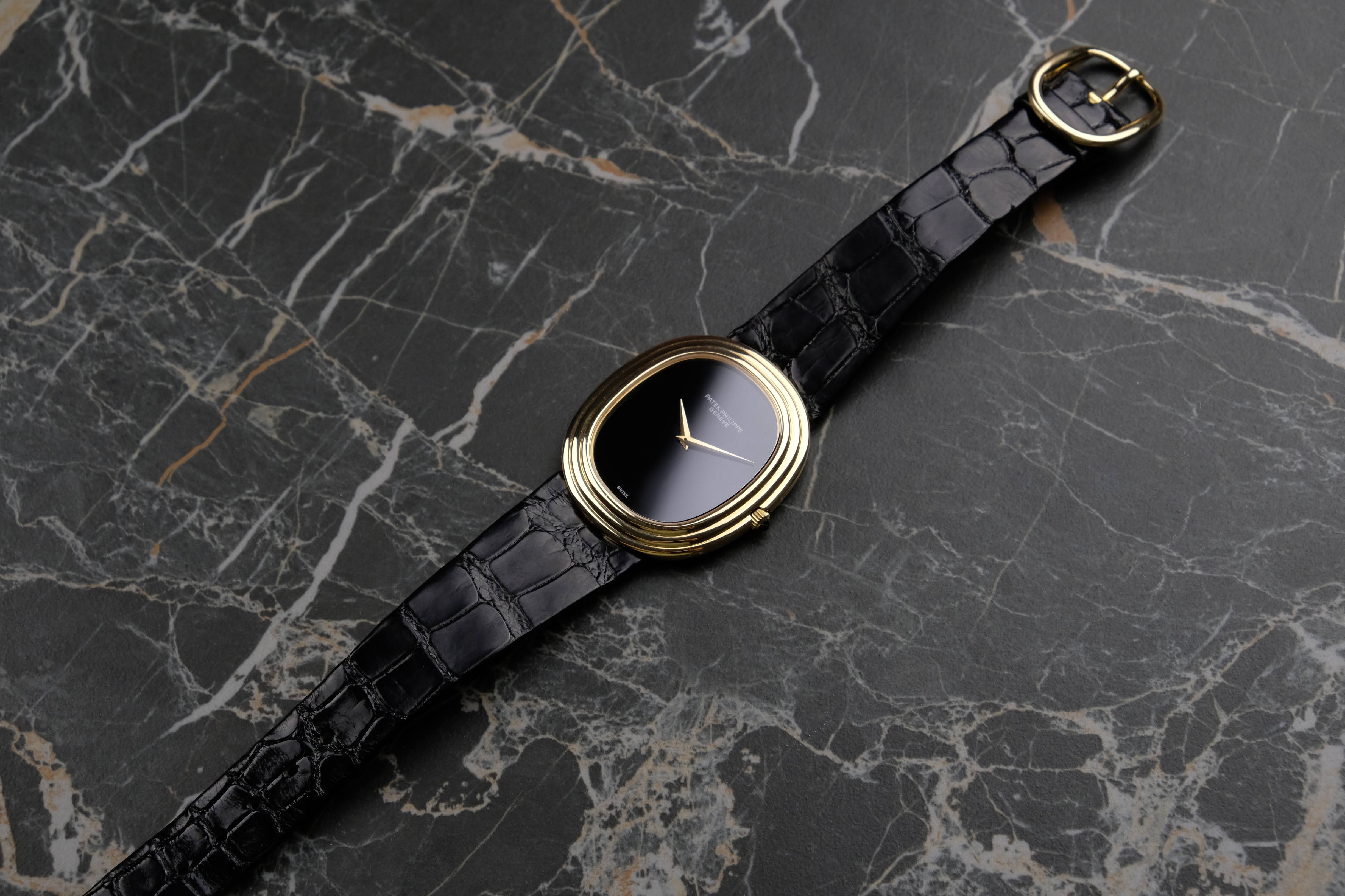 First unveiled in 1968, the Golden Ellipse marked a bold break from the conventional watch shapes of its era. The reference 3634, known as the Grande Golden Ellipse, was produced in 1977 and represents the largest version of the model. It stands among the rarest examples ever made. Crafted in 18k white gold, the case measures 38 by 33.5 millimeters—dimensions that feel remarkably contemporary. Despite its size, the watch remains impressively slim at just over 6 millimeters thick, thanks to the ultra-thin self-winding caliber 28-255C movement—the very same mechanism used in the reference 3700 Nautilus. The case design is distinctive, featuring three slender, curved gadroons that encircle the crystal to create a stepped visual effect. Unlike traditional designs with pronounced lugs, the Ellipse achieves a seamless silhouette, interrupted only where the strap meets the case.