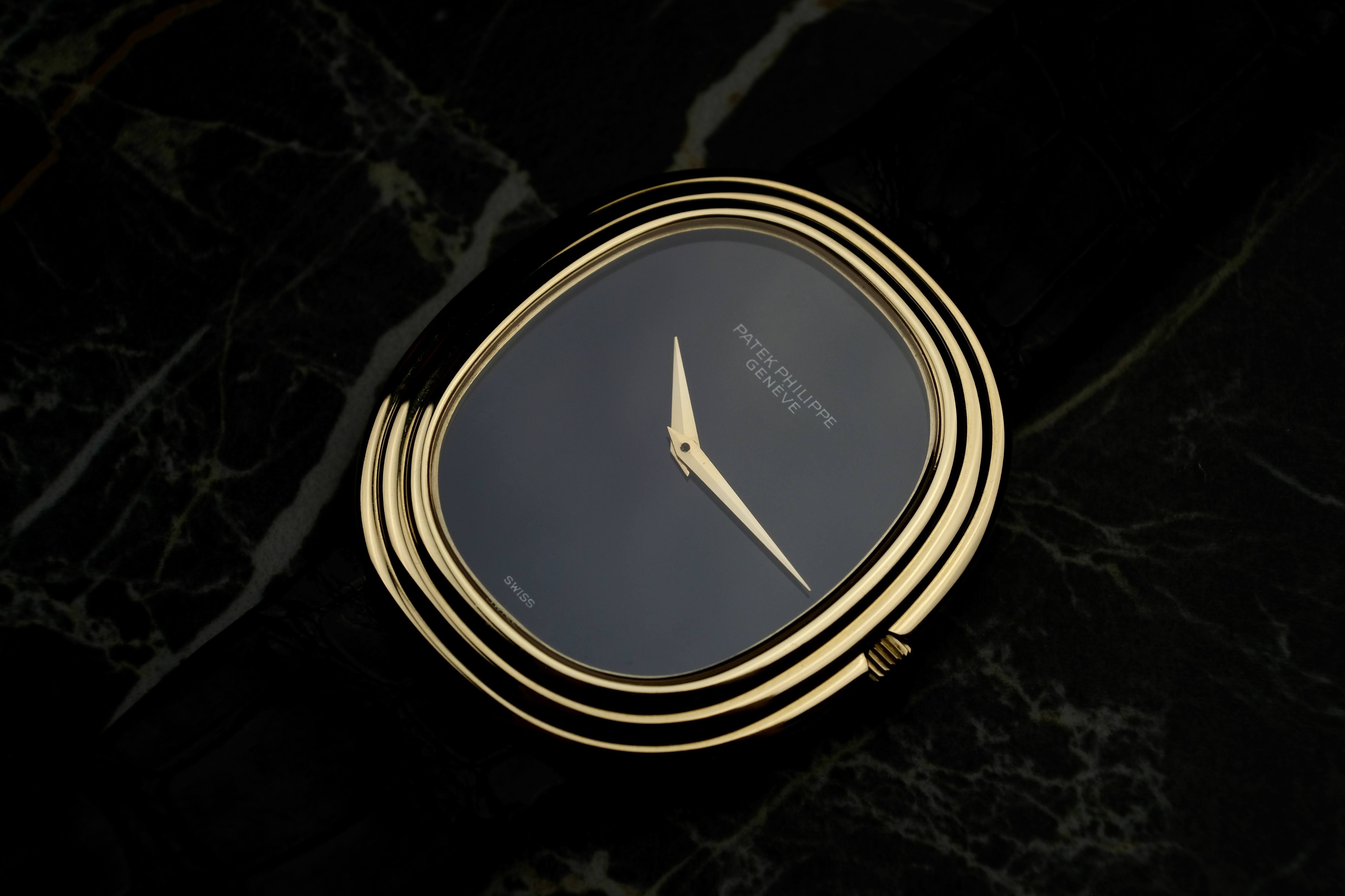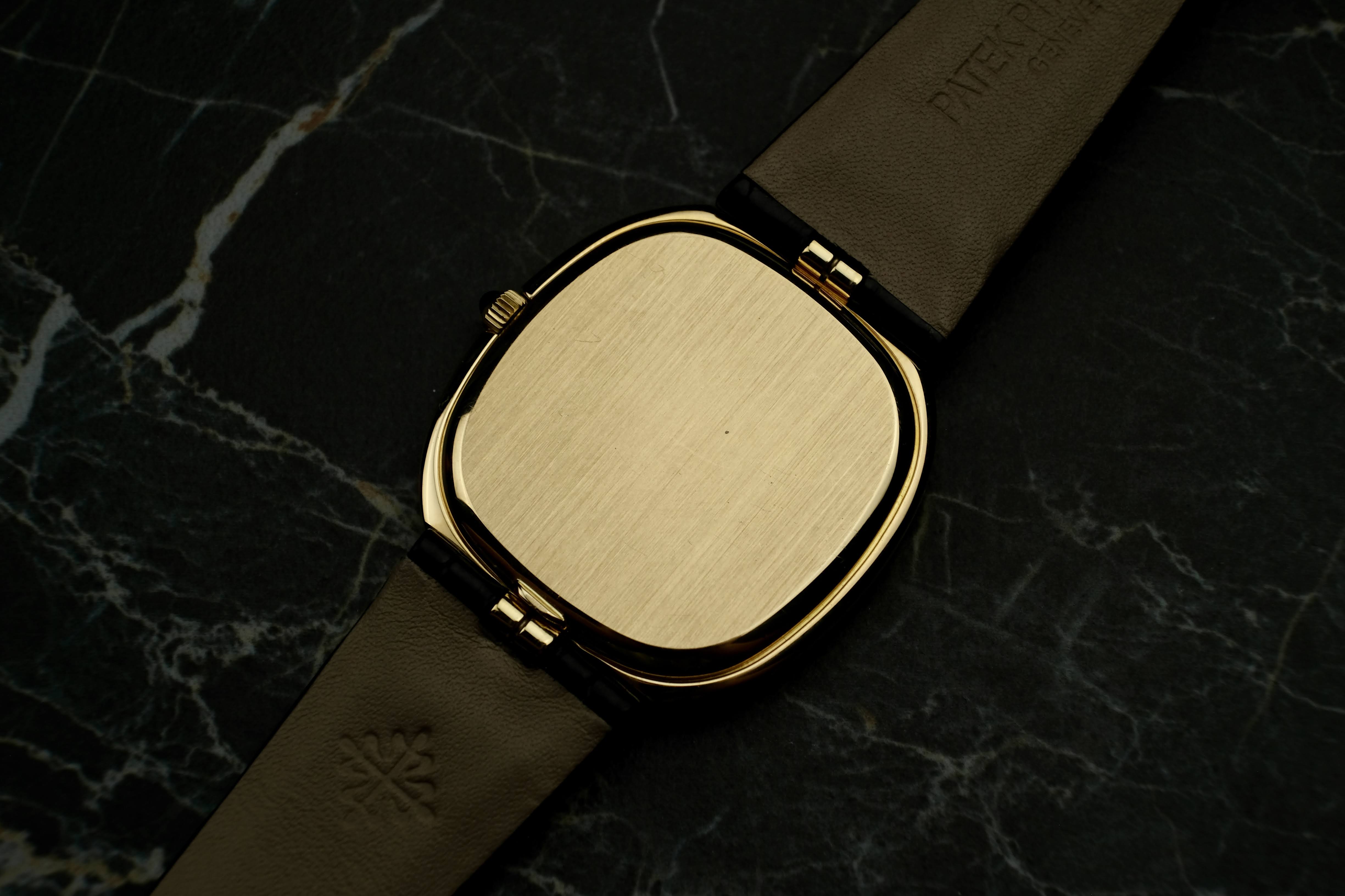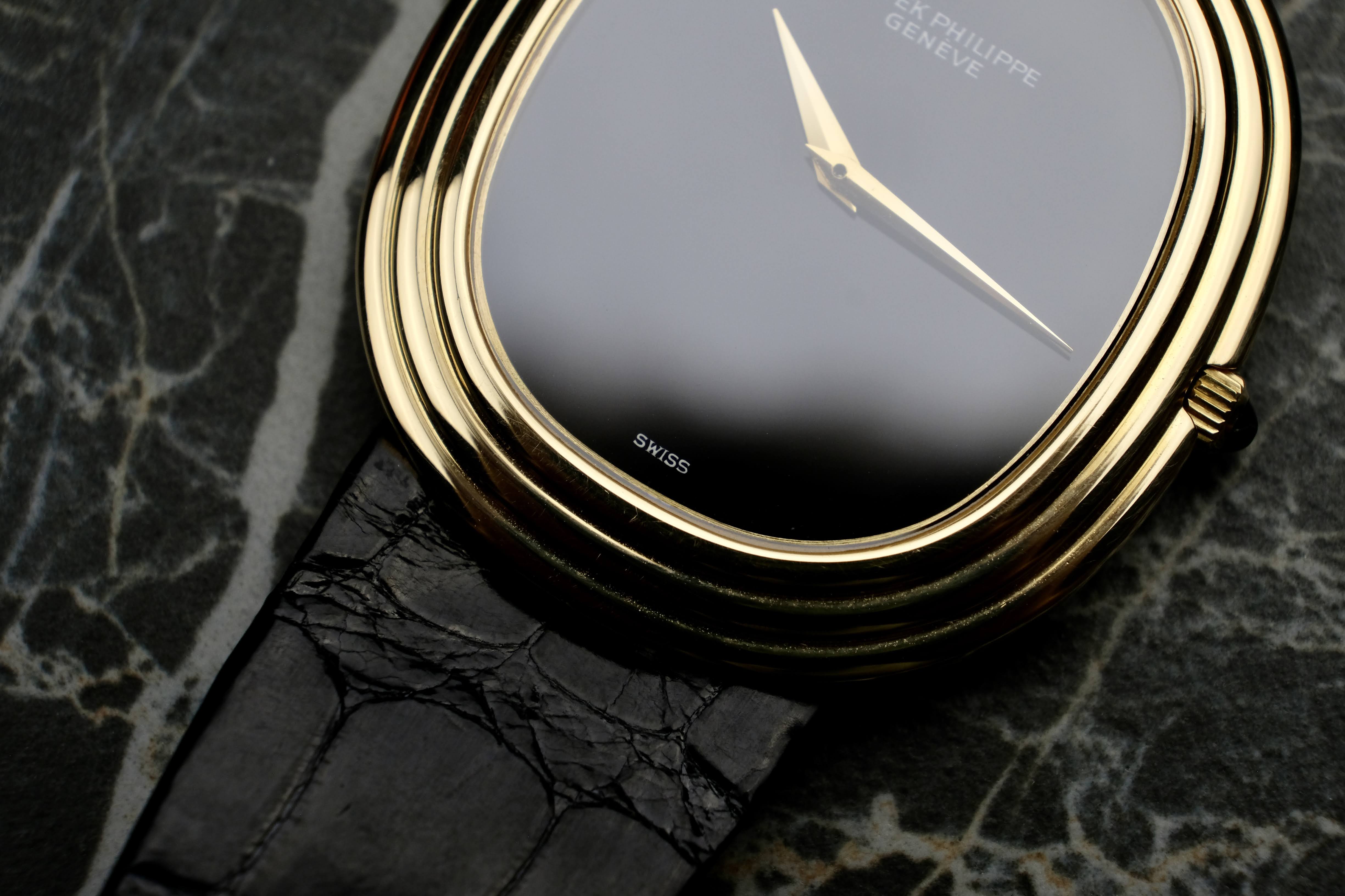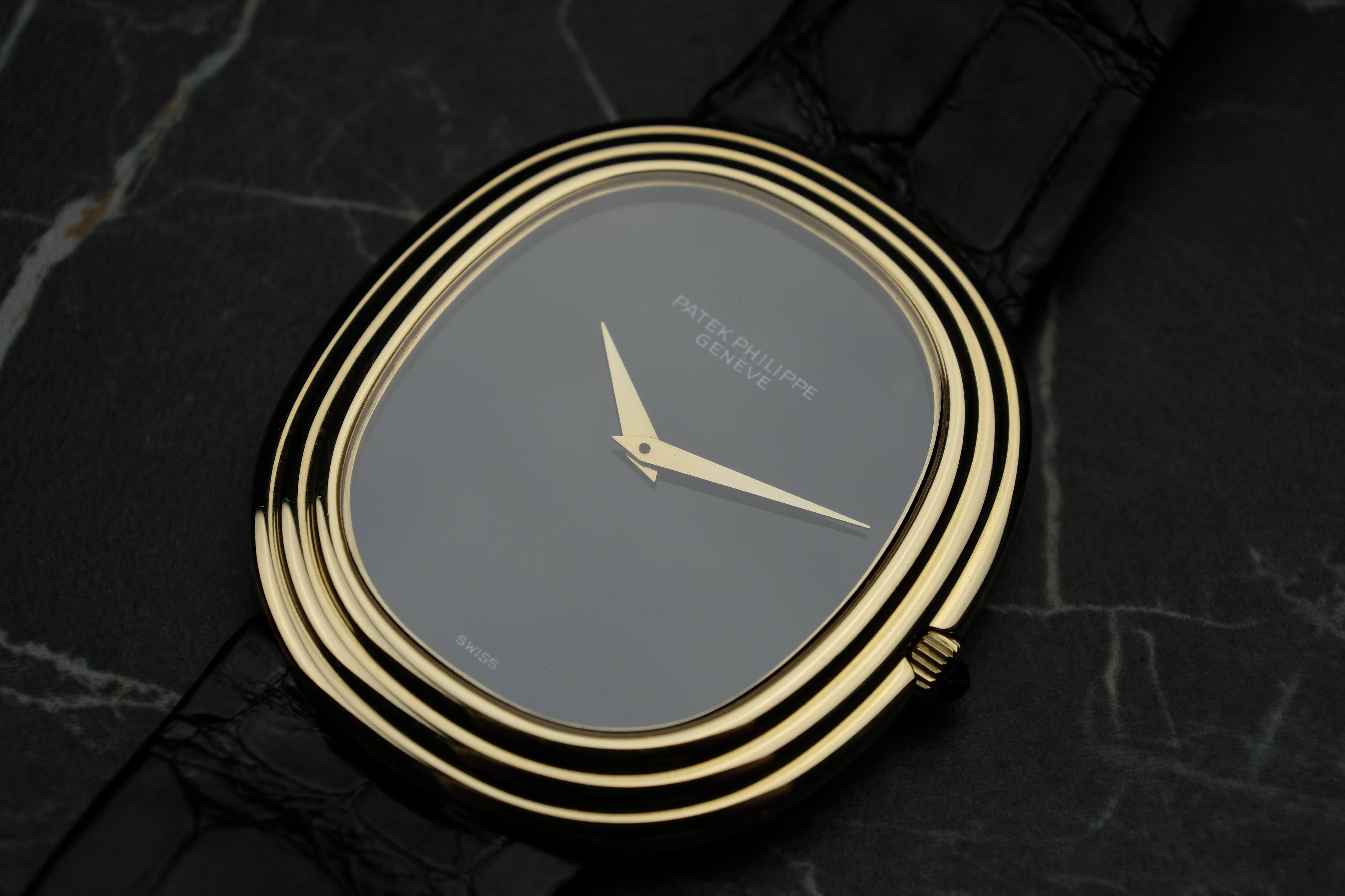 First unveiled in 1968, the Golden Ellipse marked a bold break from the conventional watch shapes of its era. The reference 3634, known as the Grande Golden Ellipse, was produced in 1977 and represents the largest version of the model. It stands among the rarest examples ever made. Crafted in 18k white gold, the case measures 38 by 33.5 millimeters—dimensions that feel remarkably contemporary. Despite its size, the watch remains impressively slim at just over 6 millimeters thick, thanks to the ultra-thin self-winding caliber 28-255C movement—the very same mechanism used in the reference 3700 Nautilus. The case design is distinctive, featuring three slender, curved gadroons that encircle the crystal to create a stepped visual effect. Unlike traditional designs with pronounced lugs, the Ellipse achieves a seamless silhouette, interrupted only where the strap meets the case.