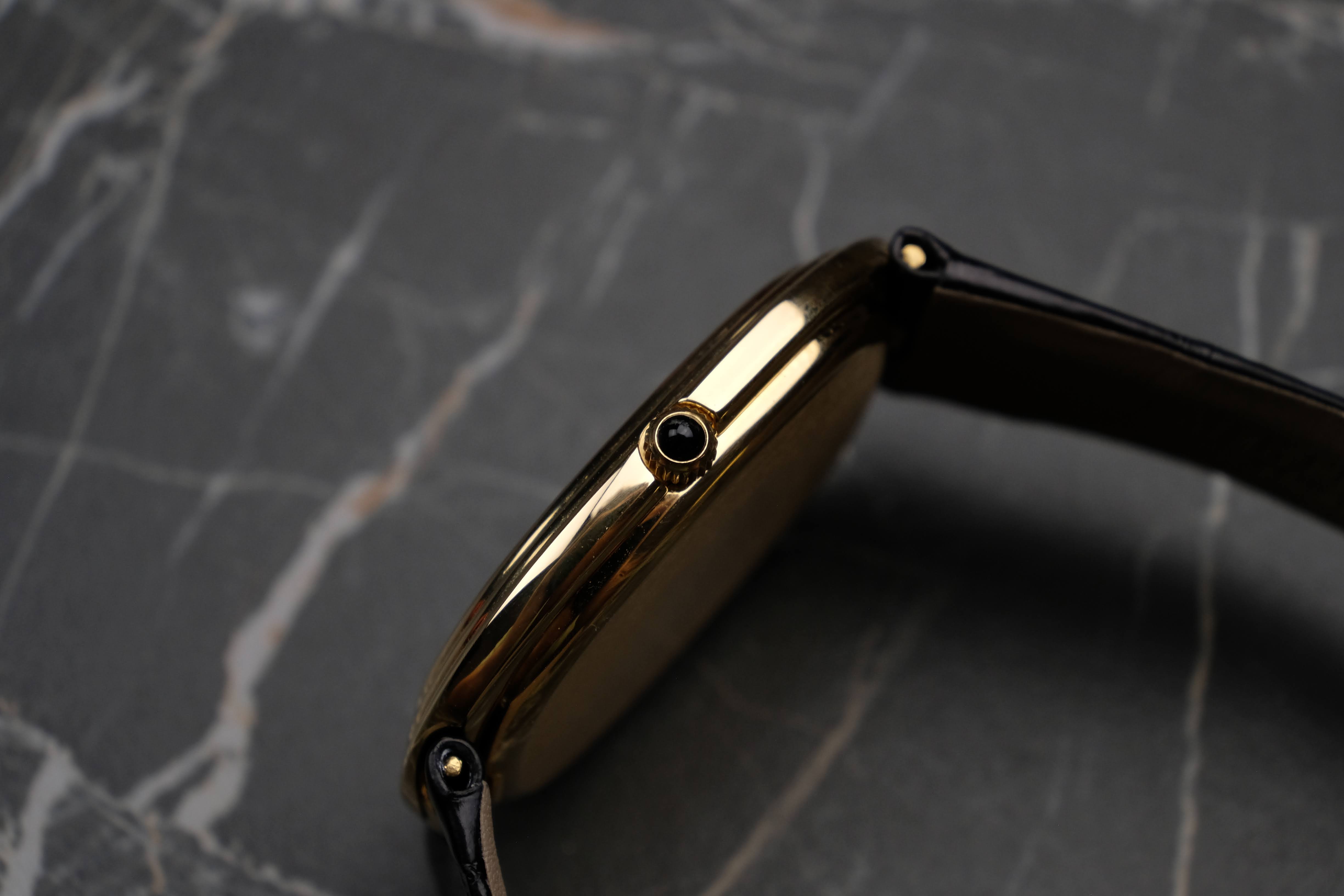 The watch is nice condition overall, the case is polished but has all the hallmarks visible. The crown is in good condition and so are the hands, there is no visible scratch on the crystal. The dial is very nice preserved, only thing to mention is a very little crack at 9 o clock, which only is visible under certain light and angle and does not disturb the rich deep black dial. It comes on the solid gold pin buckle by PP and a fitting strap. Service history unknown, the watch is running fine and nice. You will get the watch in our travel case.