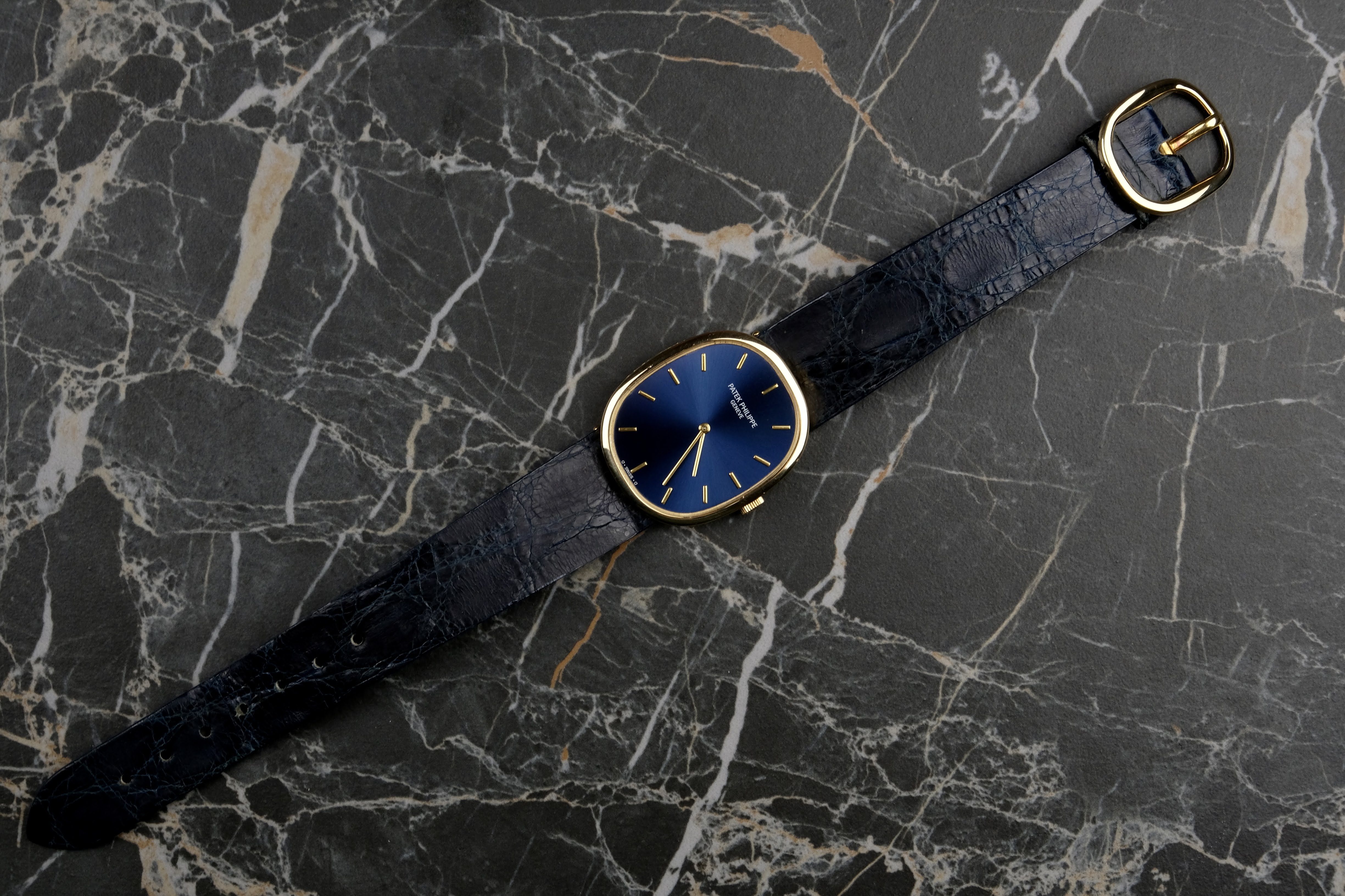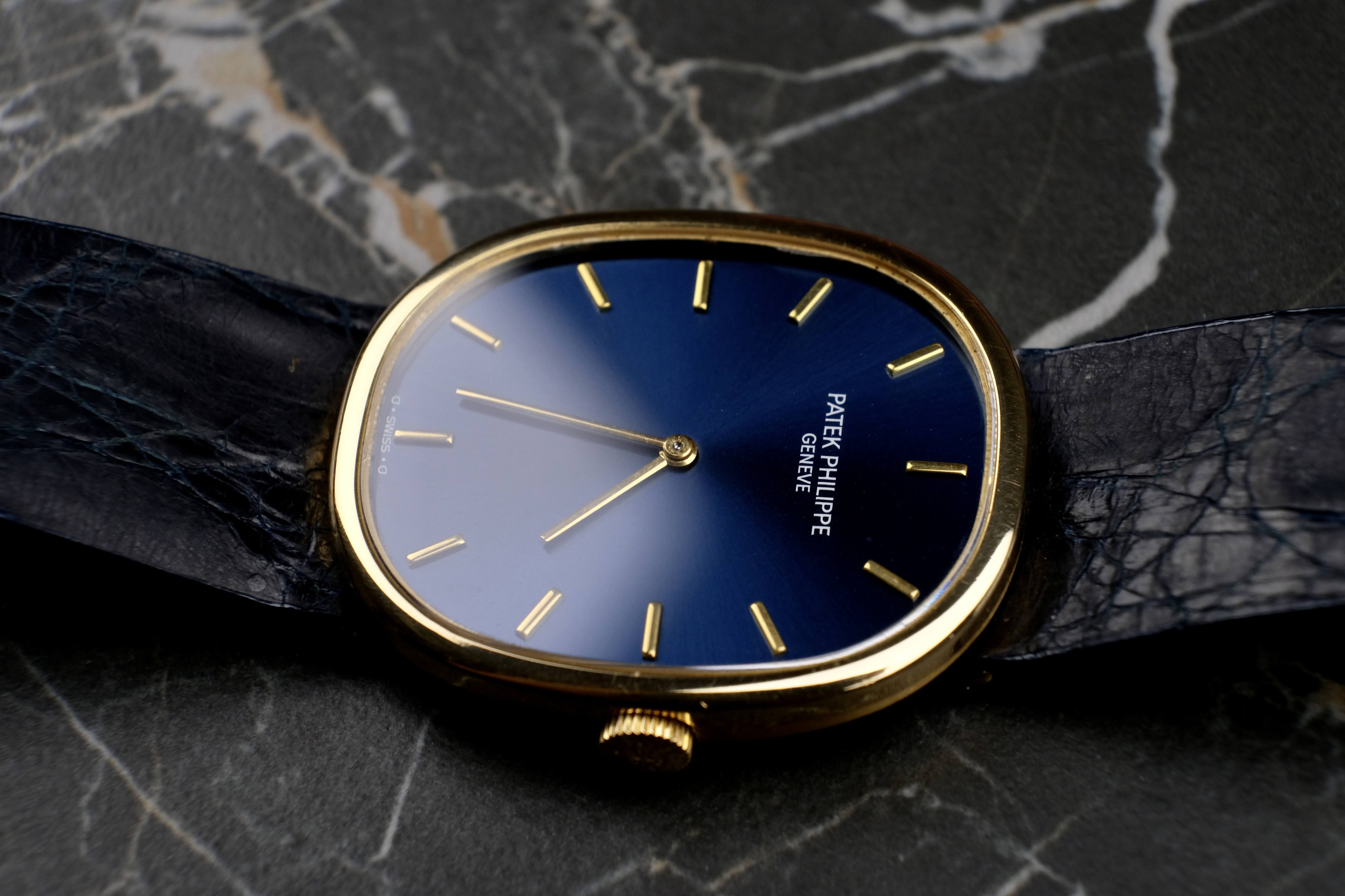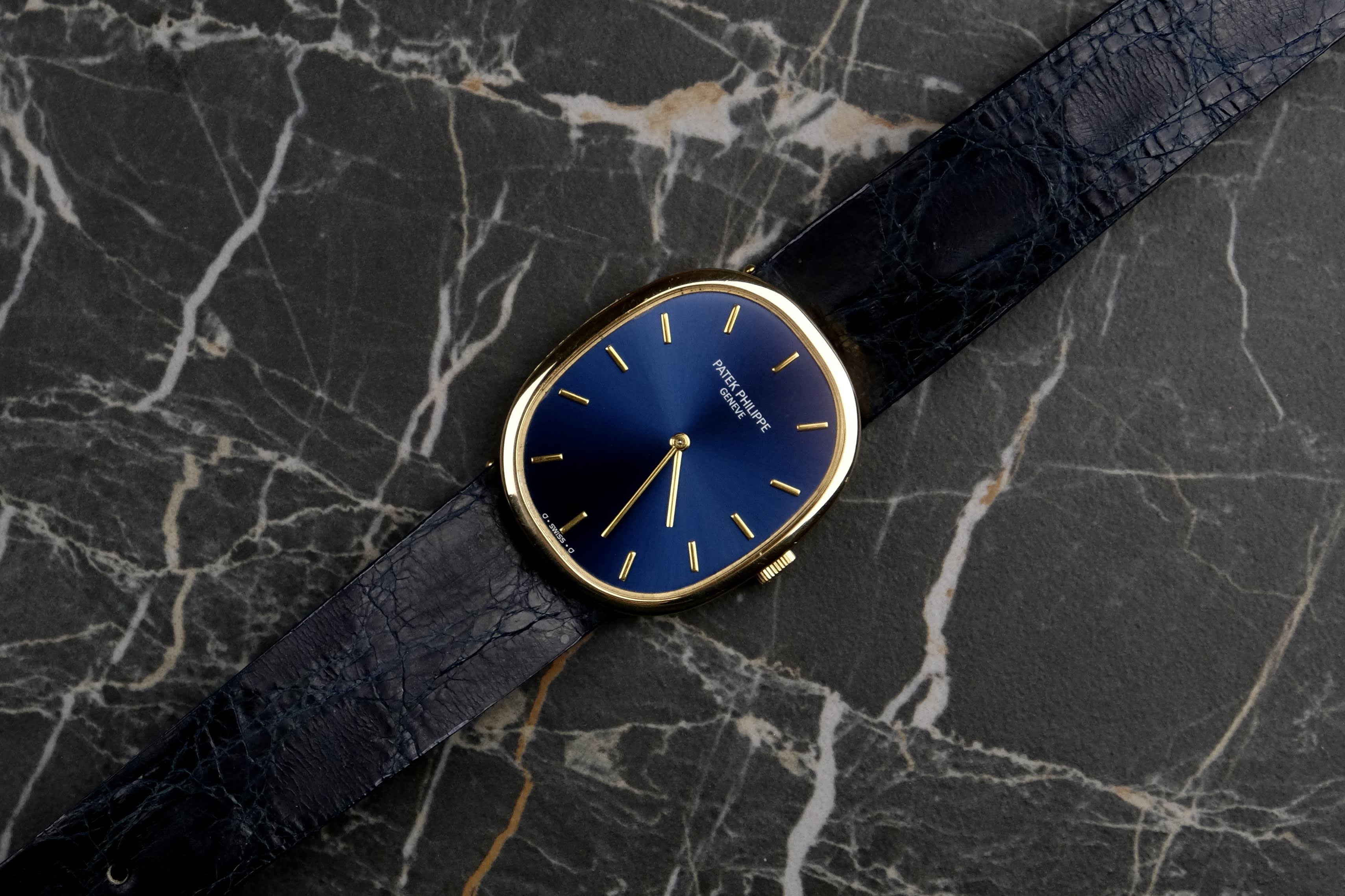 Here we have a perfectly nice Patek Philippe Ellipse reference 3848, which I bought from the first owner family. The watch stayed in the family ever since and was now sold to me. For me, the highlight of every Ellipse is the case made of solid gold and here, combined with the rich dark blue dial, we have a super strong contrast.