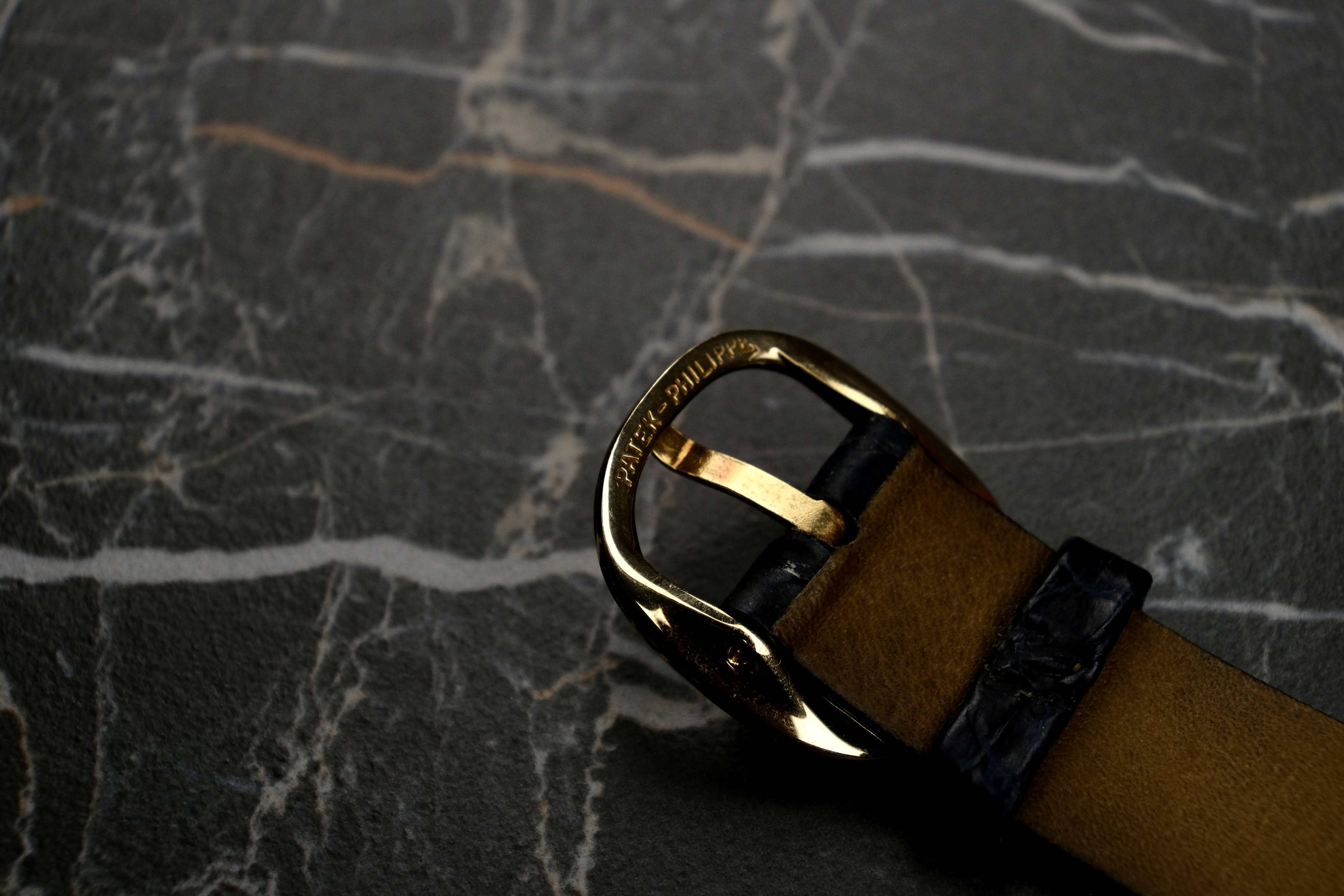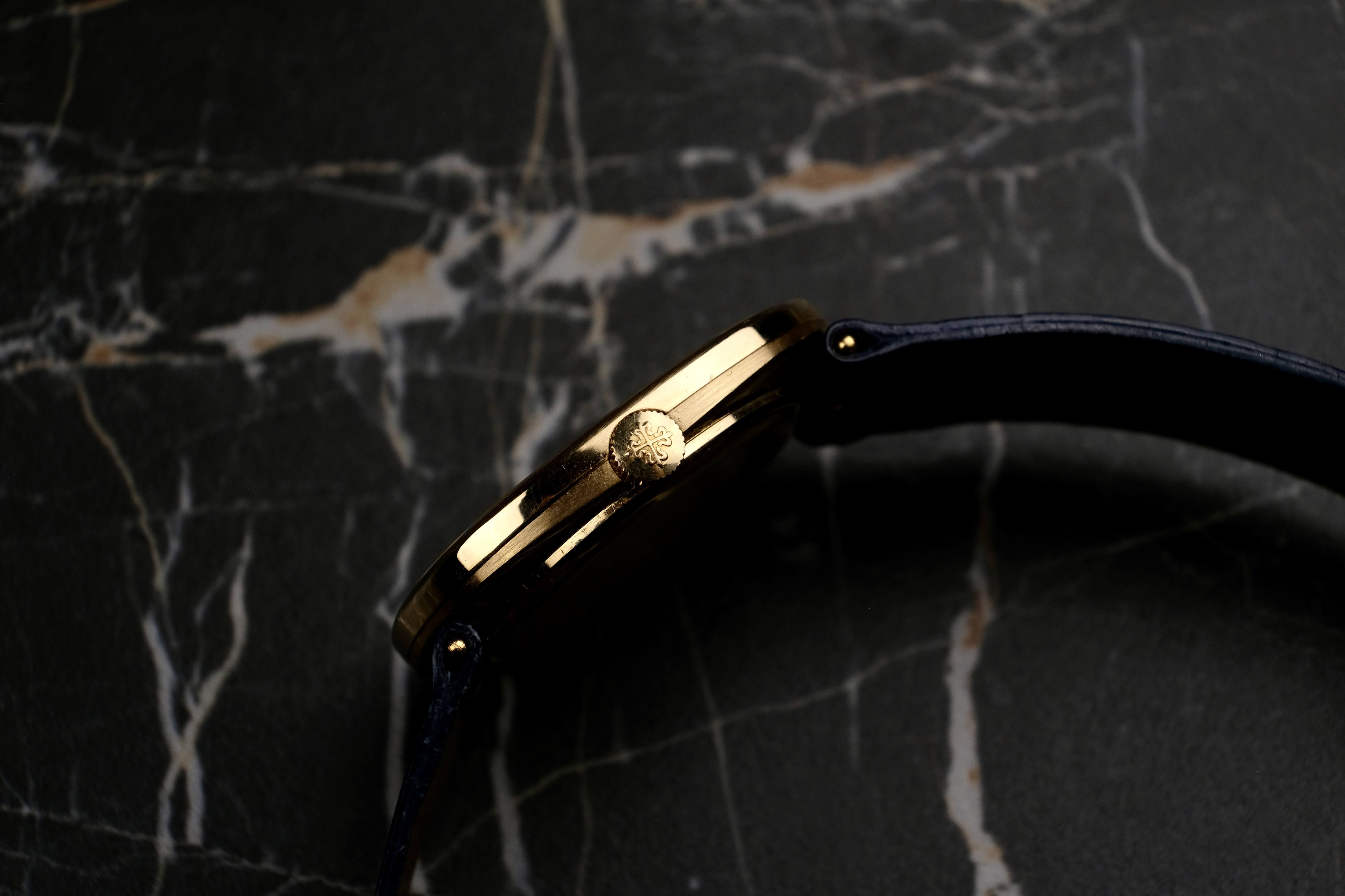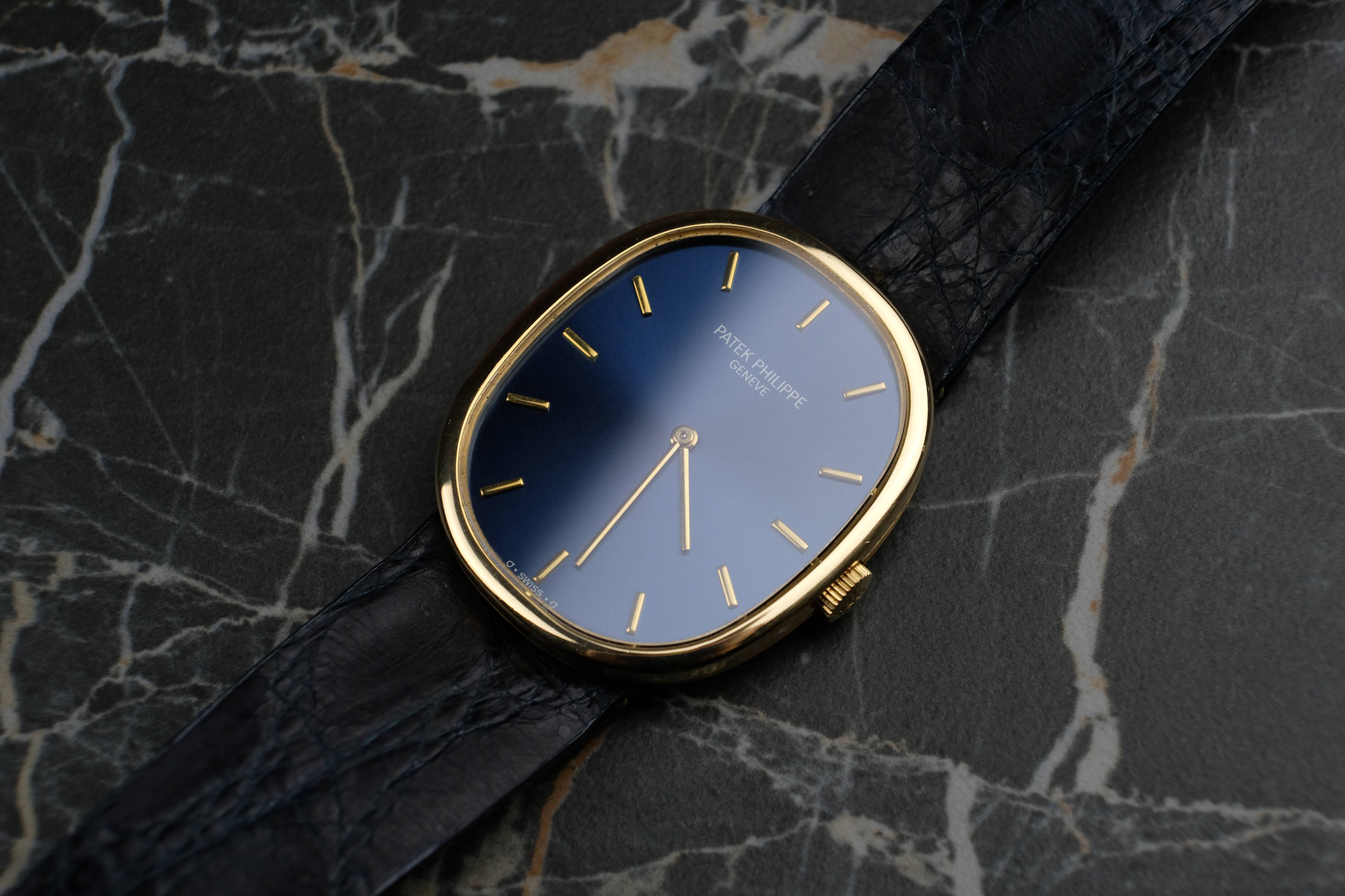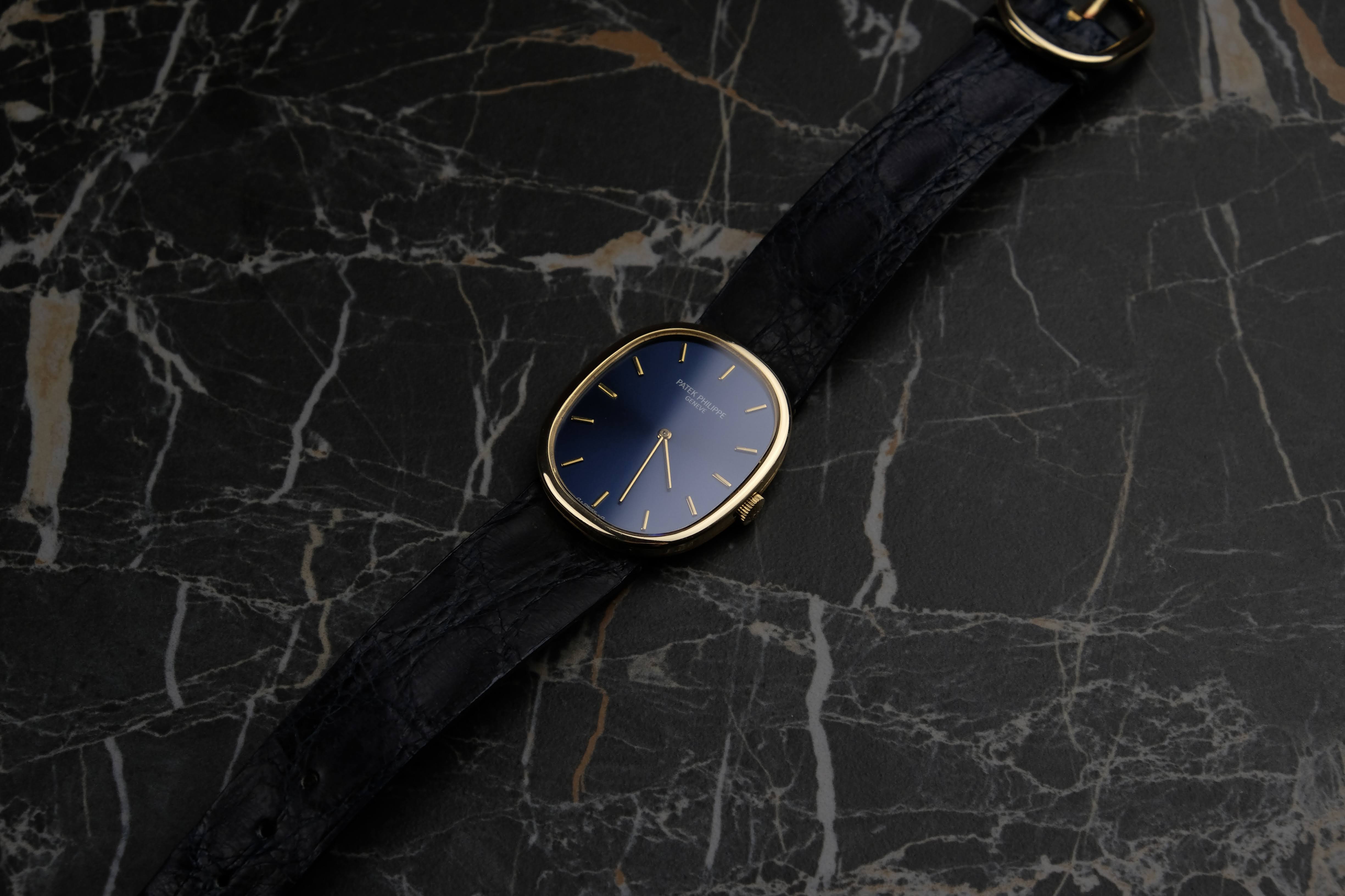 Here we have a perfectly nice Patek Philippe Ellipse reference 3848, which I bought from the first owner family. The watch stayed in the family ever since and was now sold to me. For me, the highlight of every Ellipse is the case made of solid gold and here, combined with the rich dark blue dial, we have a super strong contrast.