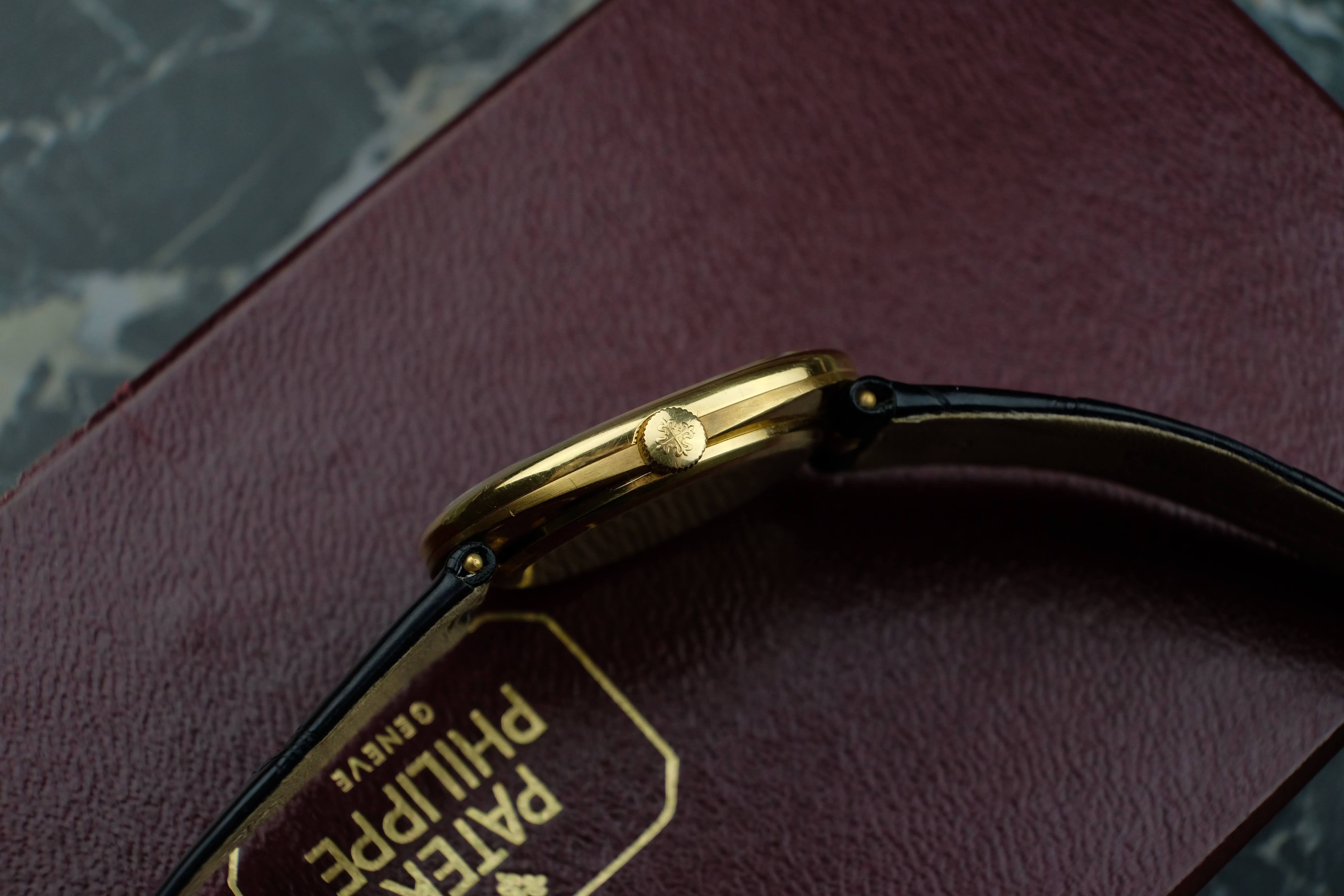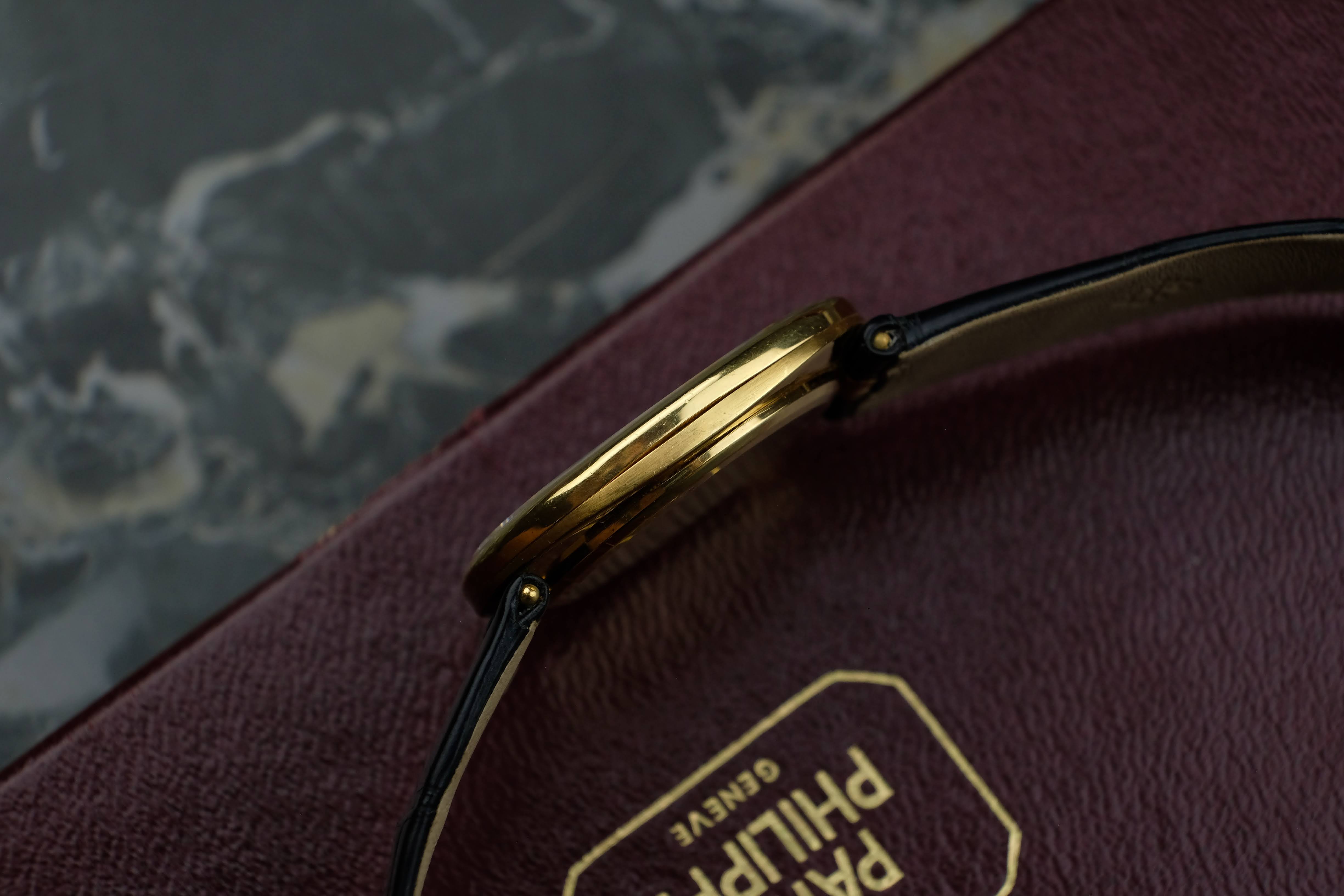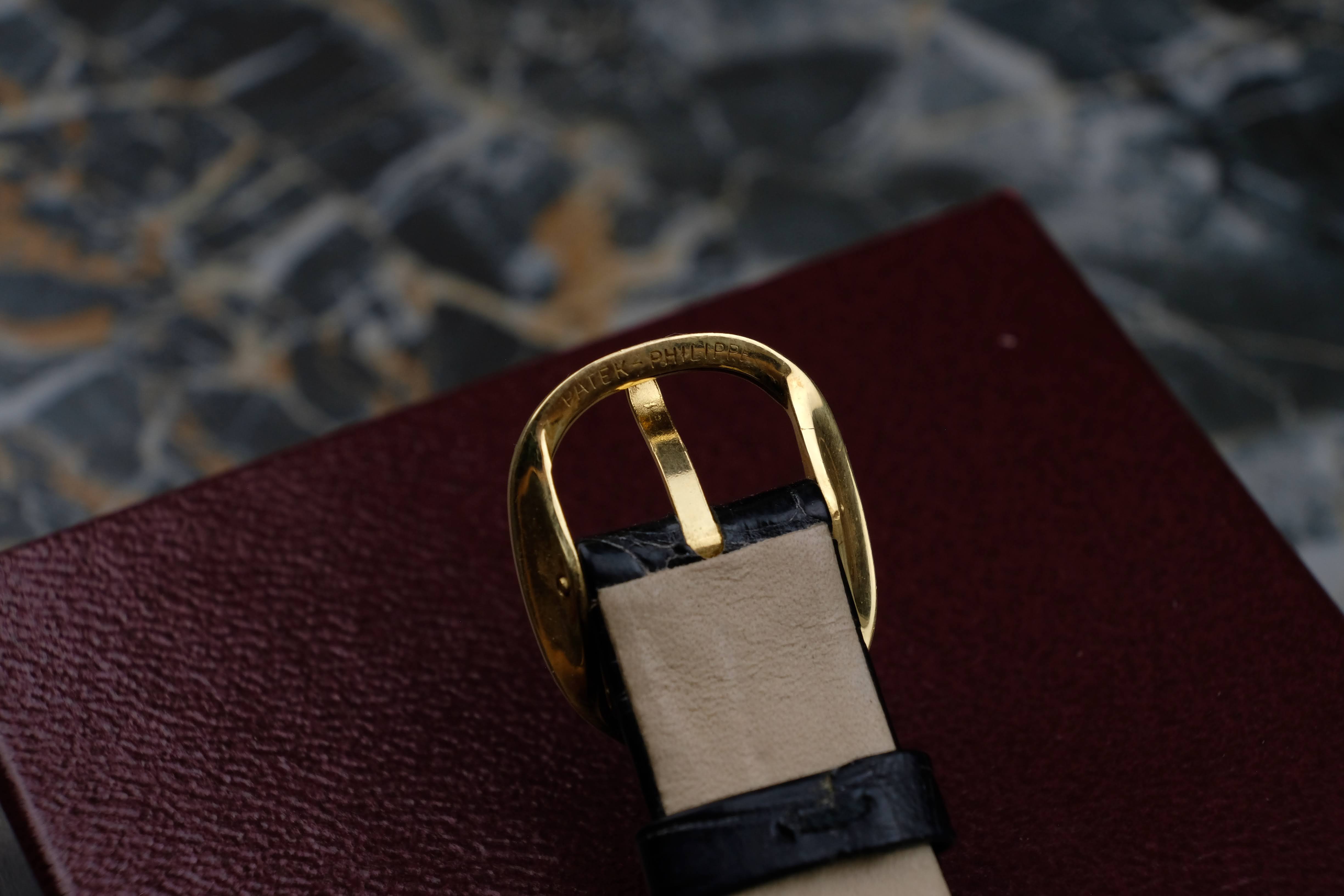 The case is very well preserved, the case back still has the factory edges that are often polished away. Deep hallmarks and the brushed / polished change between the top and bottom case are also reflecting the very good conditions. The dial is in good conditions and so are the hands, the crown is sharp and well preserved as well. The original solid gold pin buckle is in very good conditions, you will get the watch on a Patek Philippe strap fitting 19cm wrists. The service history is not knows, the watch works absolutely fine. You will get the watch in its Patek Philippe box.