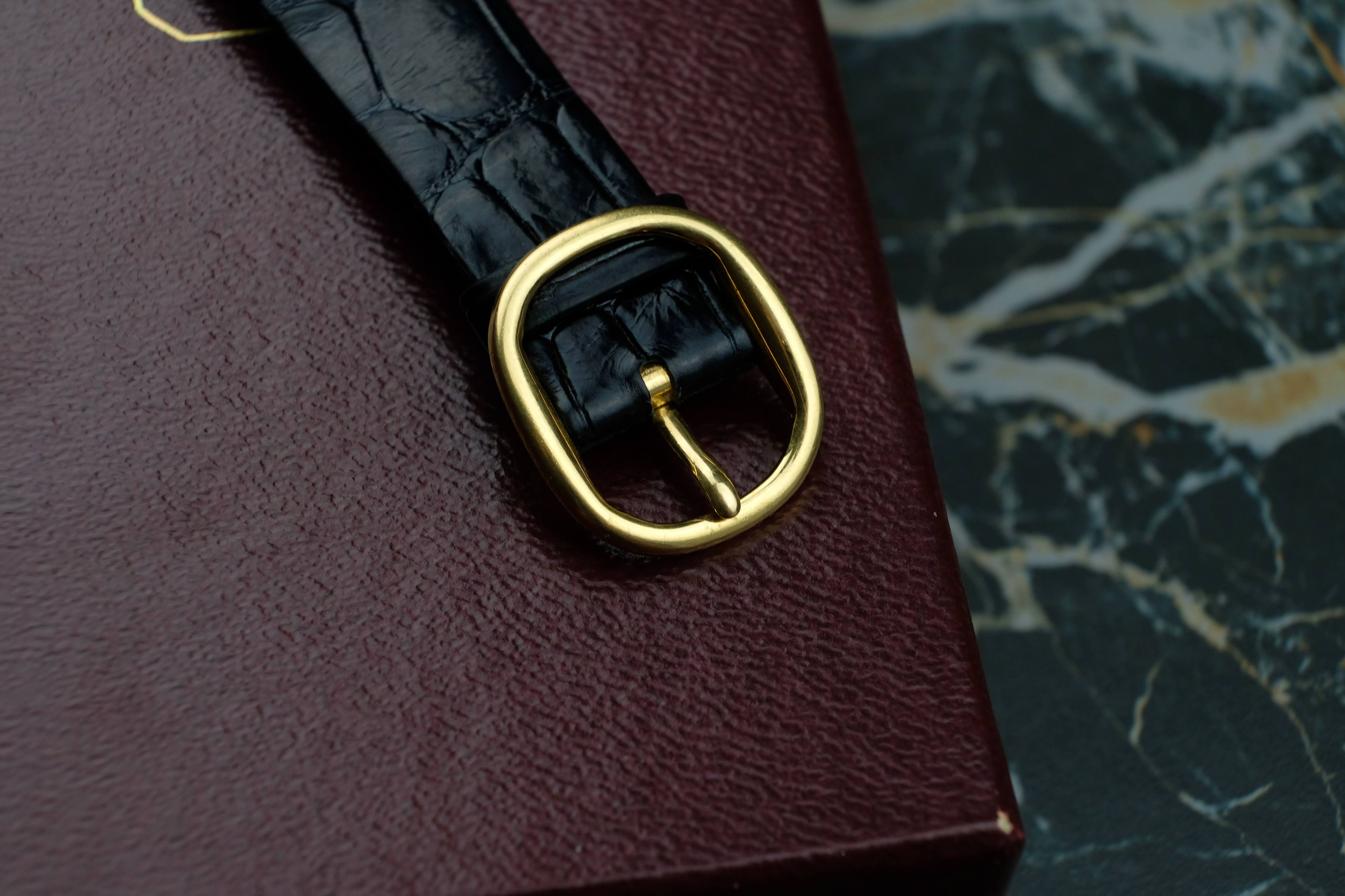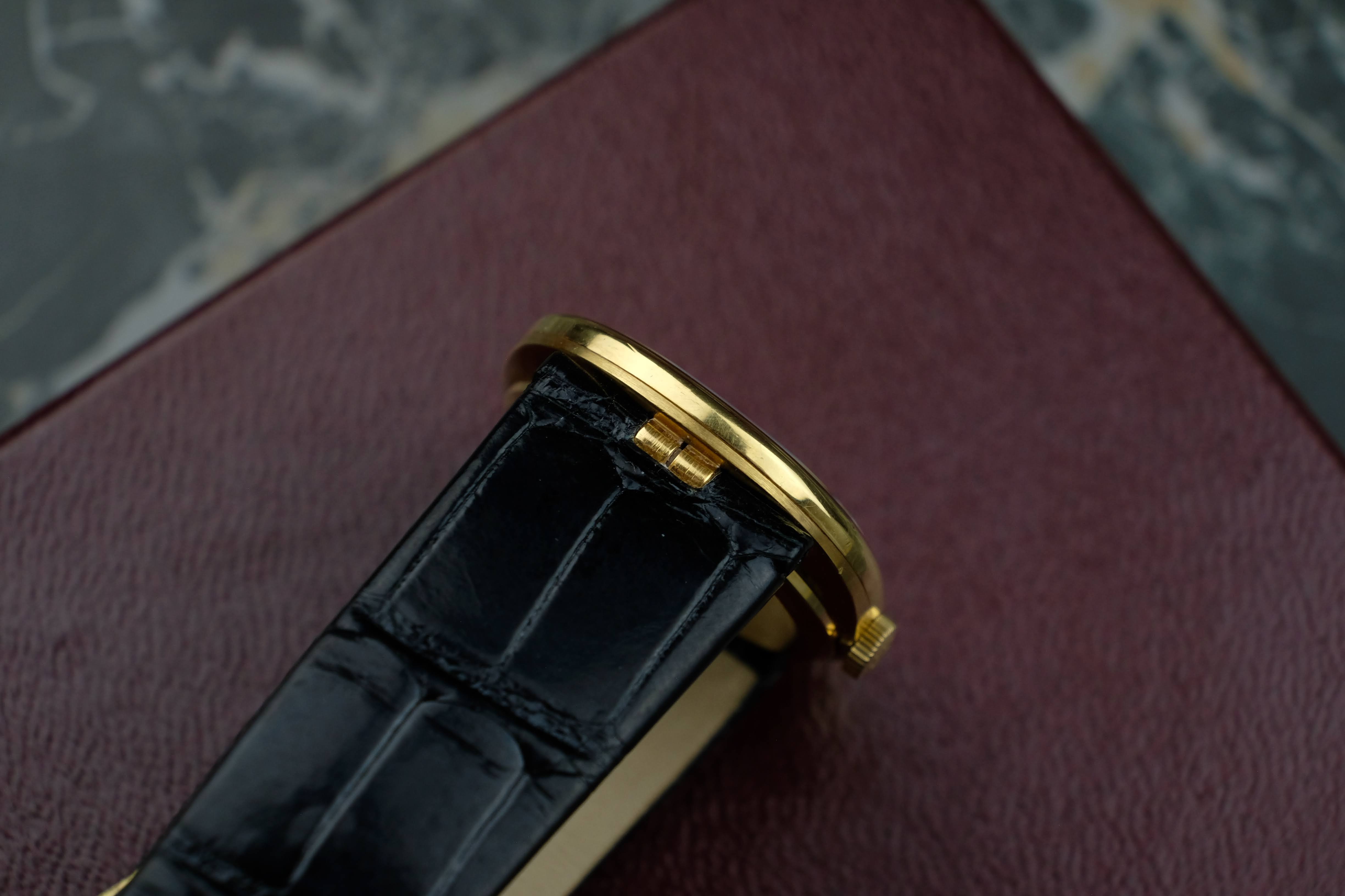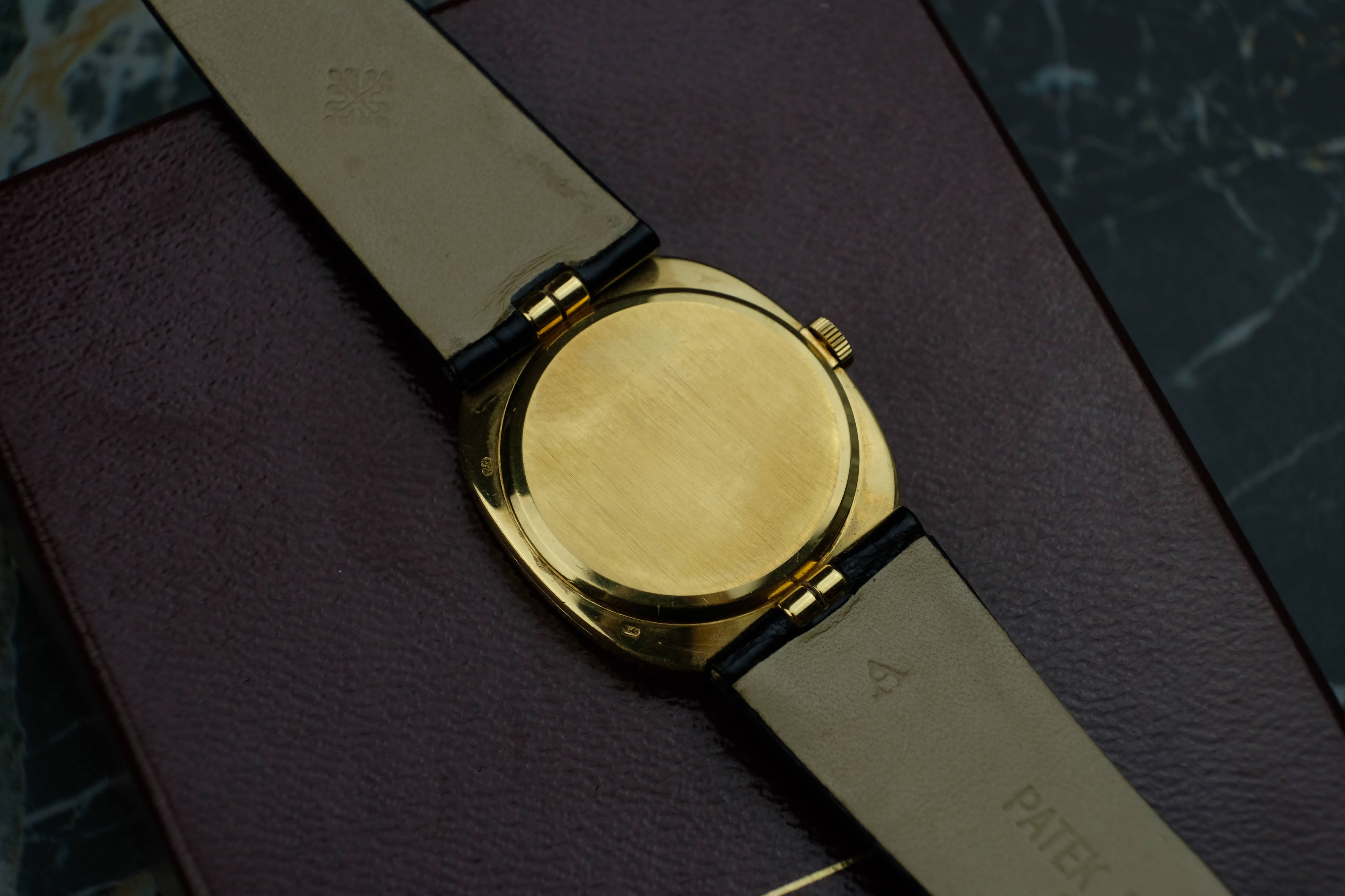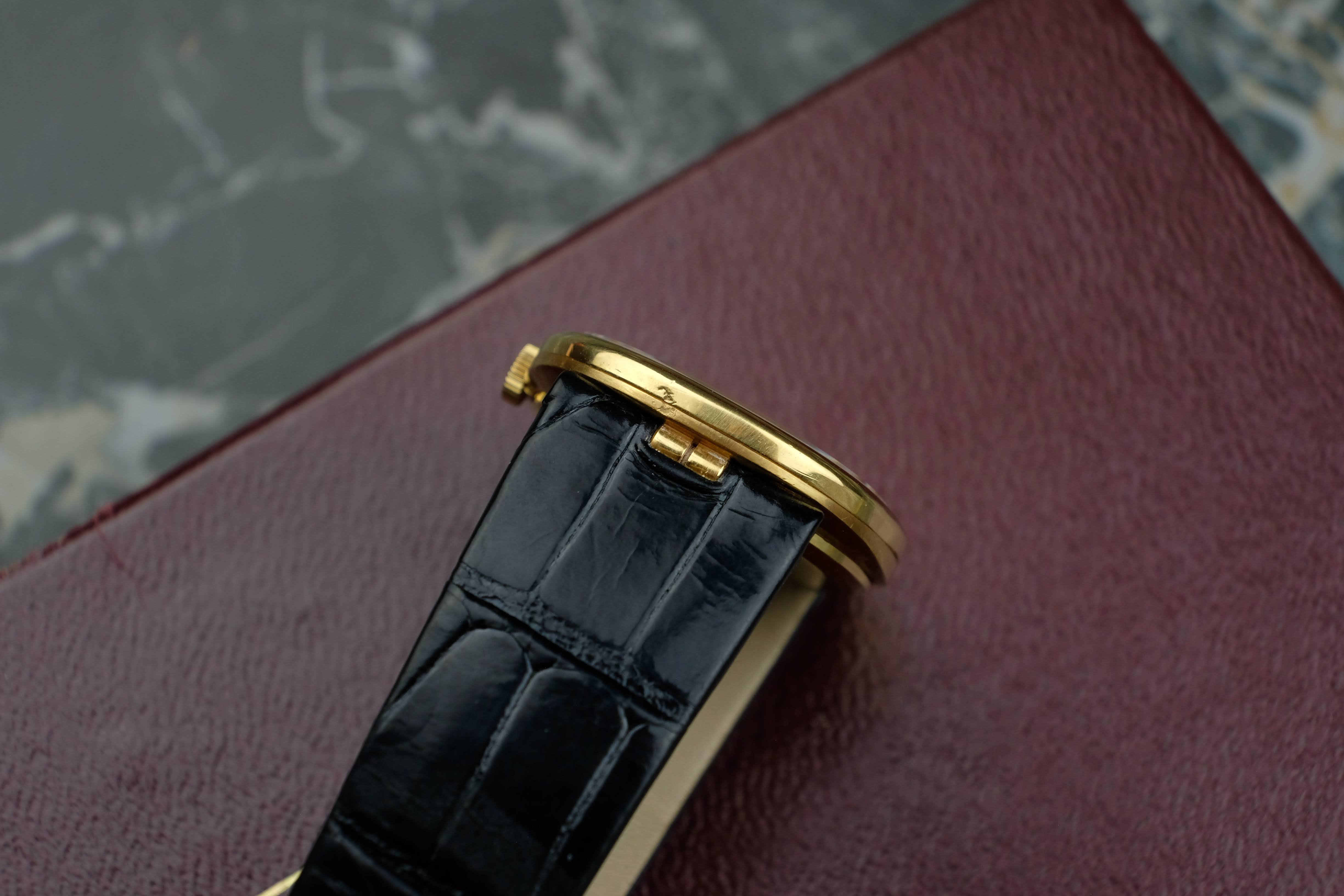 The case is very well preserved, the case back still has the factory edges that are often polished away. Deep hallmarks and the brushed / polished change between the top and bottom case are also reflecting the very good conditions. The dial is in good conditions and so are the hands, the crown is sharp and well preserved as well. The original solid gold pin buckle is in very good conditions, you will get the watch on a Patek Philippe strap fitting 19cm wrists. The service history is not knows, the watch works absolutely fine. You will get the watch in its Patek Philippe box.