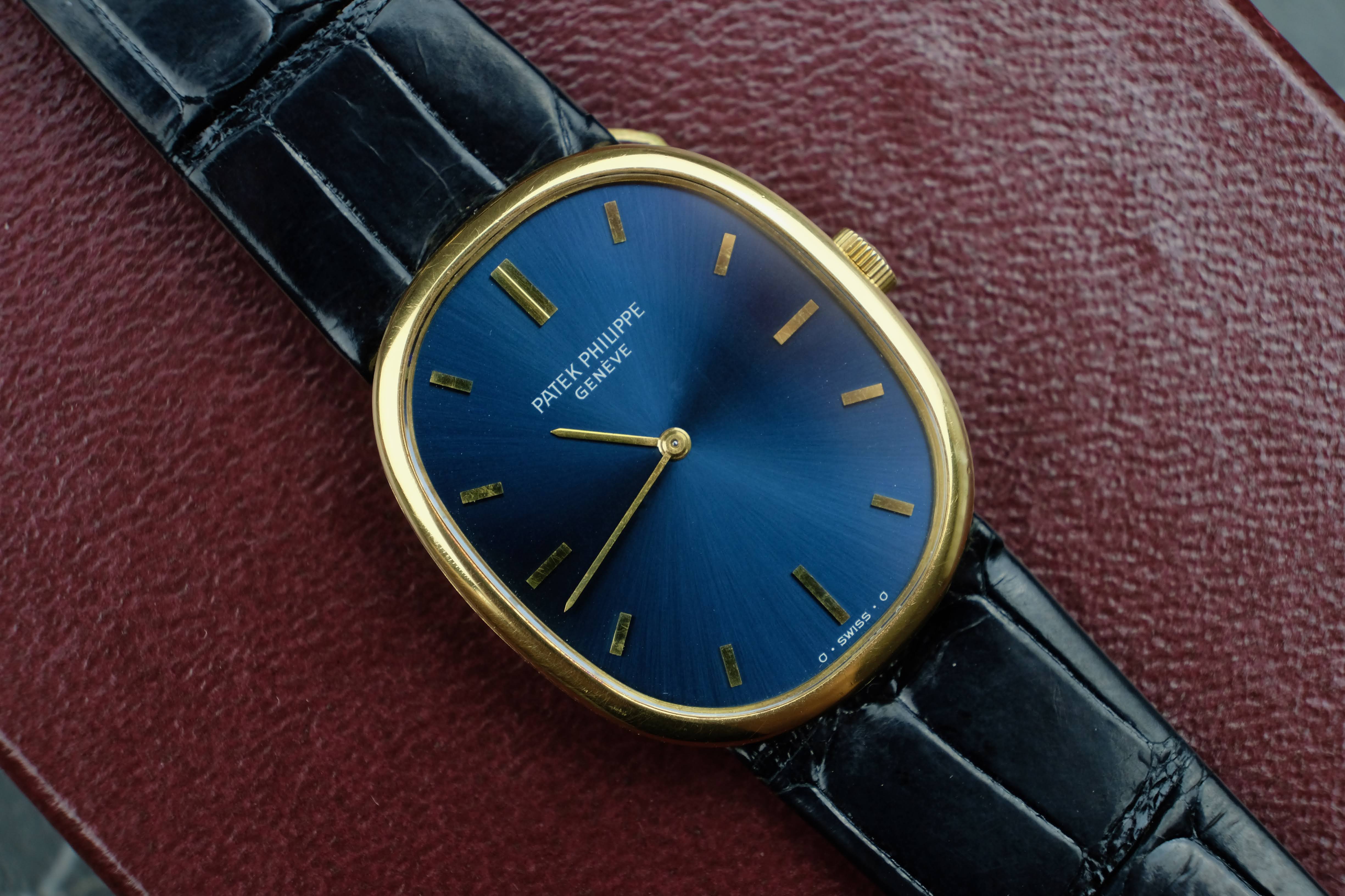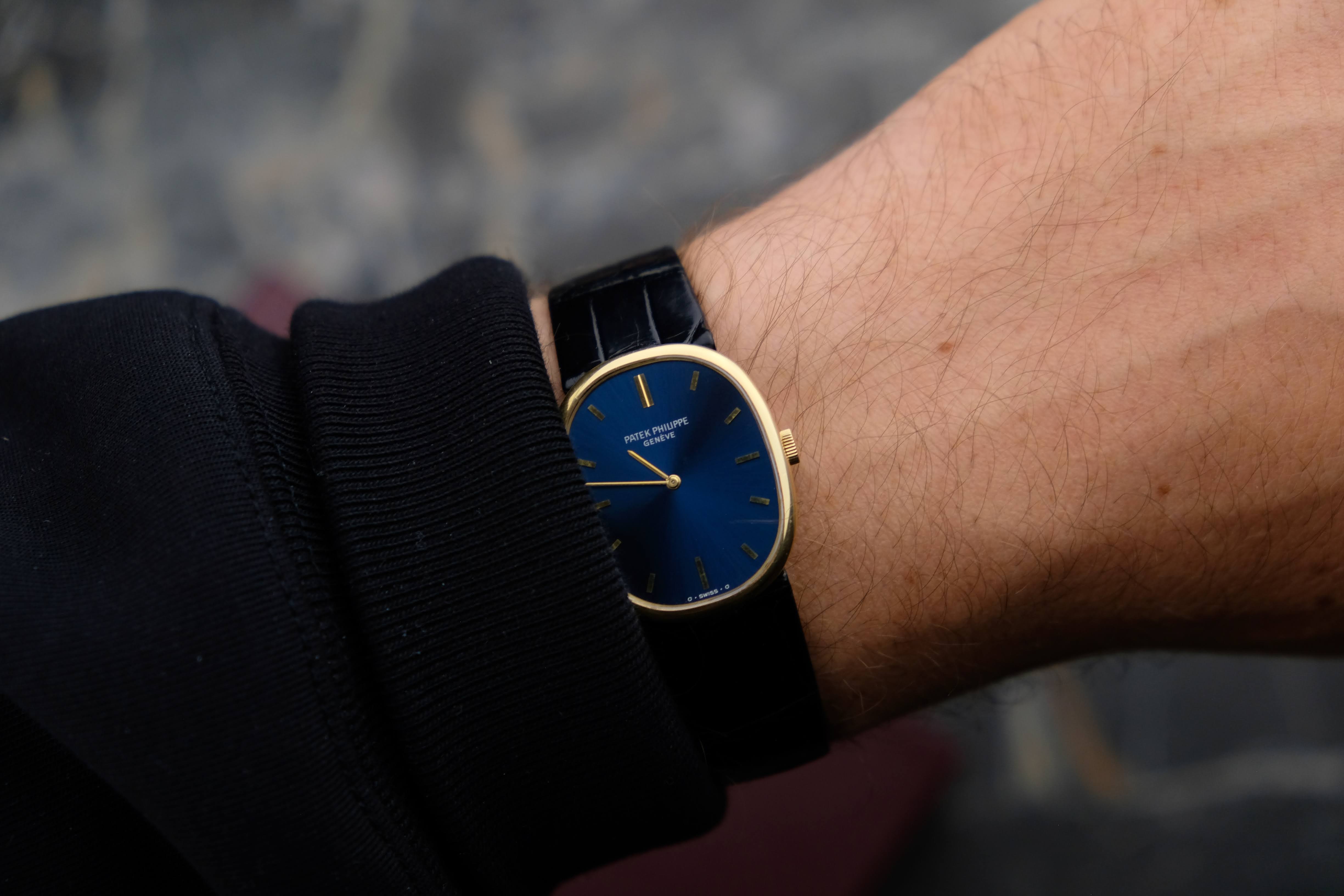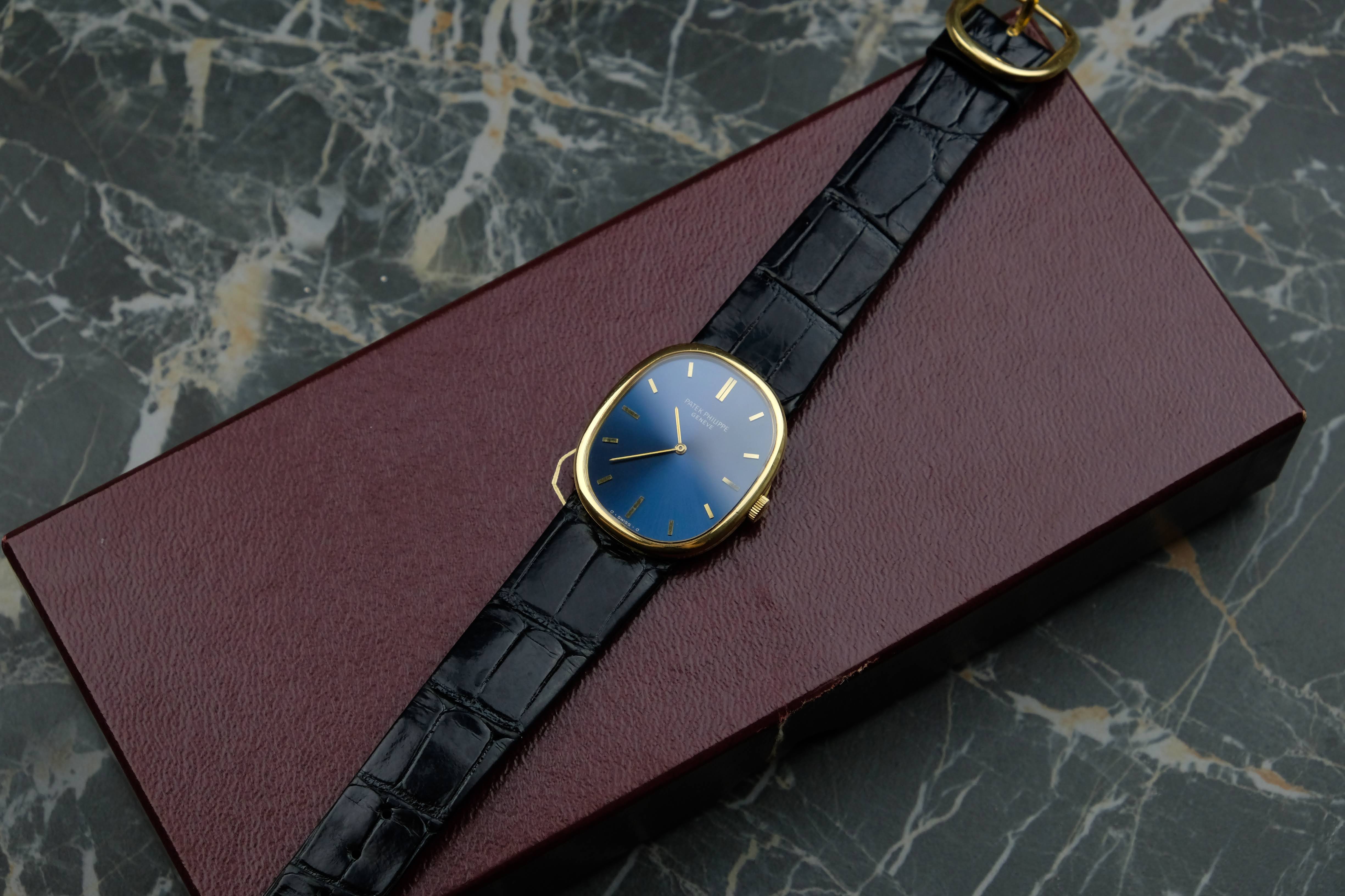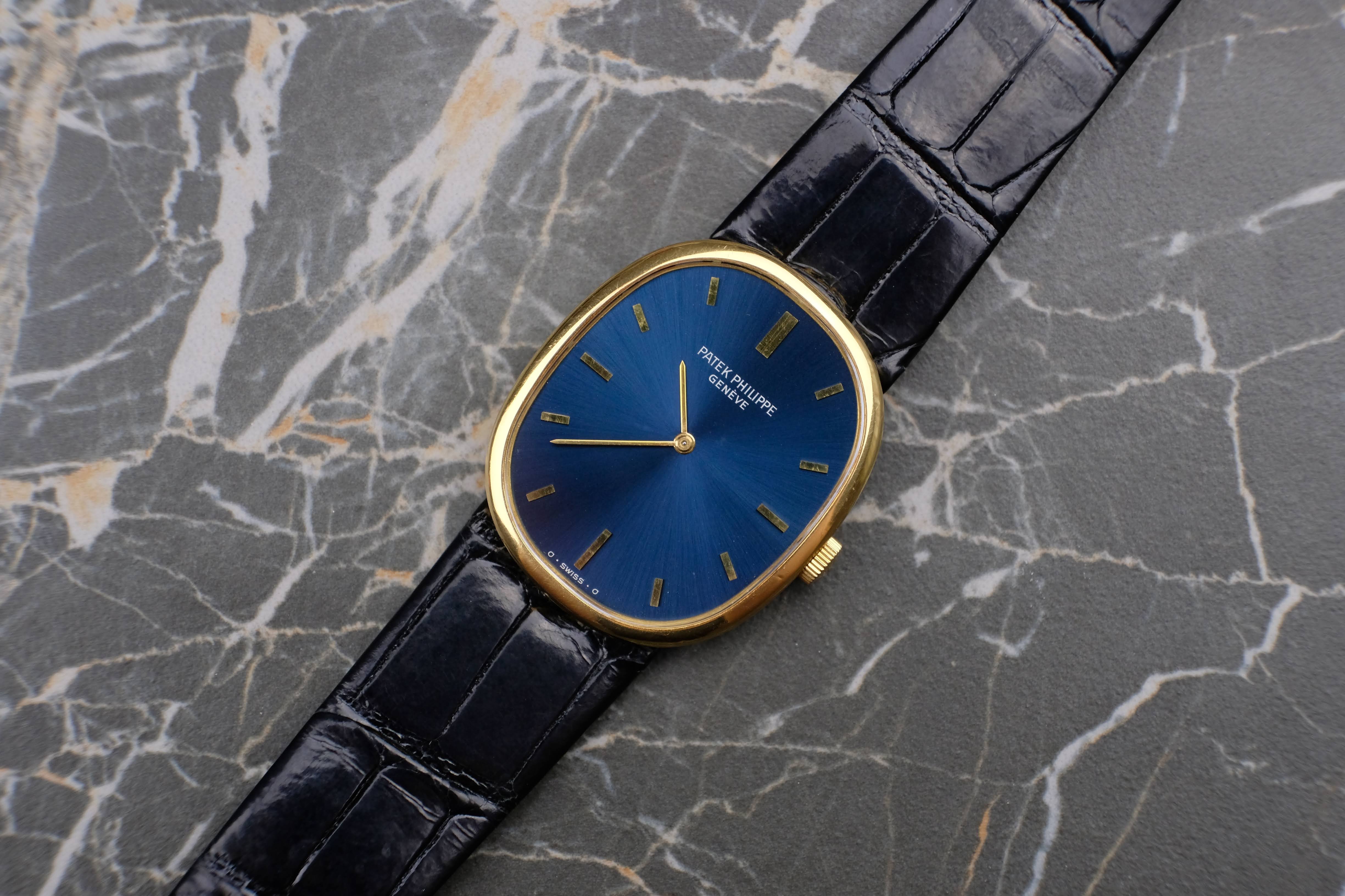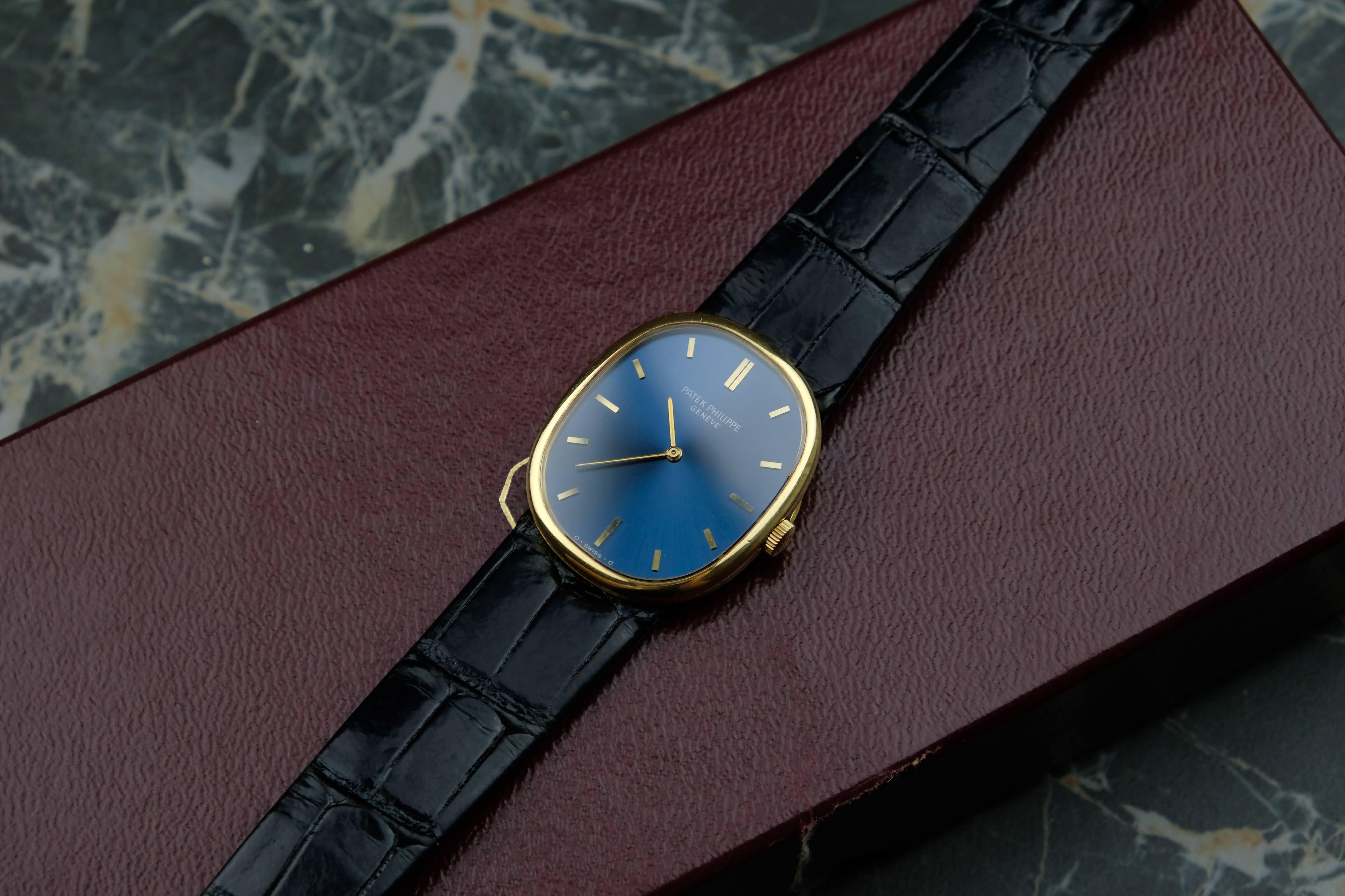 For sale is a very well preserved, legendary and iconic Patek Philippe Ellipse 3848. With its perfect dimensions and the deep and rich blue sunburst dial, this watch is a true classic and is getting more and more into the focus. Check out the solid gold pin buckle reflecting the shape of the Ellipse case, this watch is well-thought-out.