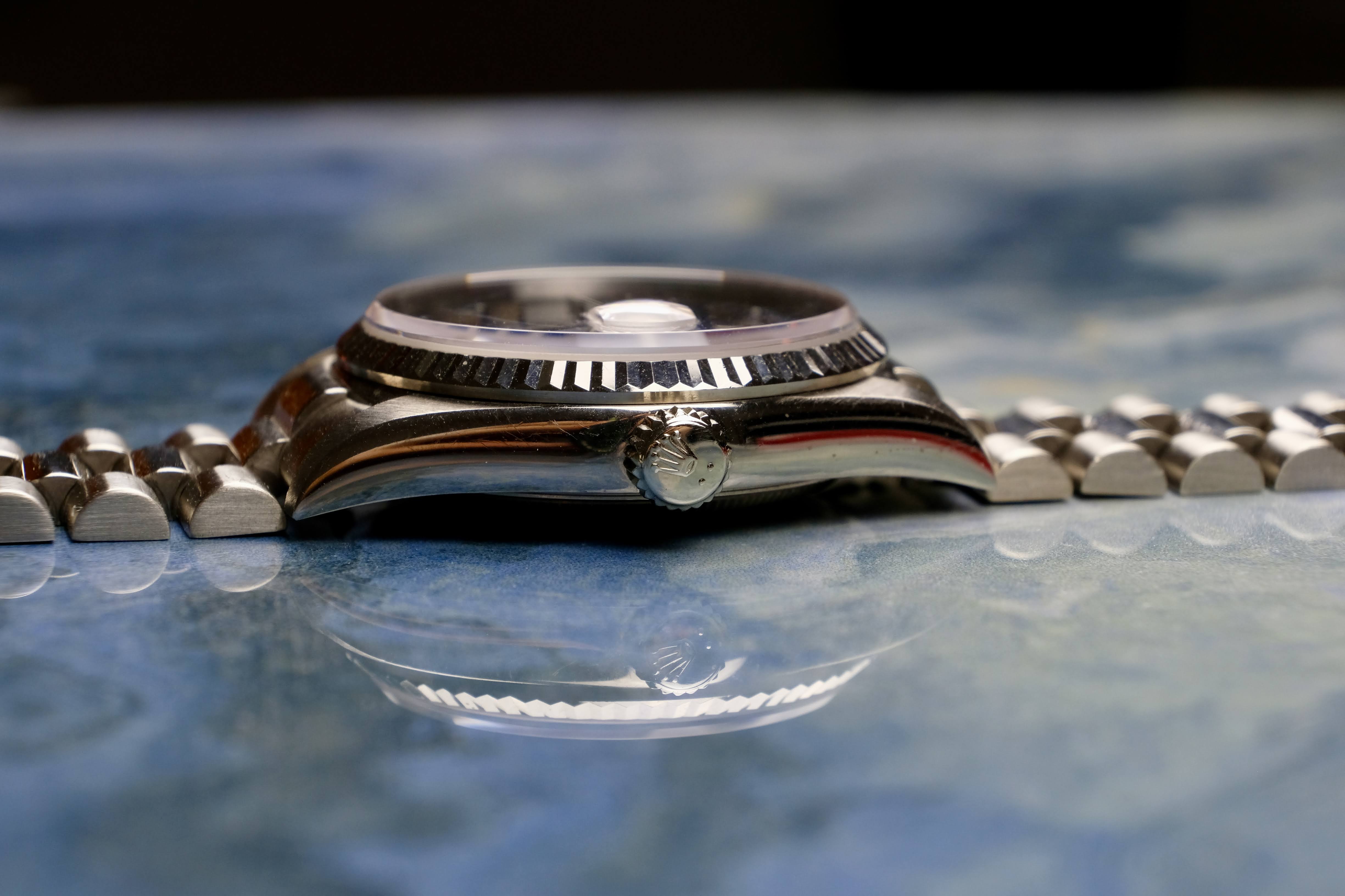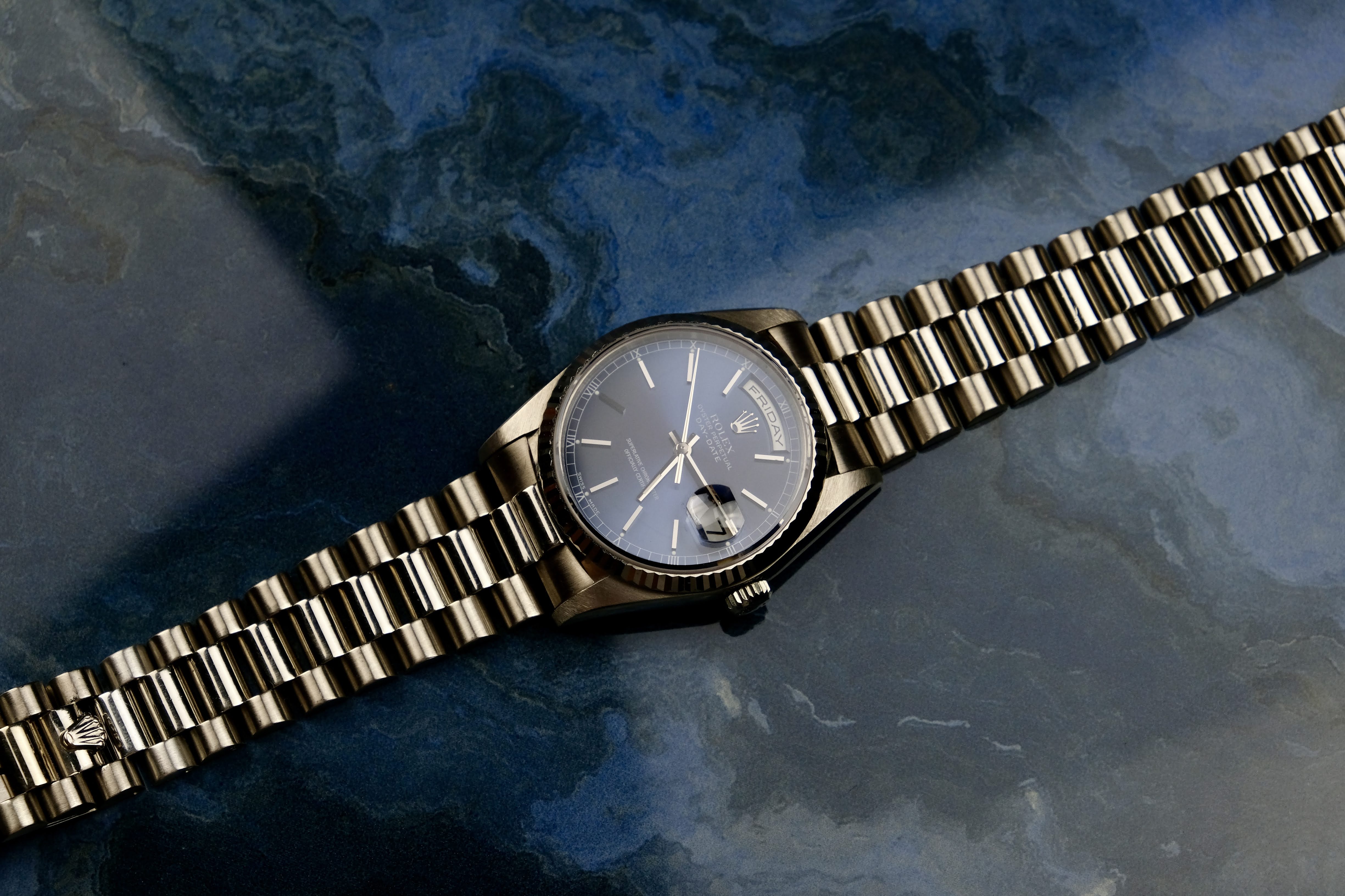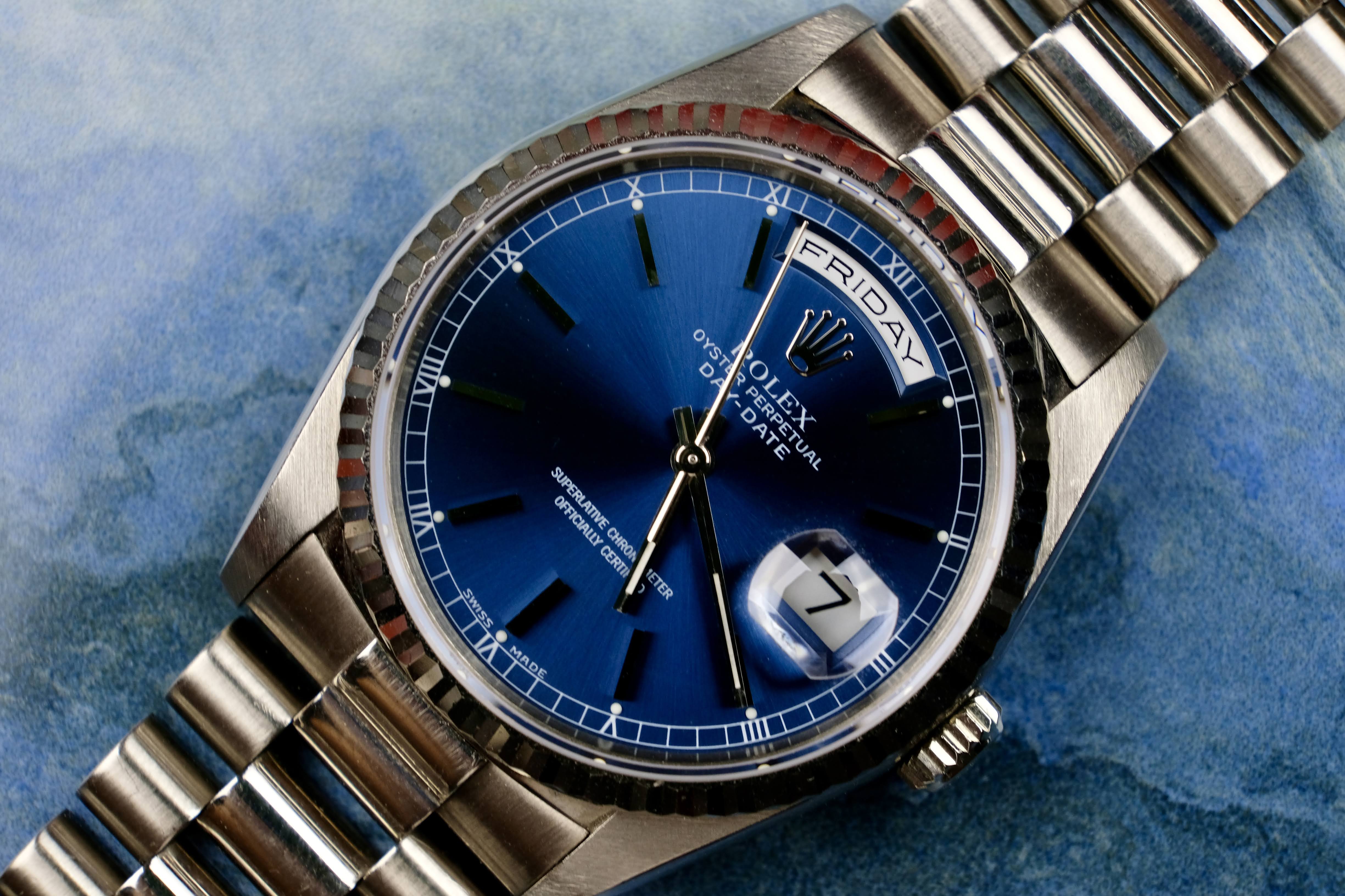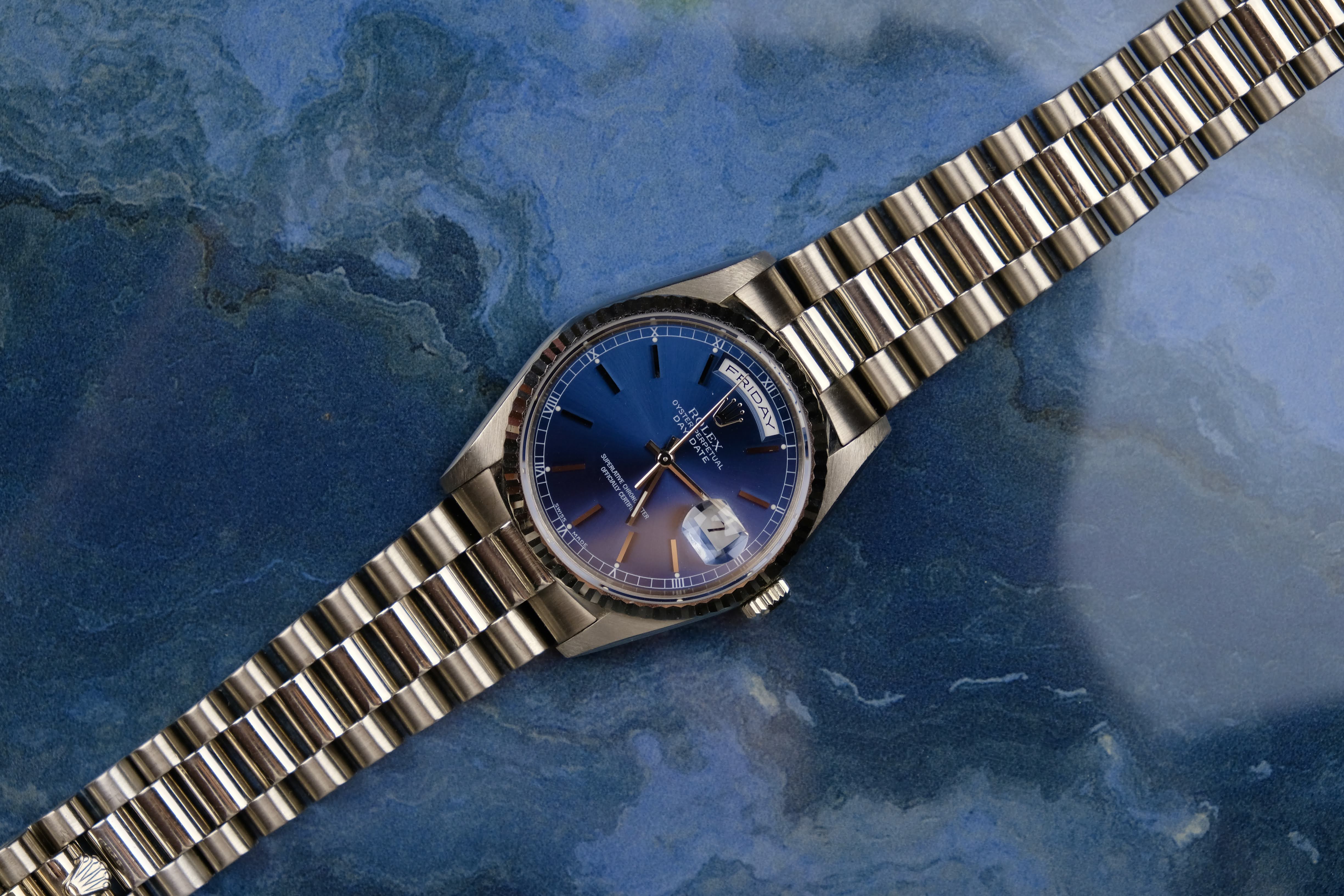 Here we have a nice and sharp double quick 18239 for sale. What I love about this white gold Day Dates is the combination with the deep blue sunburst dial, which gives the watch a very sublime touch of easiness.