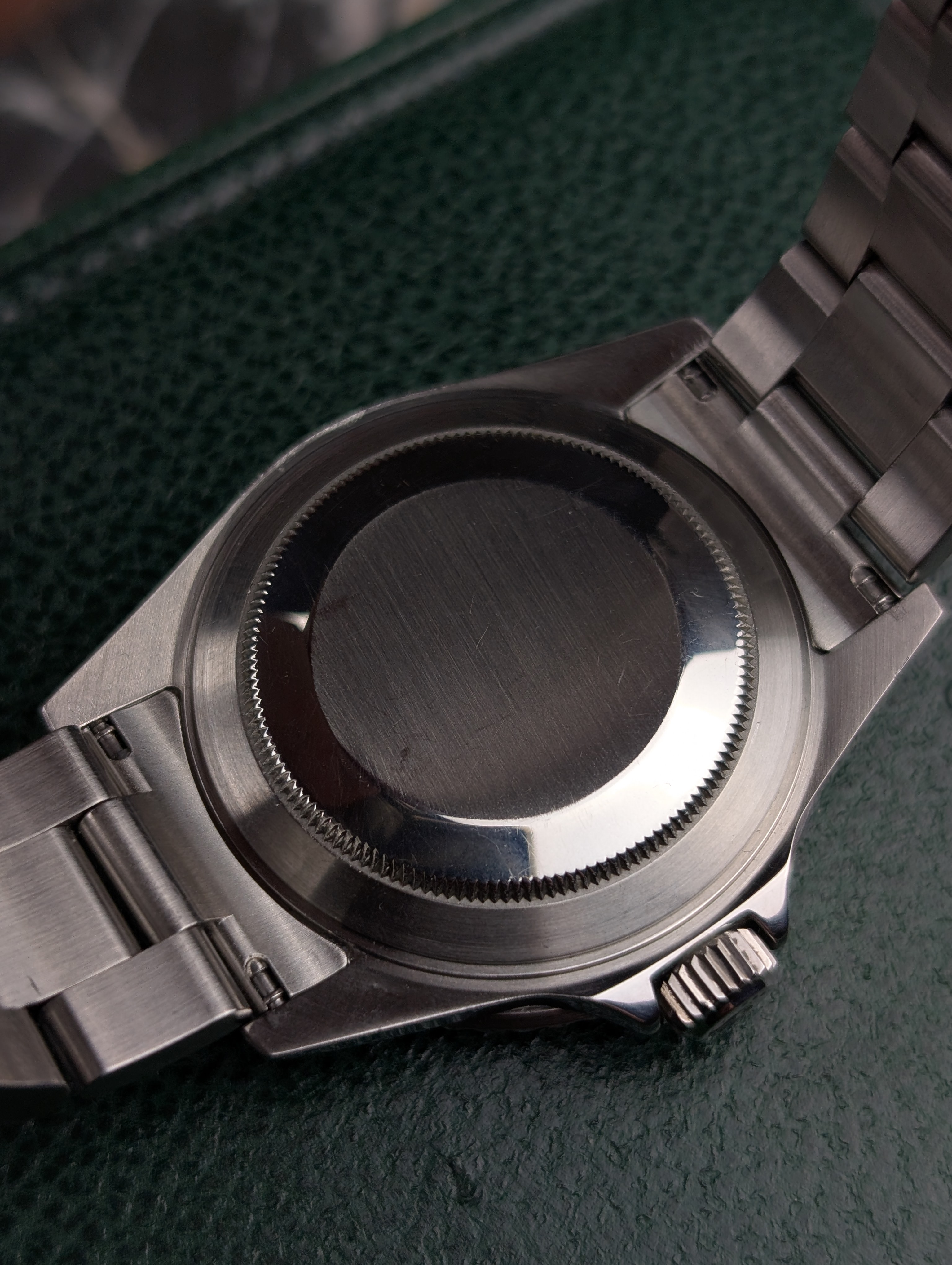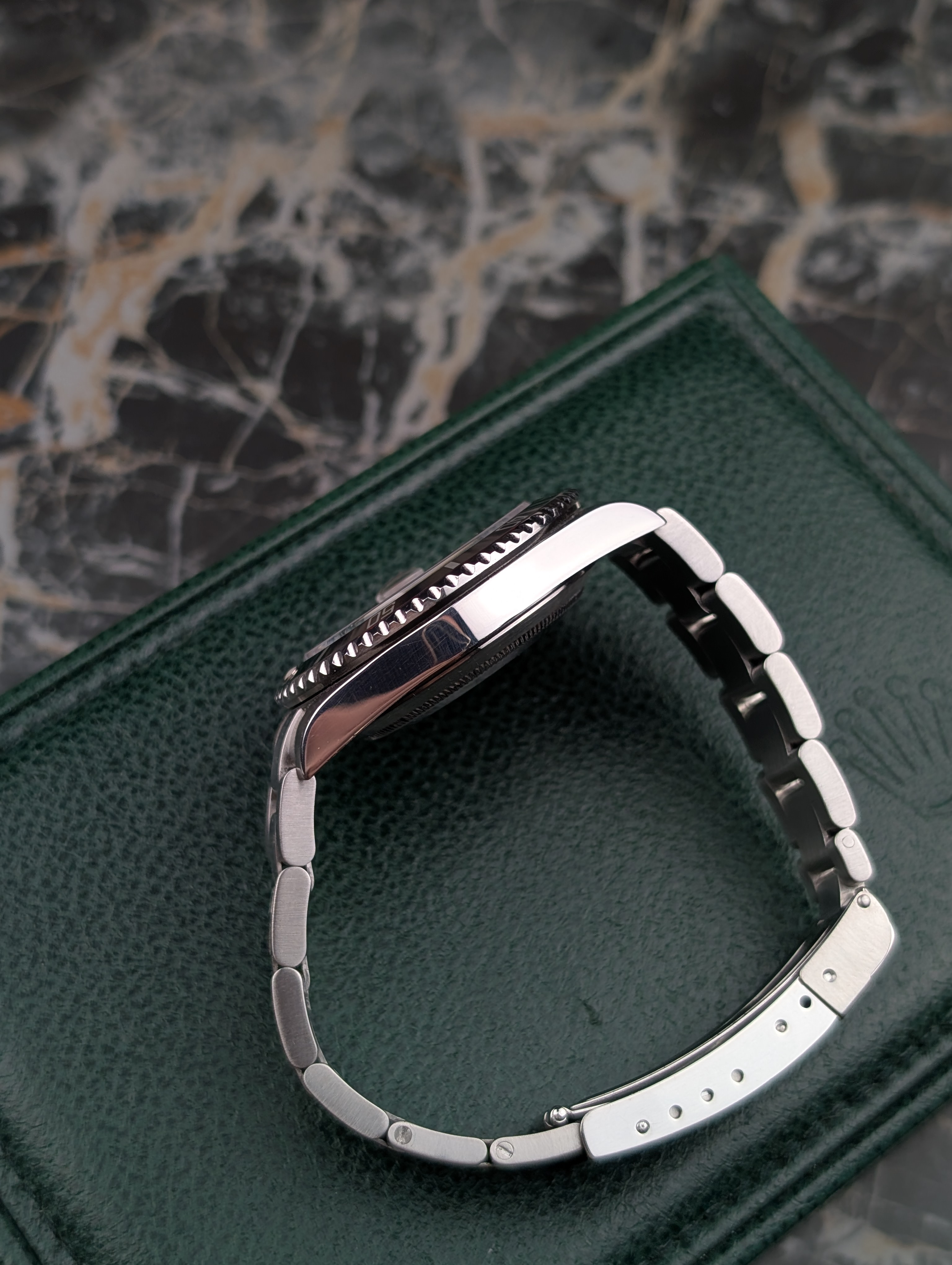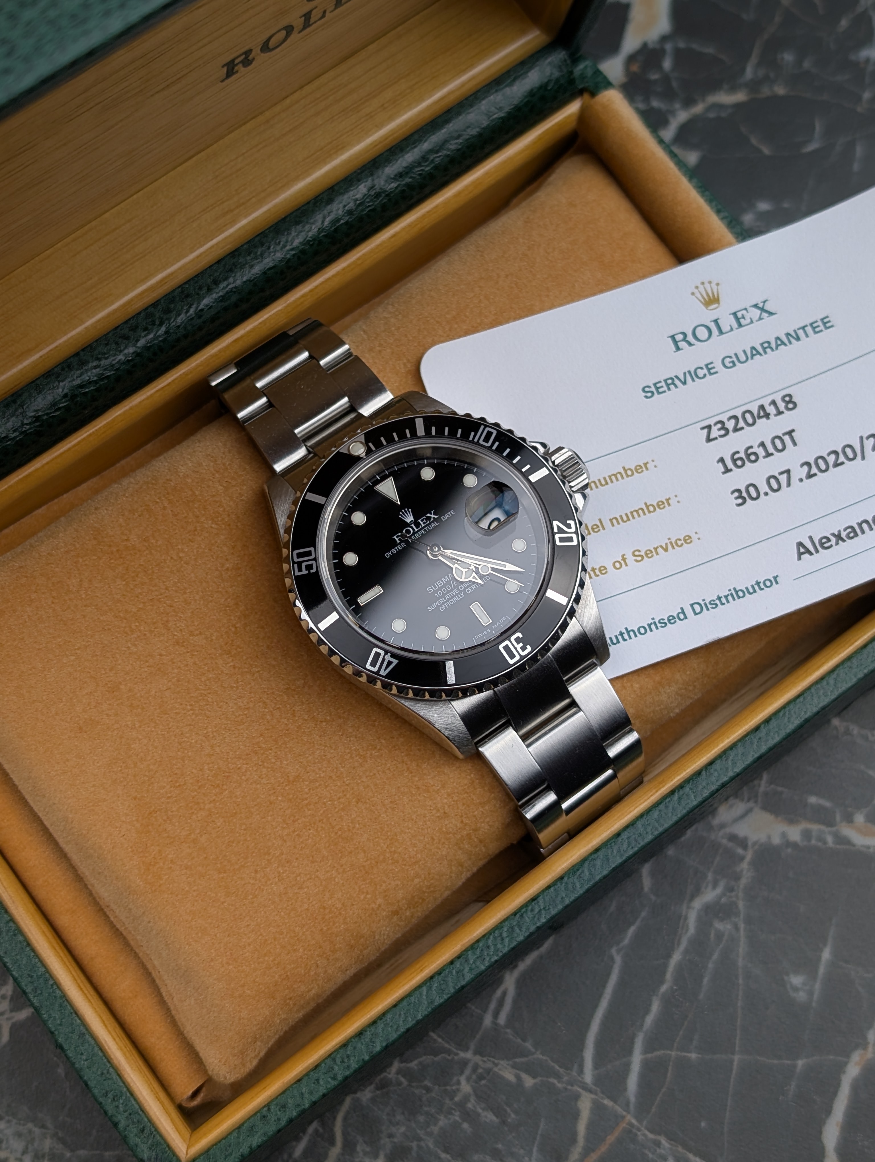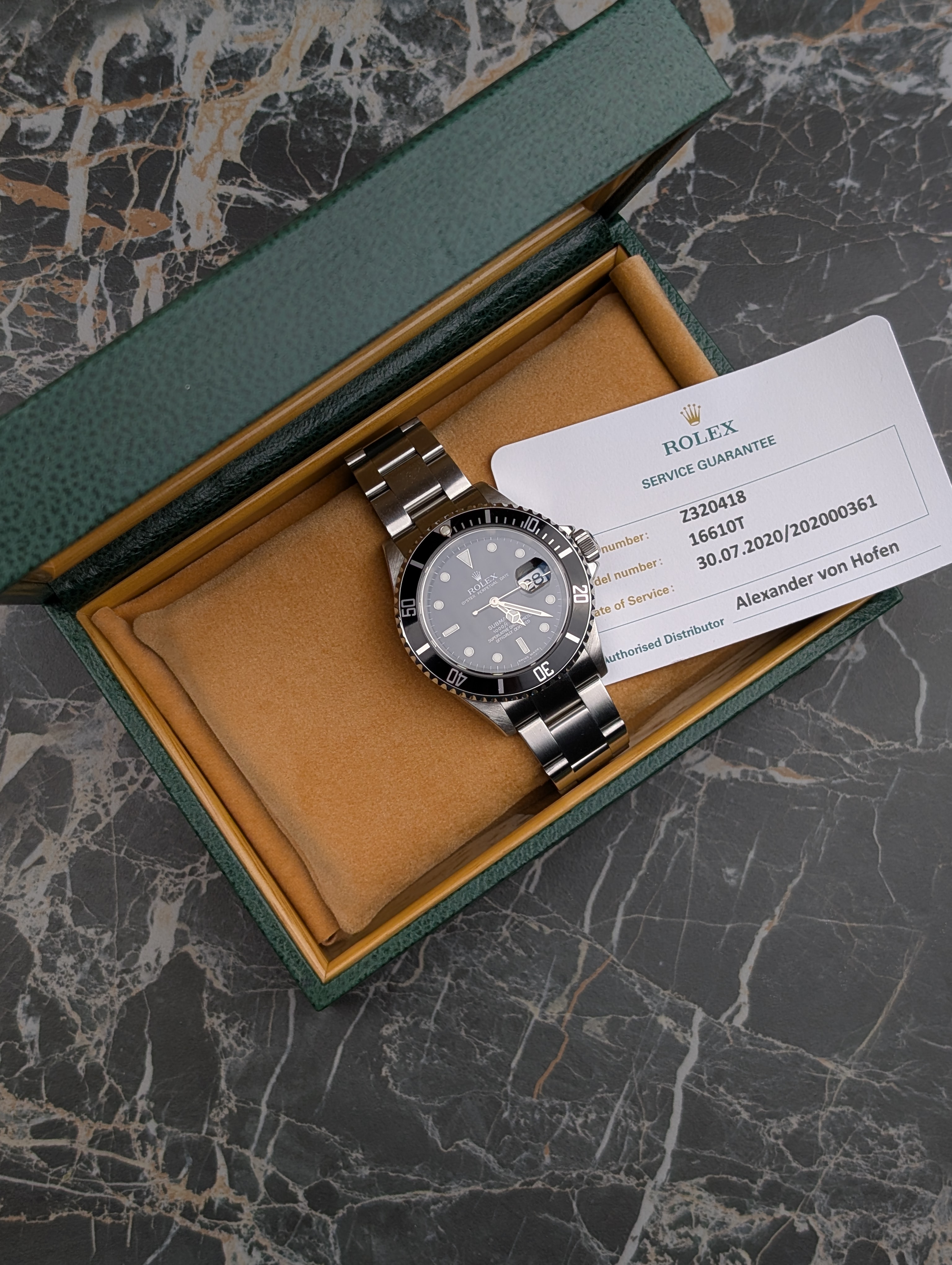 The watch is in excellent condition. The case has sharp edges, the bezel has a few scratches, the sapphire crystal is clear, and the dial and hands look flawless. The bracelet has little to no stretch and fits snugly on an 18.5 cm wrist. The clasp closes securely and reliably. You’ll receive the watch in its original box with the 2020 service card, as well as an additional dealer card from 05/2025. Technically, the watch runs perfectly and does not require servicing.